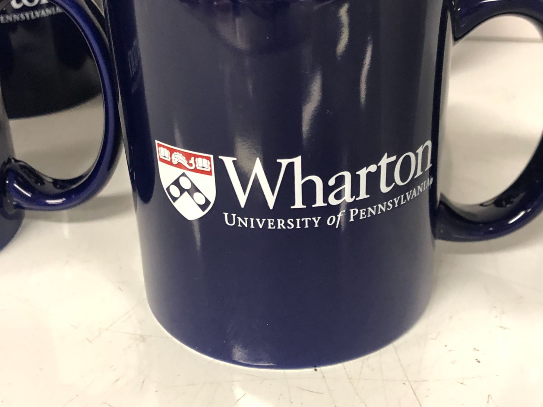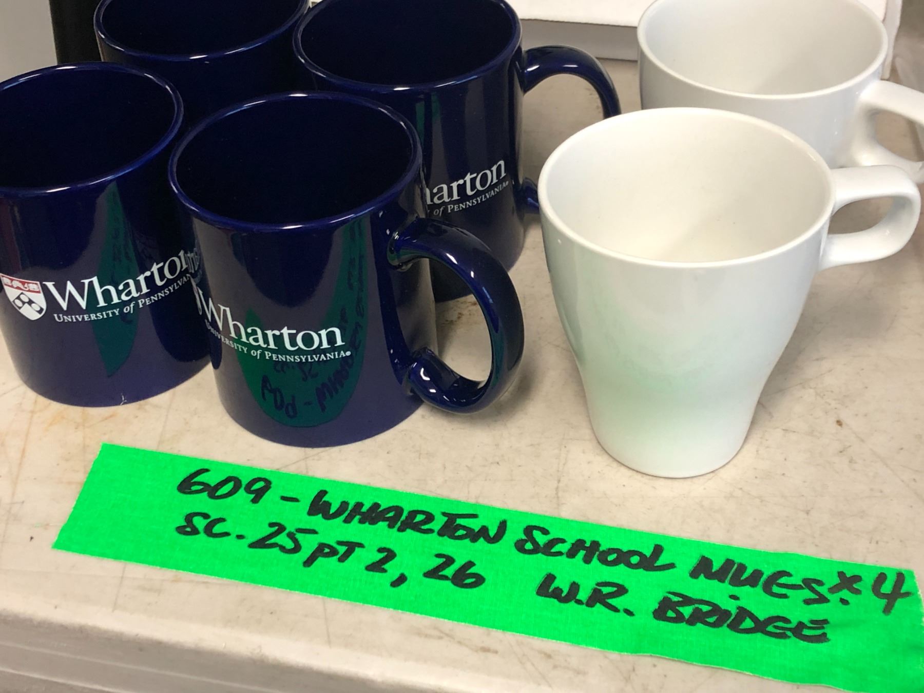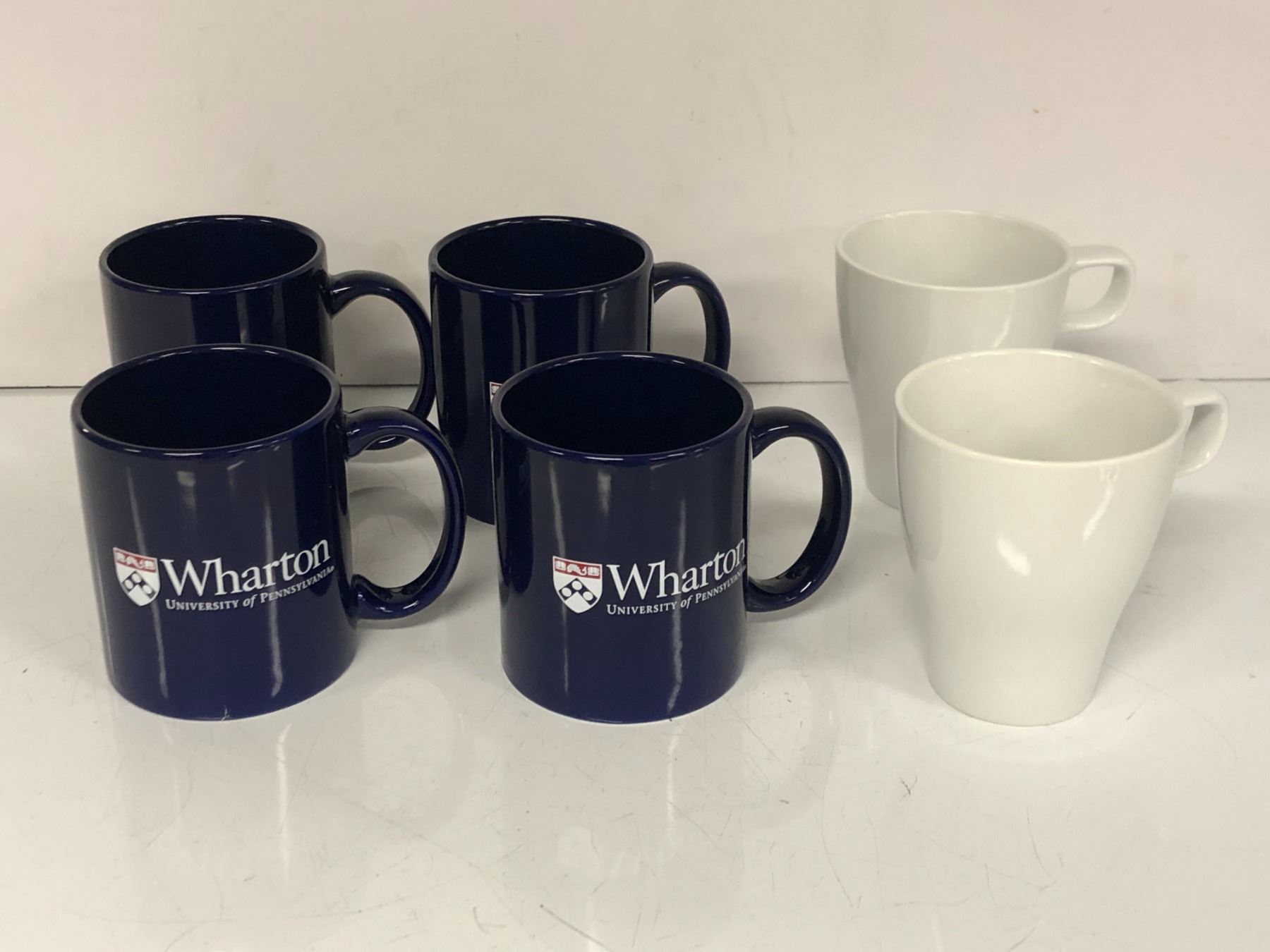 Group of 4 wharton university of pennsylvania coffee mugs & 2 "Hero" (Girl) white coffee mugs ep 609 sc. 25 pt.2, 26 (From the superhero show)
