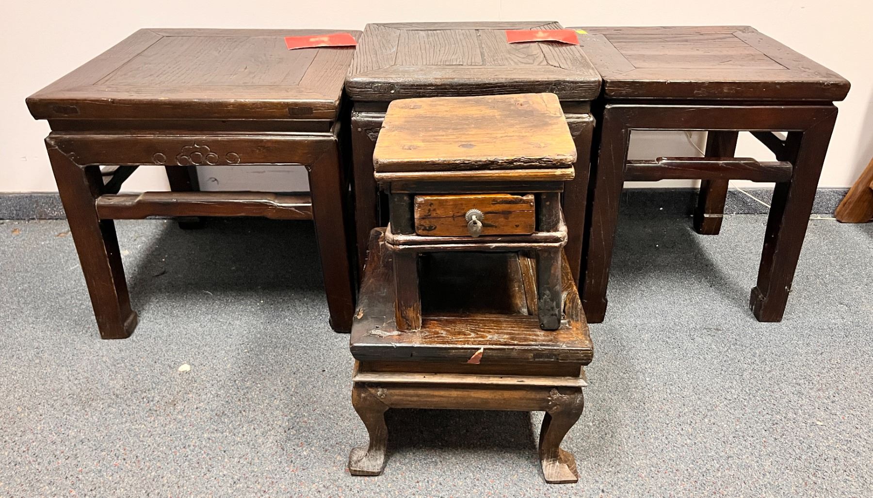 Group of 5 Chinese hand carved Ming style wooden stools (one w/ drawer)