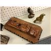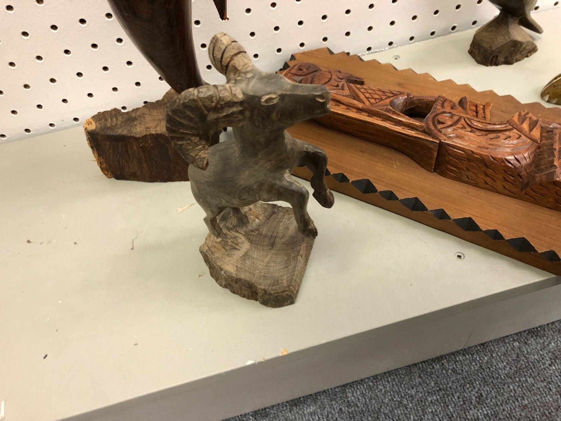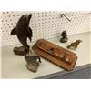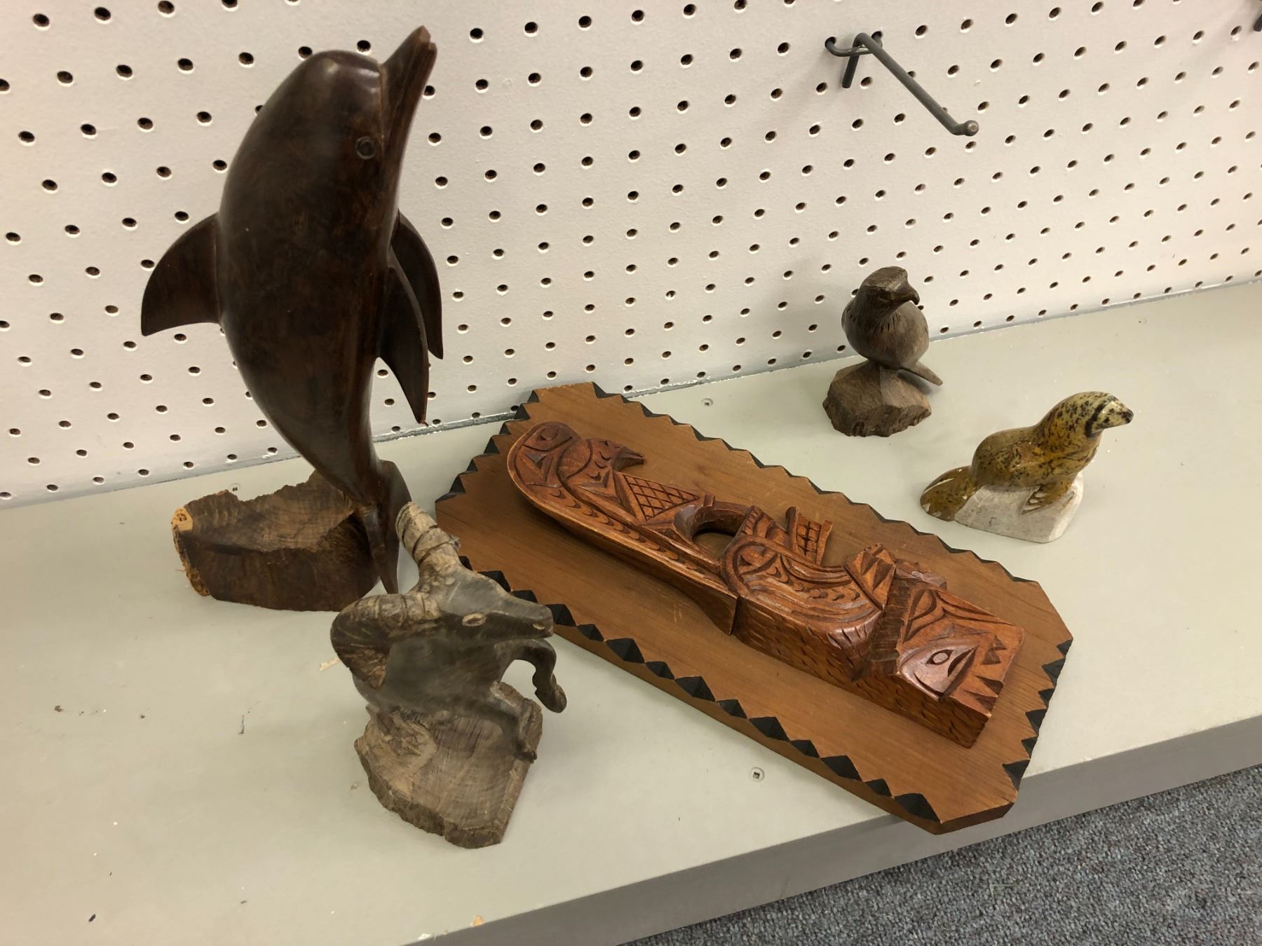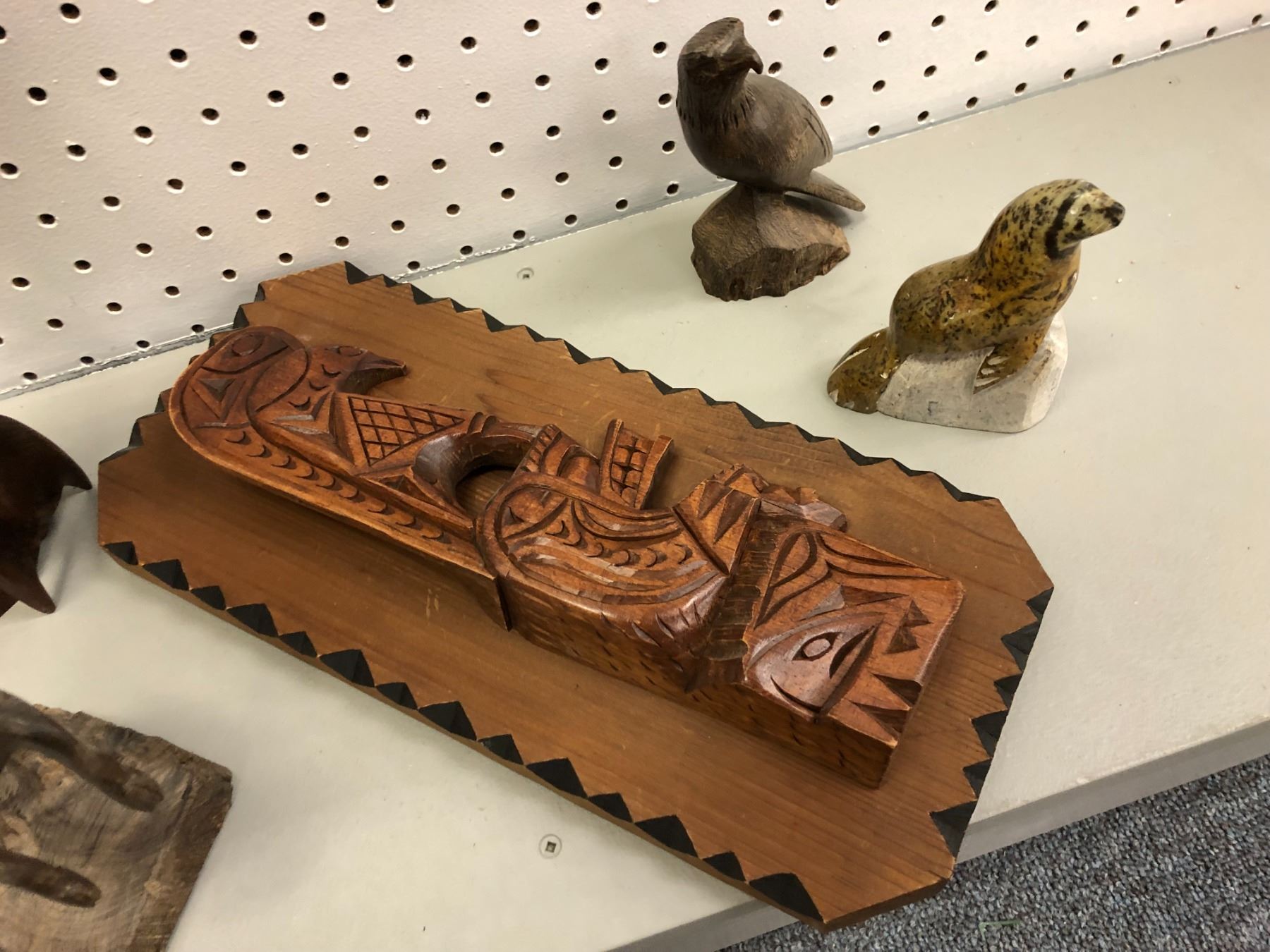 Group of 5 assorted decorative carvings wood & soap stone - includes N. Joseph carved First Nations plaque/ Inuit signed soap stone carving etc.