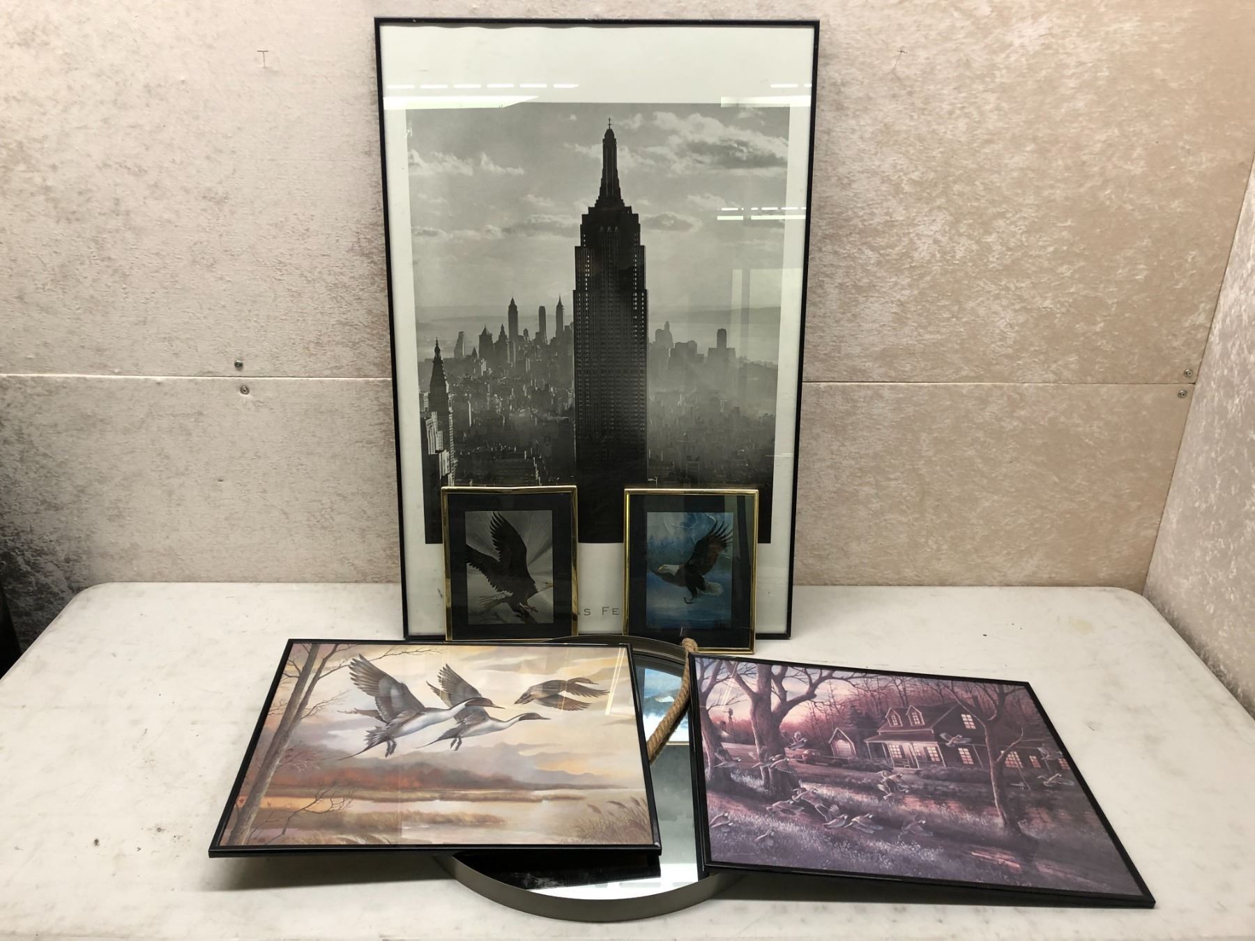 Group of 5 assorted framed decorative pictures & round hanging wall mirror
