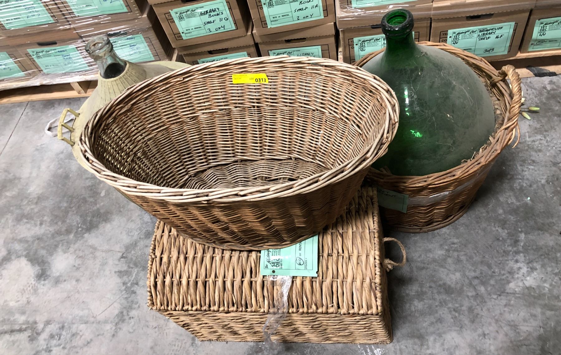 Group of 5 - includes wicker baskets / wicker chest / demijohn bottle wicker basket etc