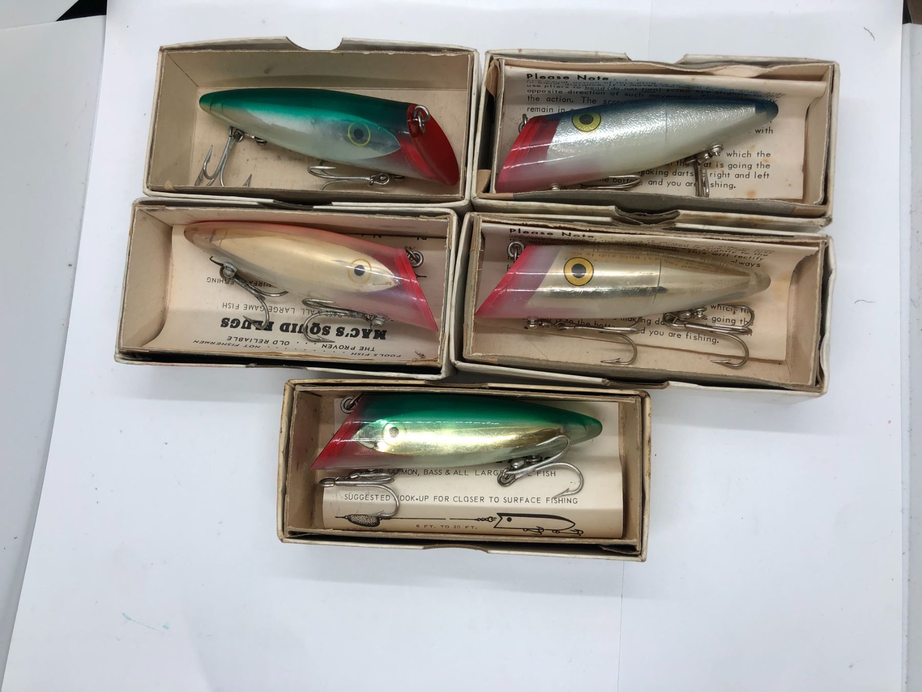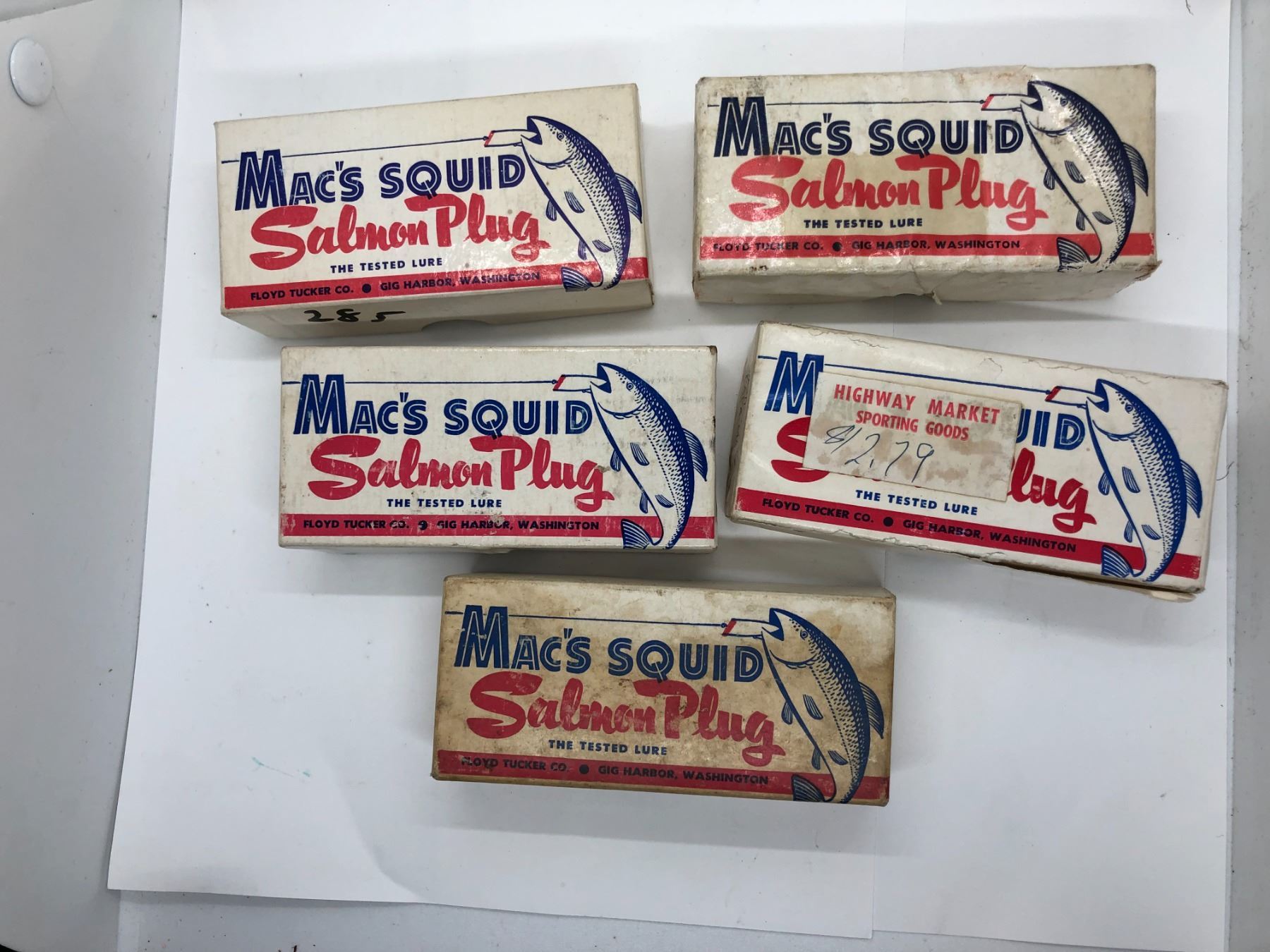 Group of 5 vintage Mac's Squid assorted salmon plugs w/ original boxes