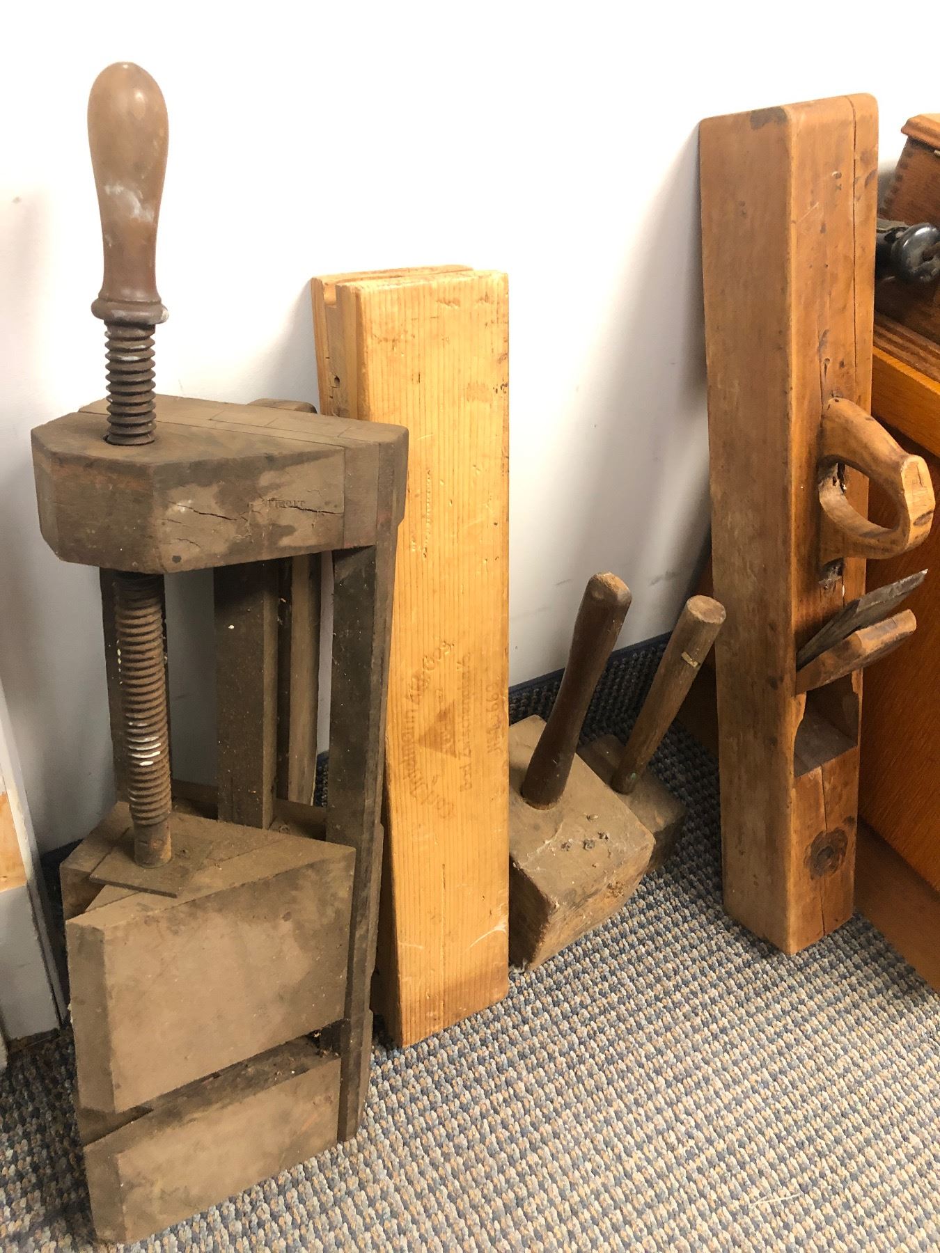 Group of 5 vintage estate items - includes wood miter jack / 2 wooden mallets / wood working cutting board etc