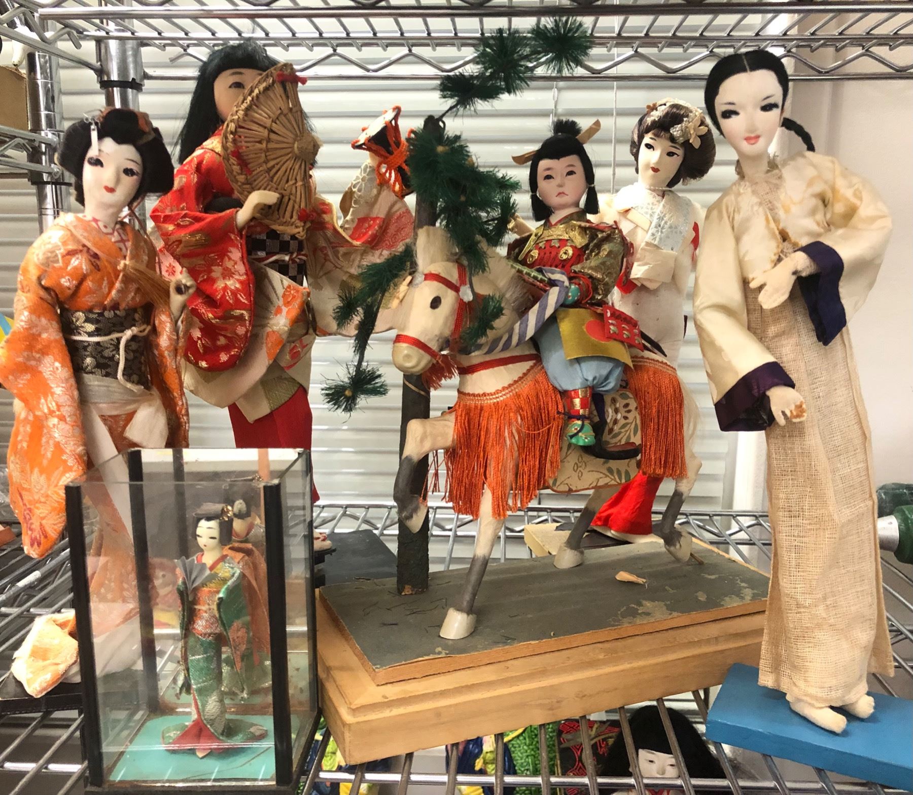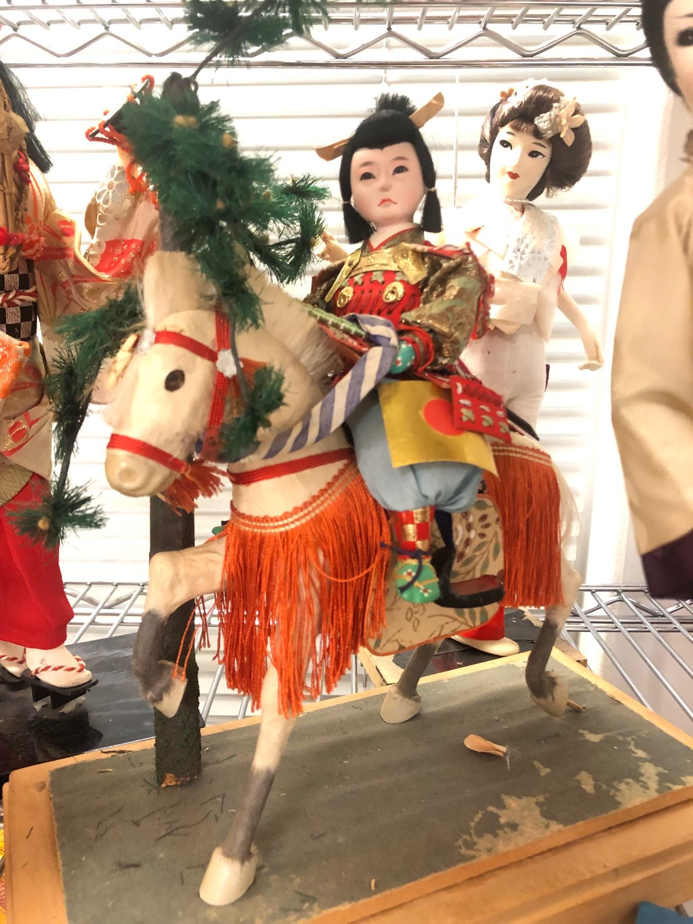 Group of 6 Japanese oriental dolls - includes Samurai doll on horse & Japanese lady
