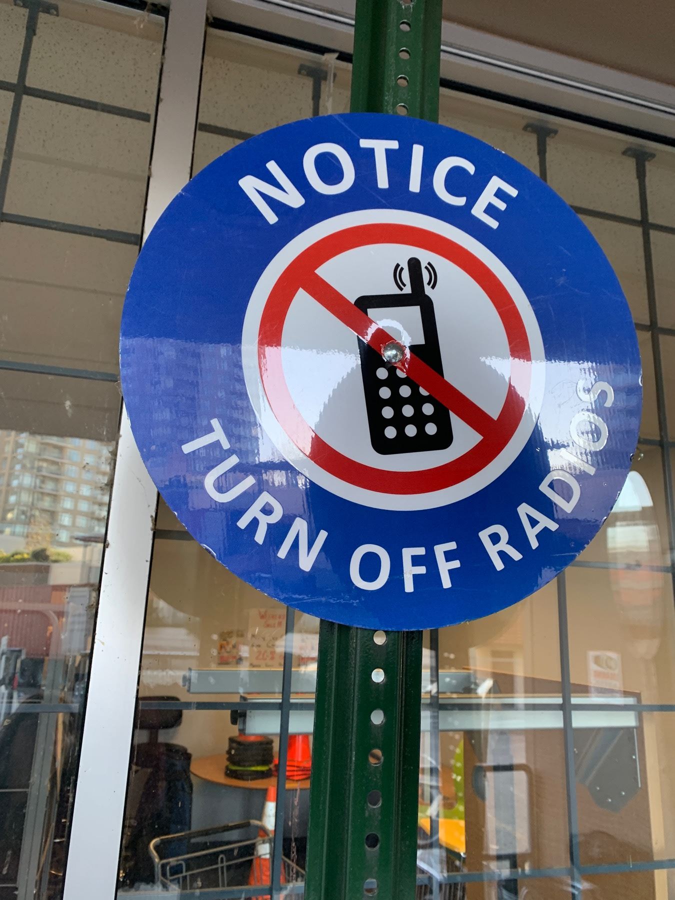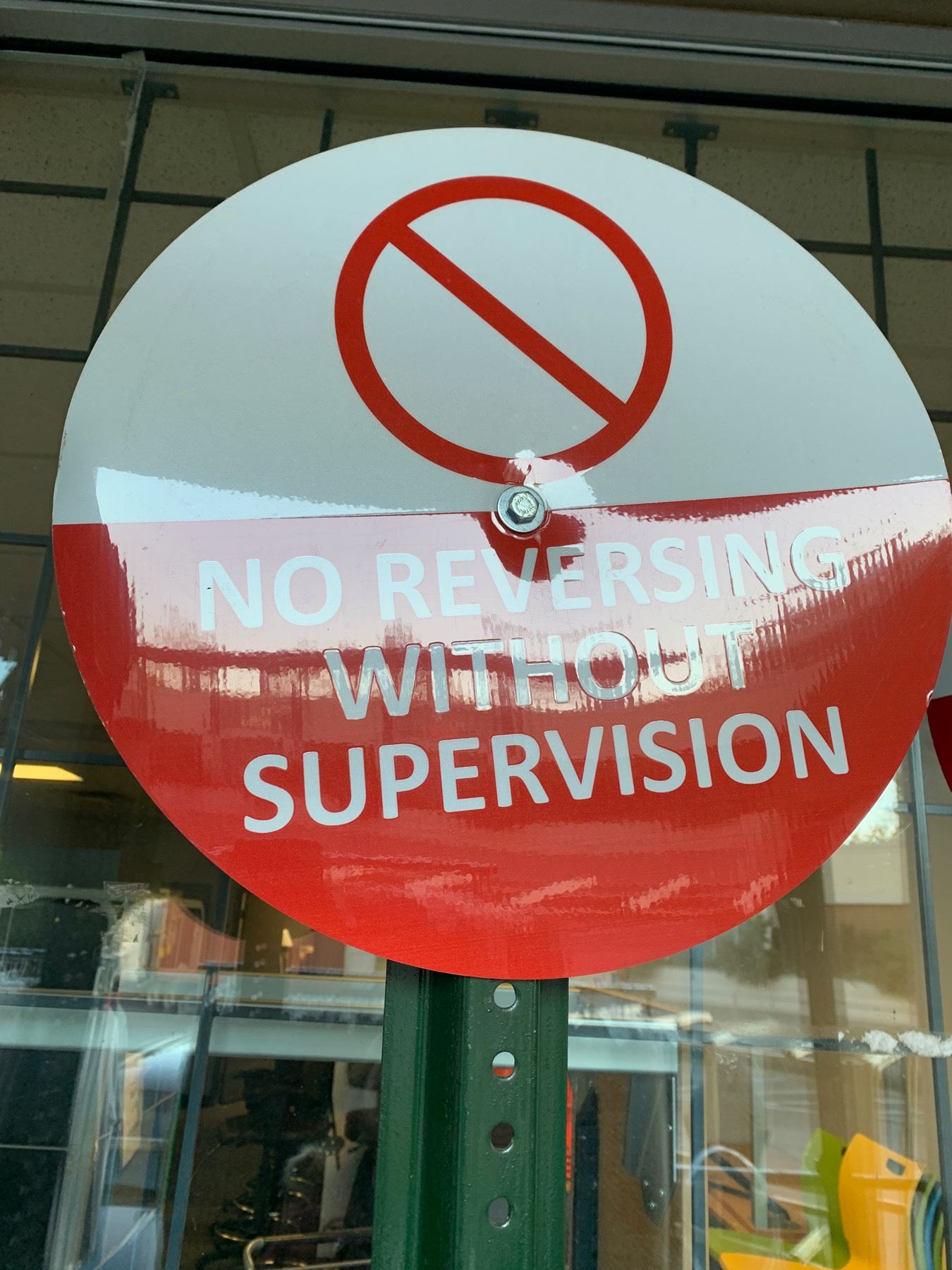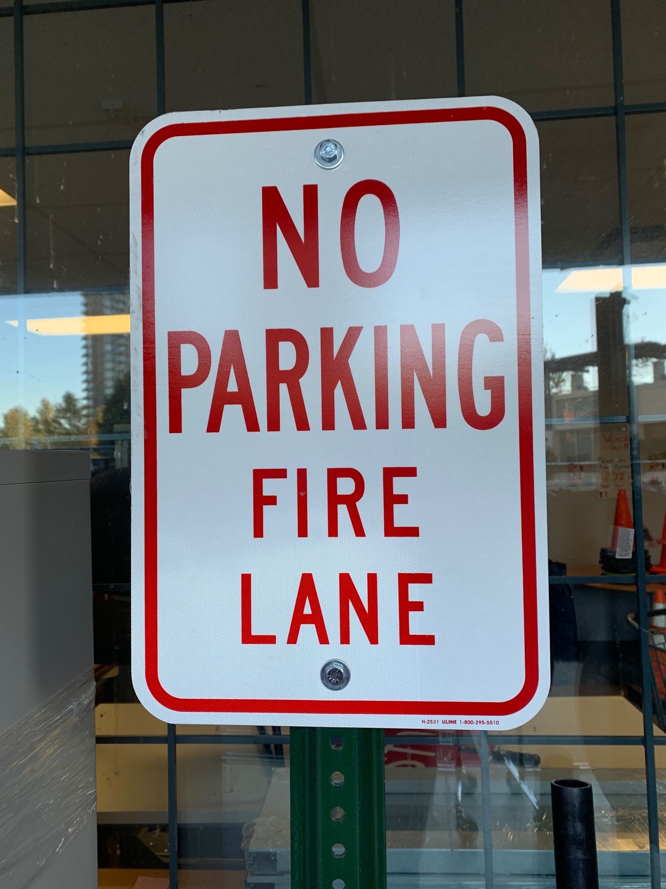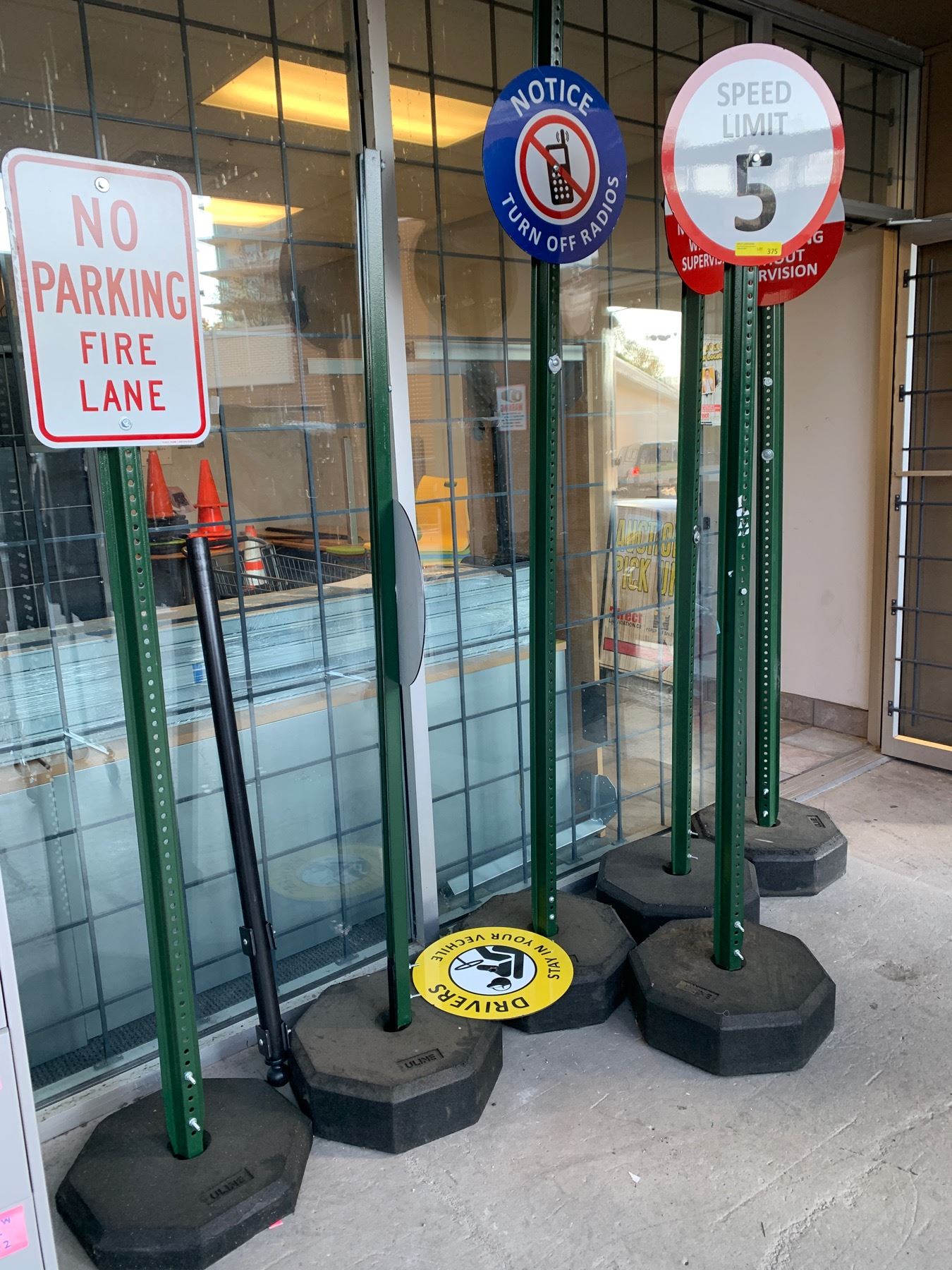 Group of 6 Uline signs - includes No parking fire lane / notice turn off radio / no rivers without supervision / speed limit 5 etc