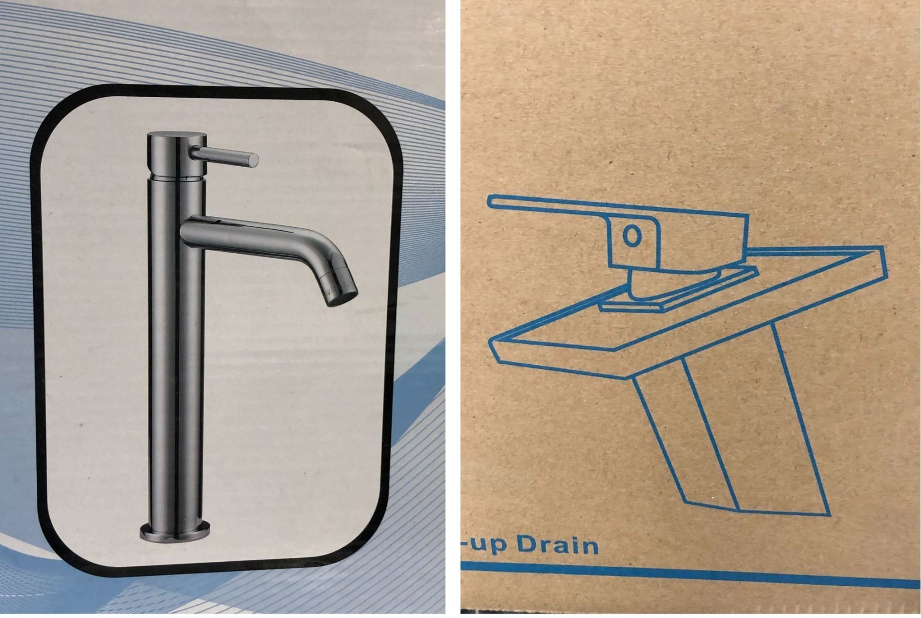 Group of 6 assorted bathroom/lavatory faucets w/pop up drains (new in box)