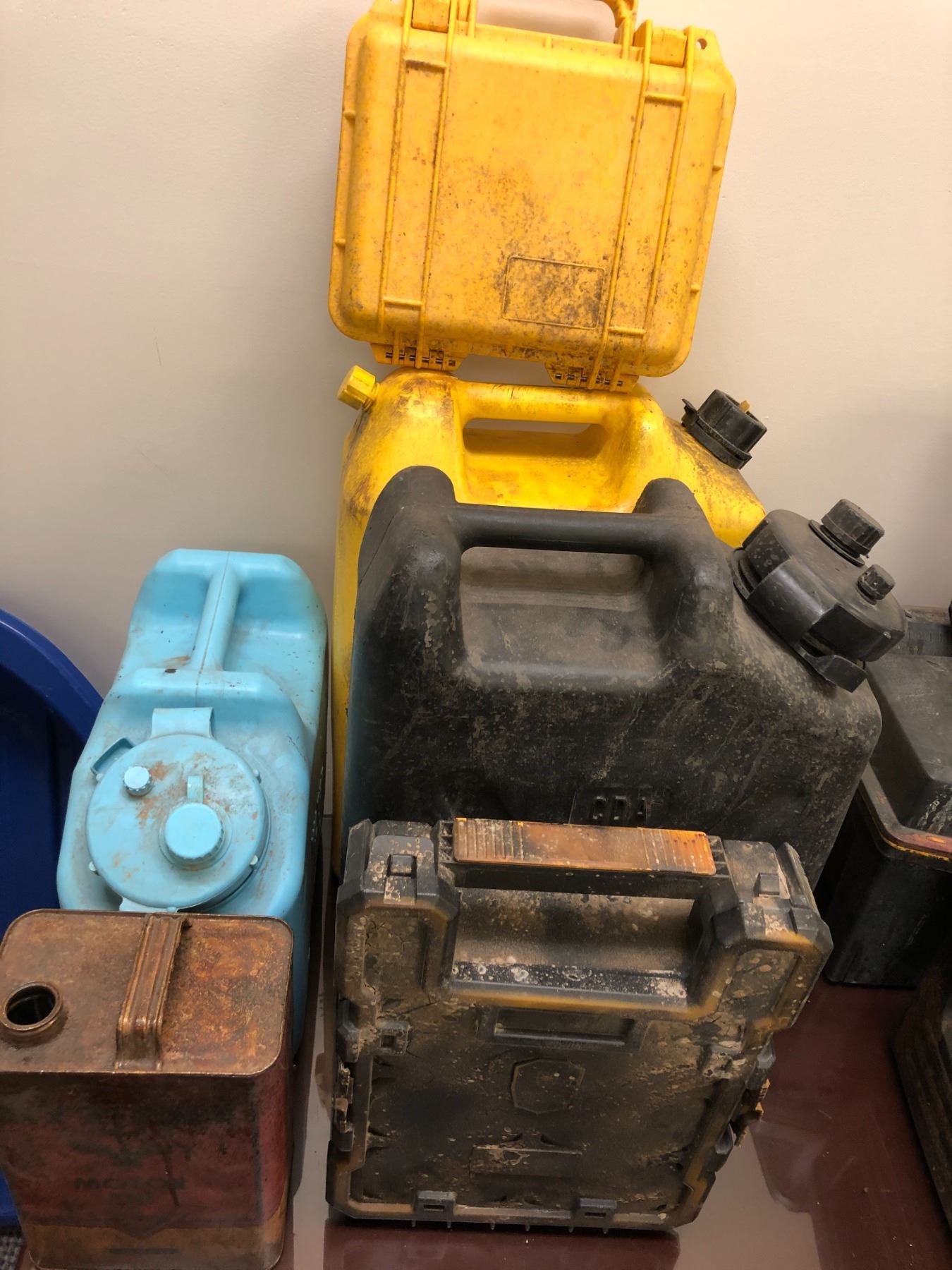 a group of 6 assorted fuel containers/water jugs/assorted utility containers from popular sci-fi series