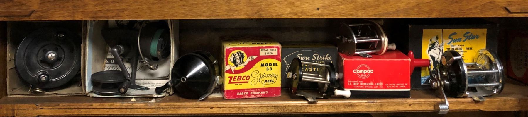 Group of 6 assorted vintage fishing reels w/ original boxes