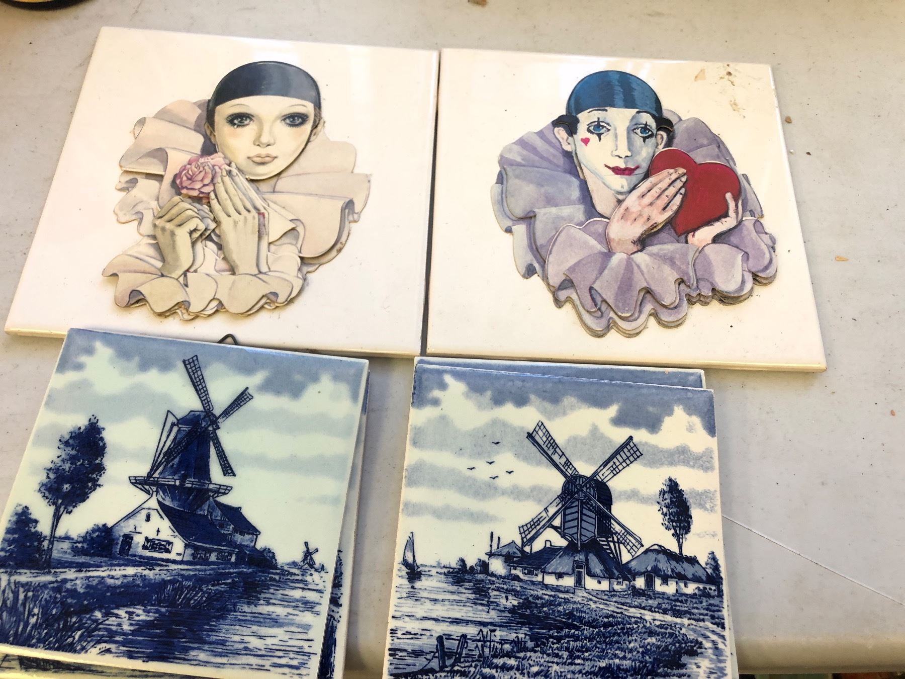 Group of 6 decorative vintage estate wall plaques - includes harlequin clown plaques / windmill ceramic tiles