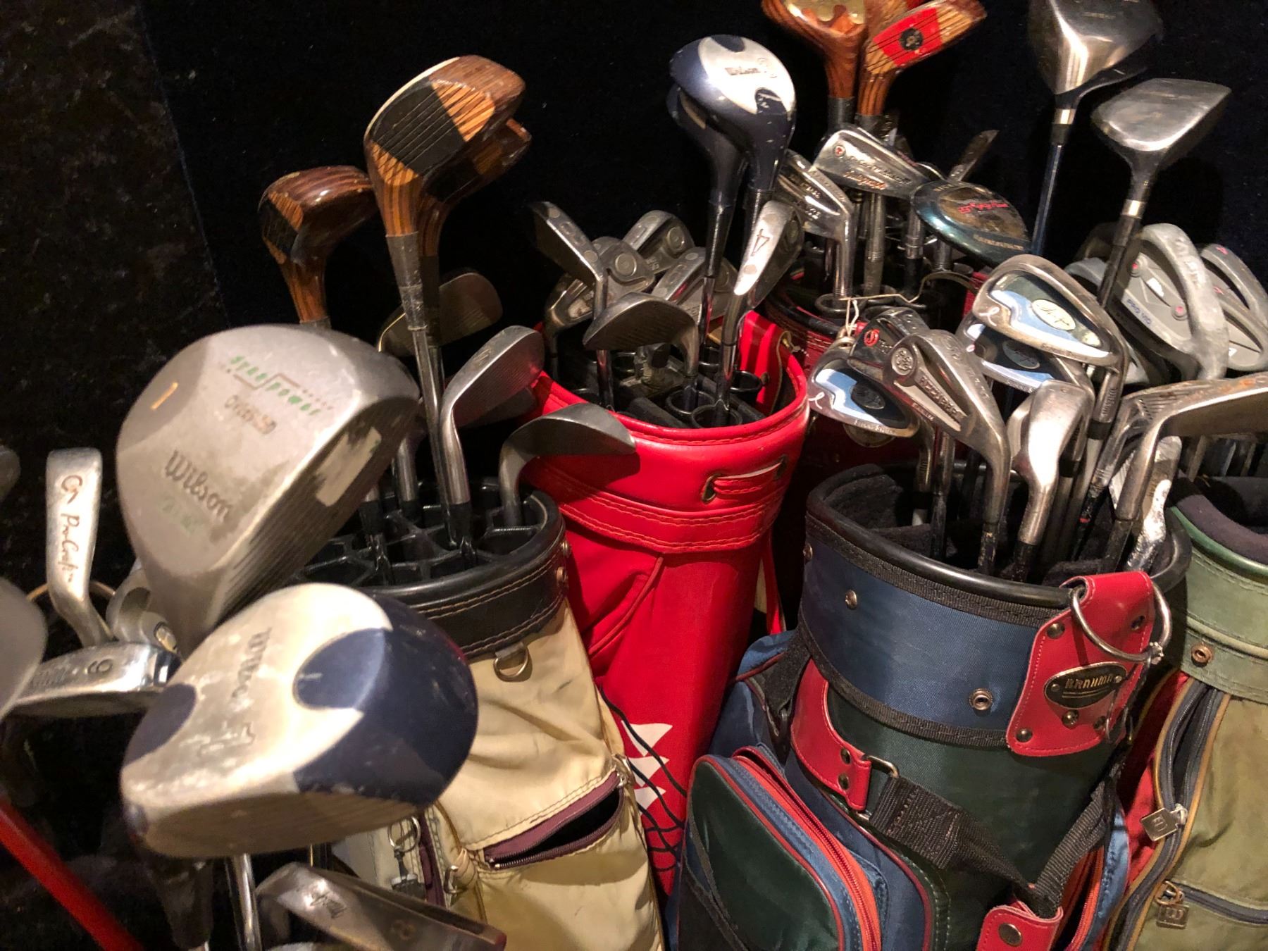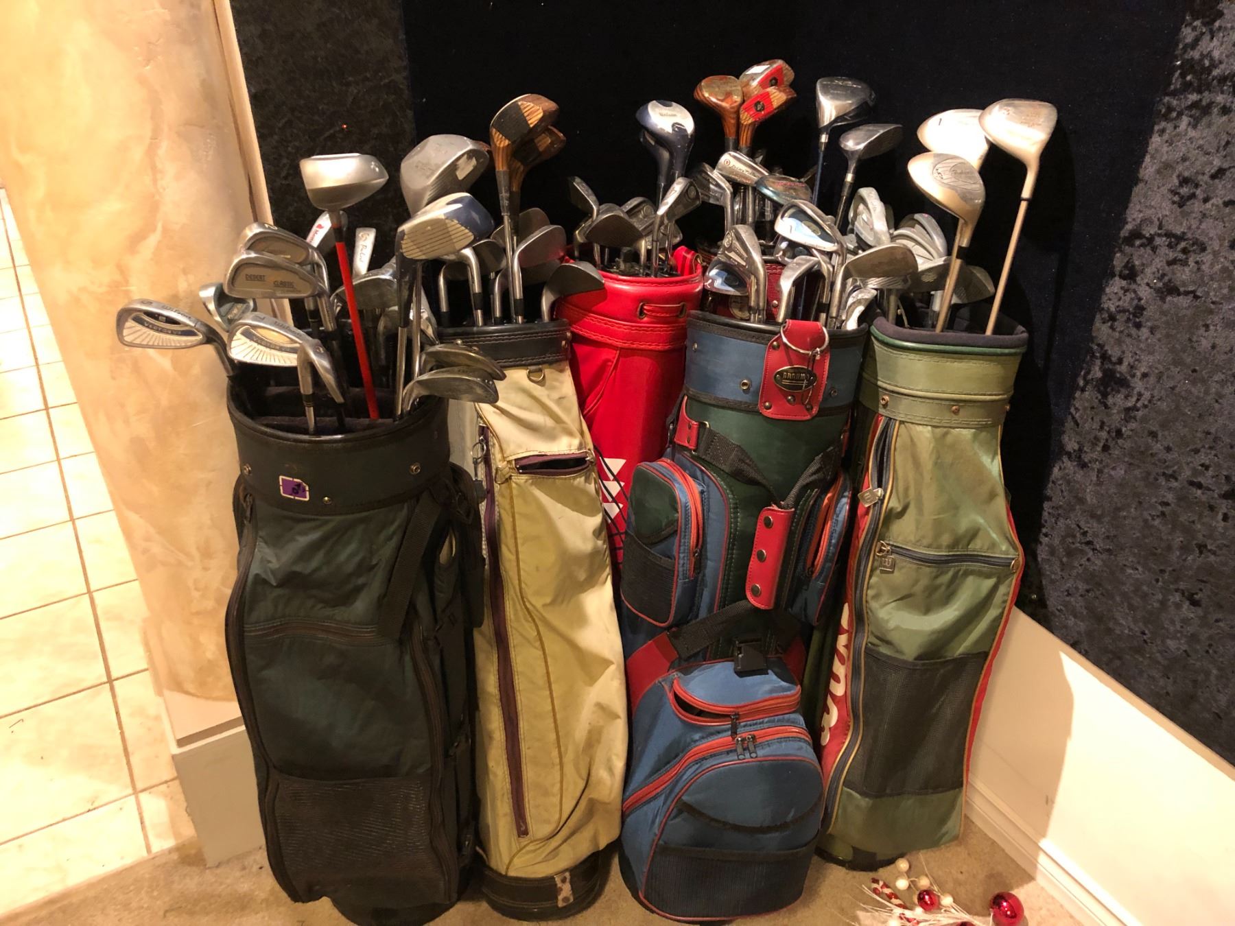 Group of 6 golf bags filled w/assorted golf clubs/drivers & irons