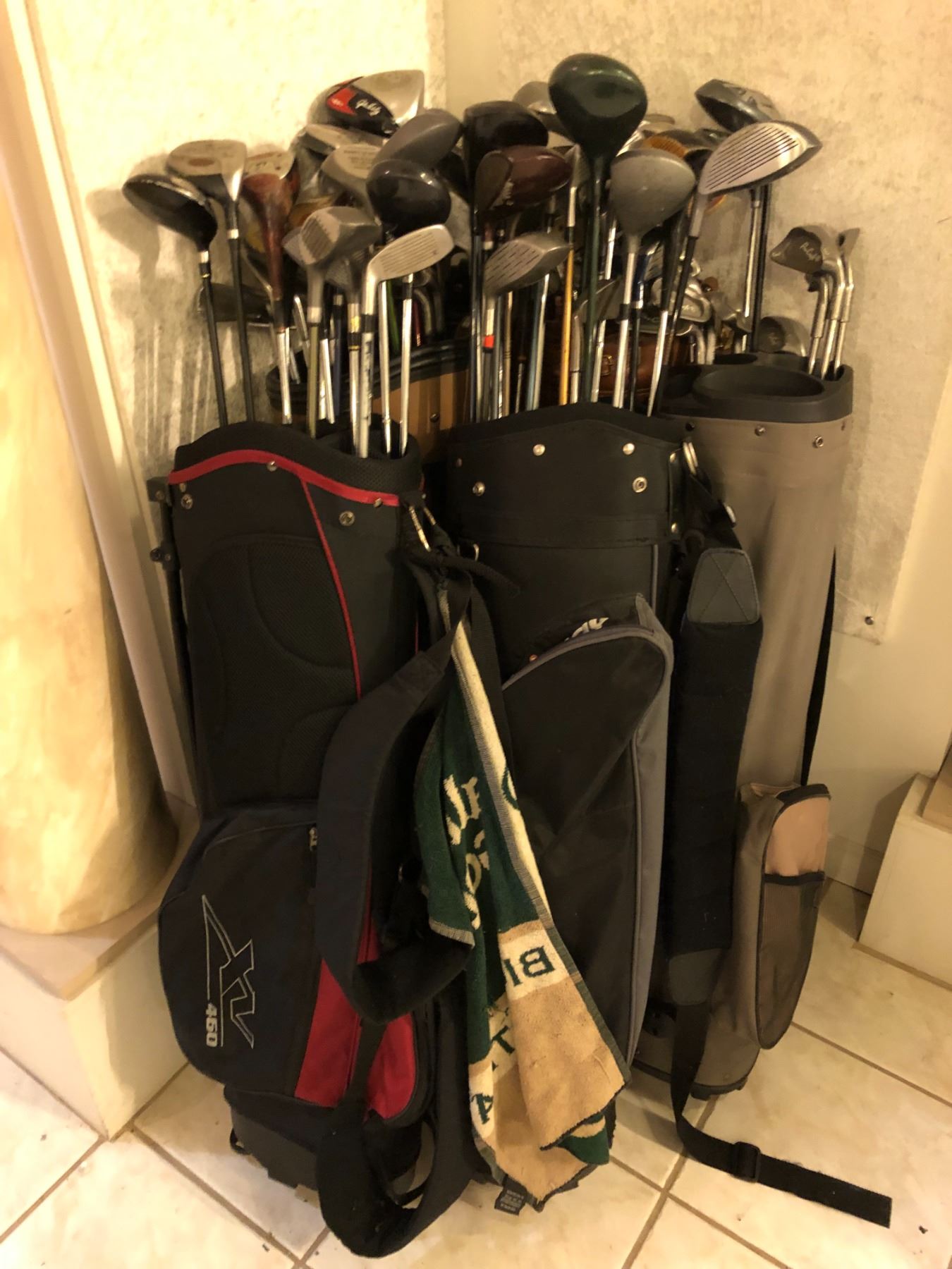 Group of 6 golf bags filled w/assorted golf clubs/drivers & irons