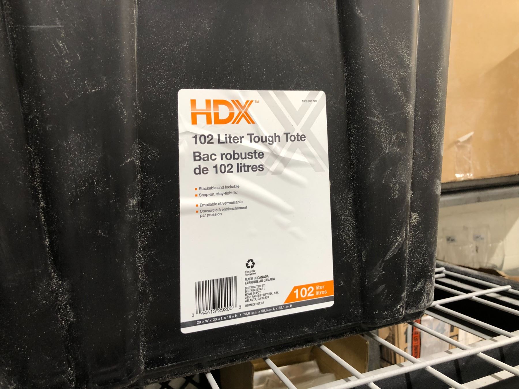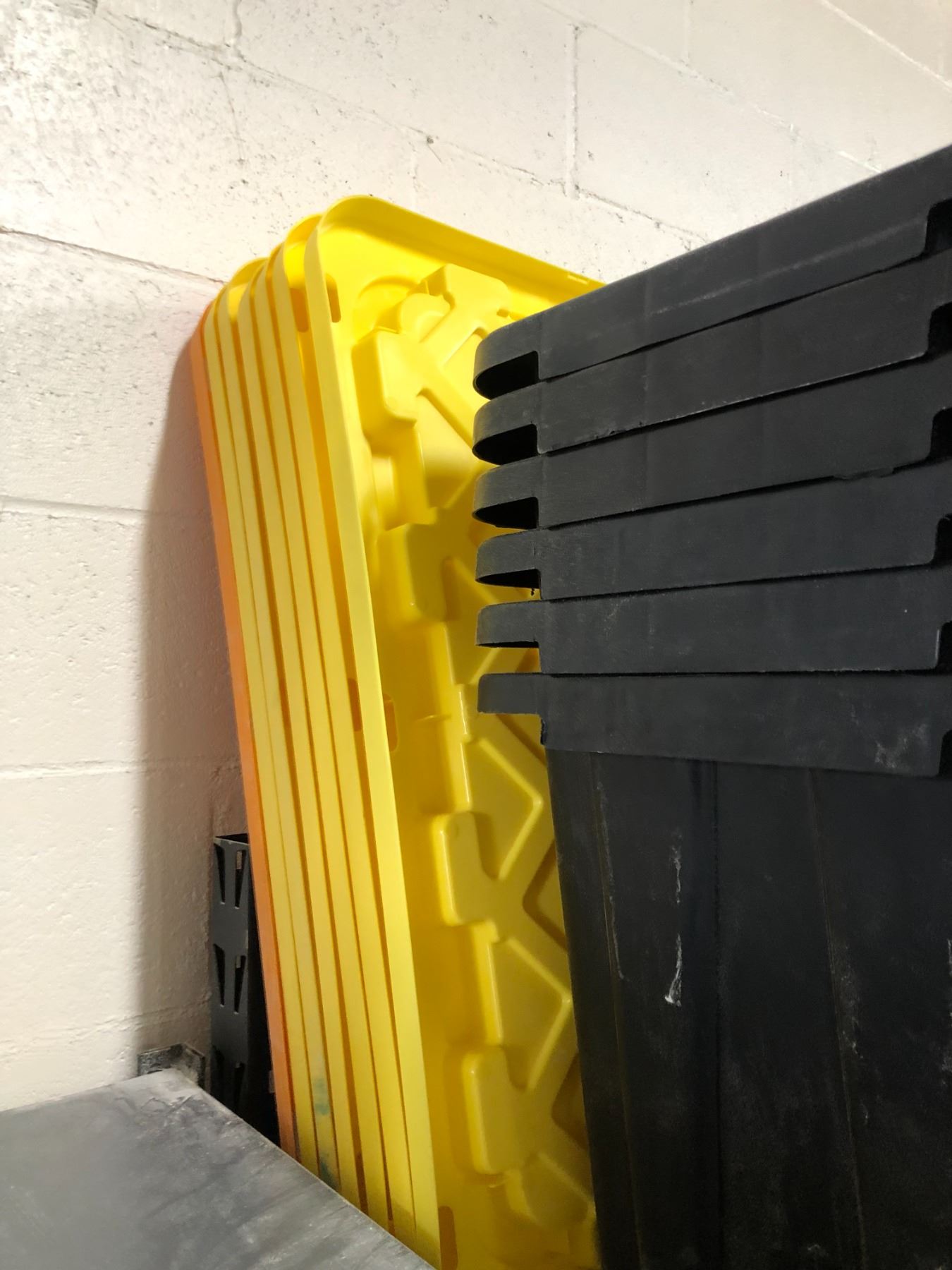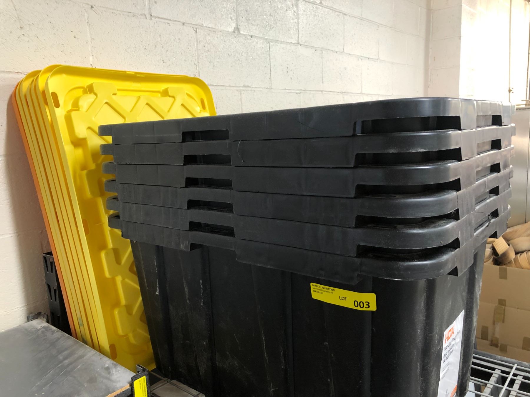 Group of 6 heavy black plastic w/yellow lids 102 litre tough totes