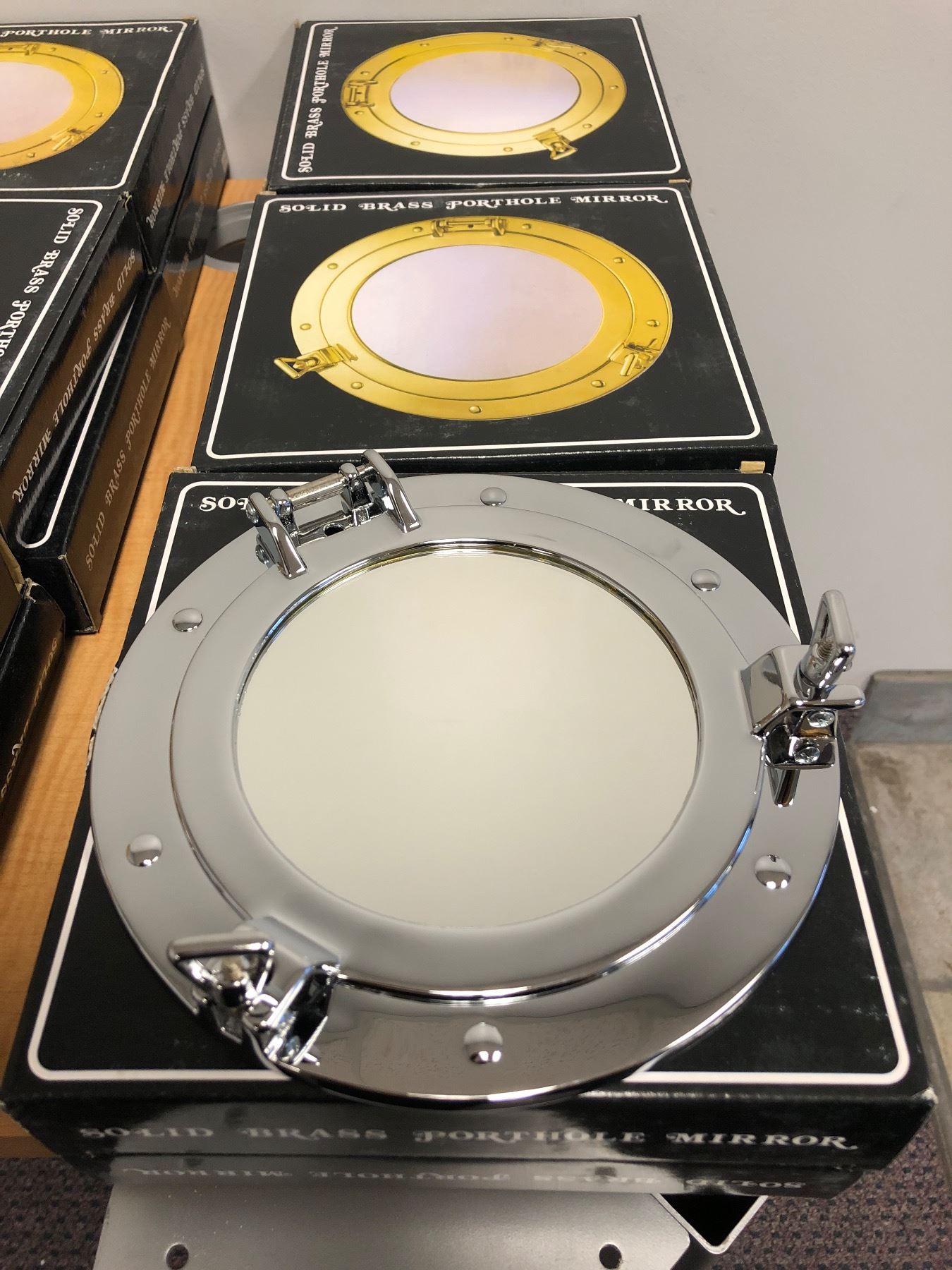 Group of 6 new antique reproduction solid porthole mirrors (new in boxes)
