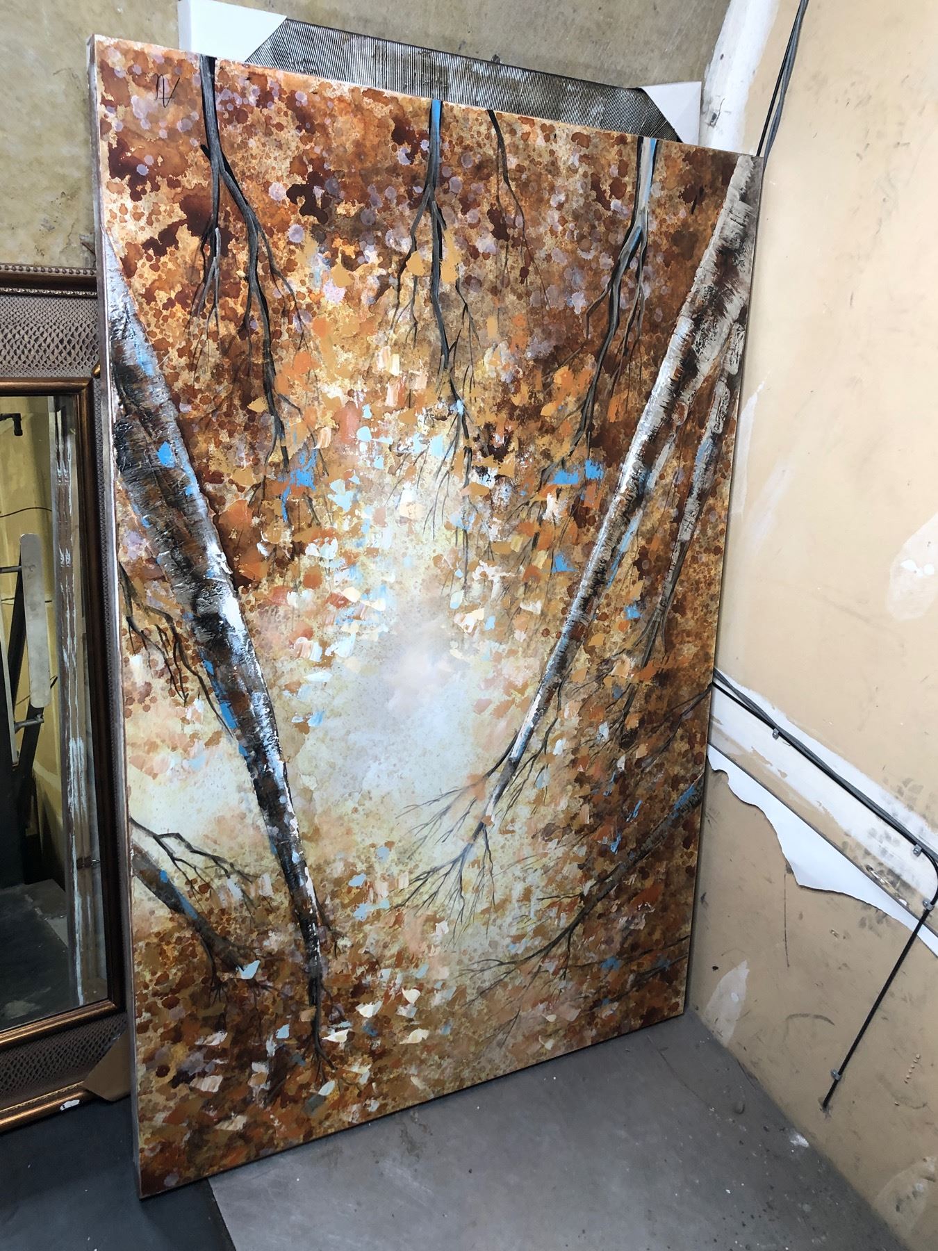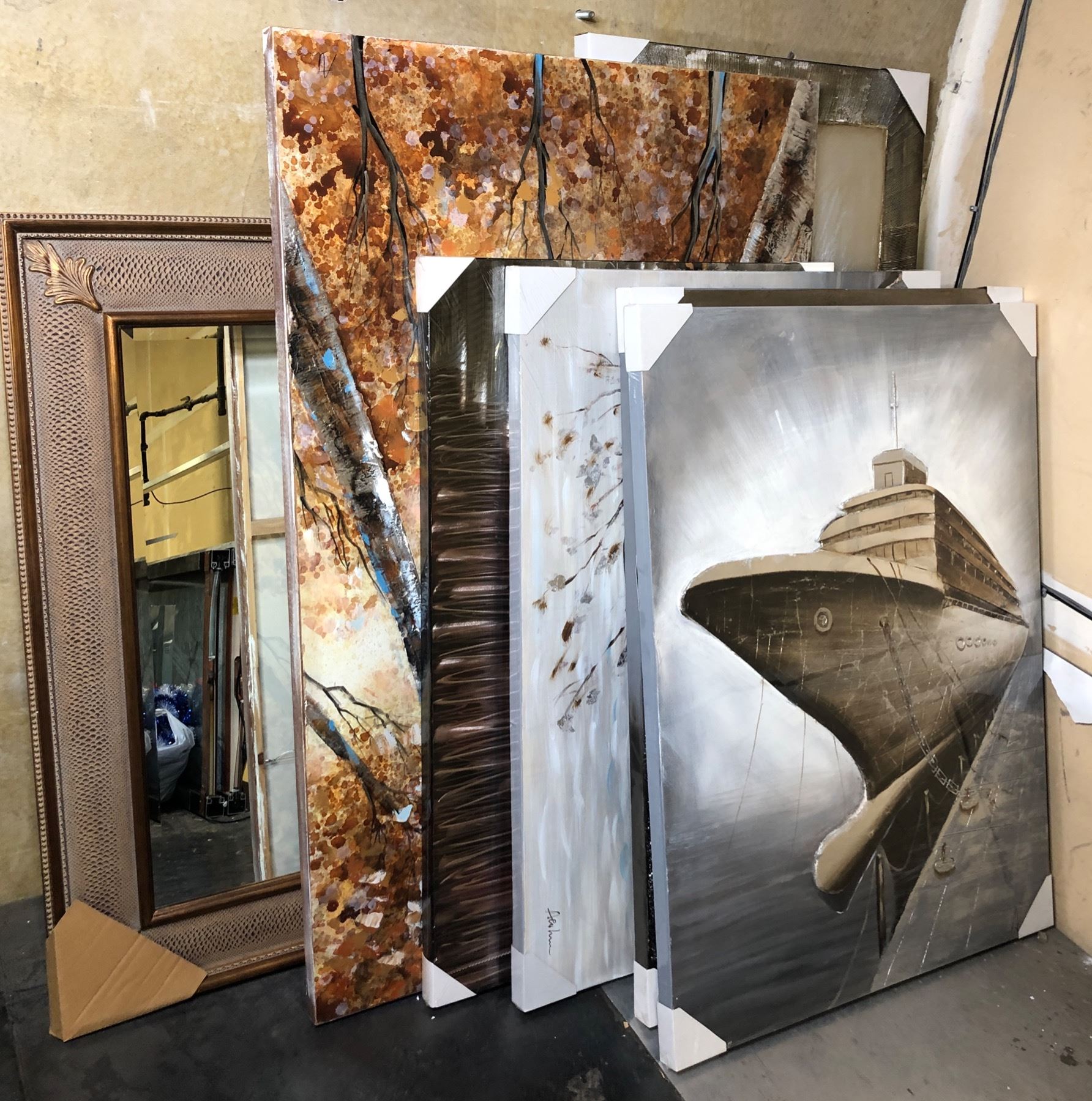 Group of 7 NEW assorted decorative paintings & 1 framed decorative wall mirror