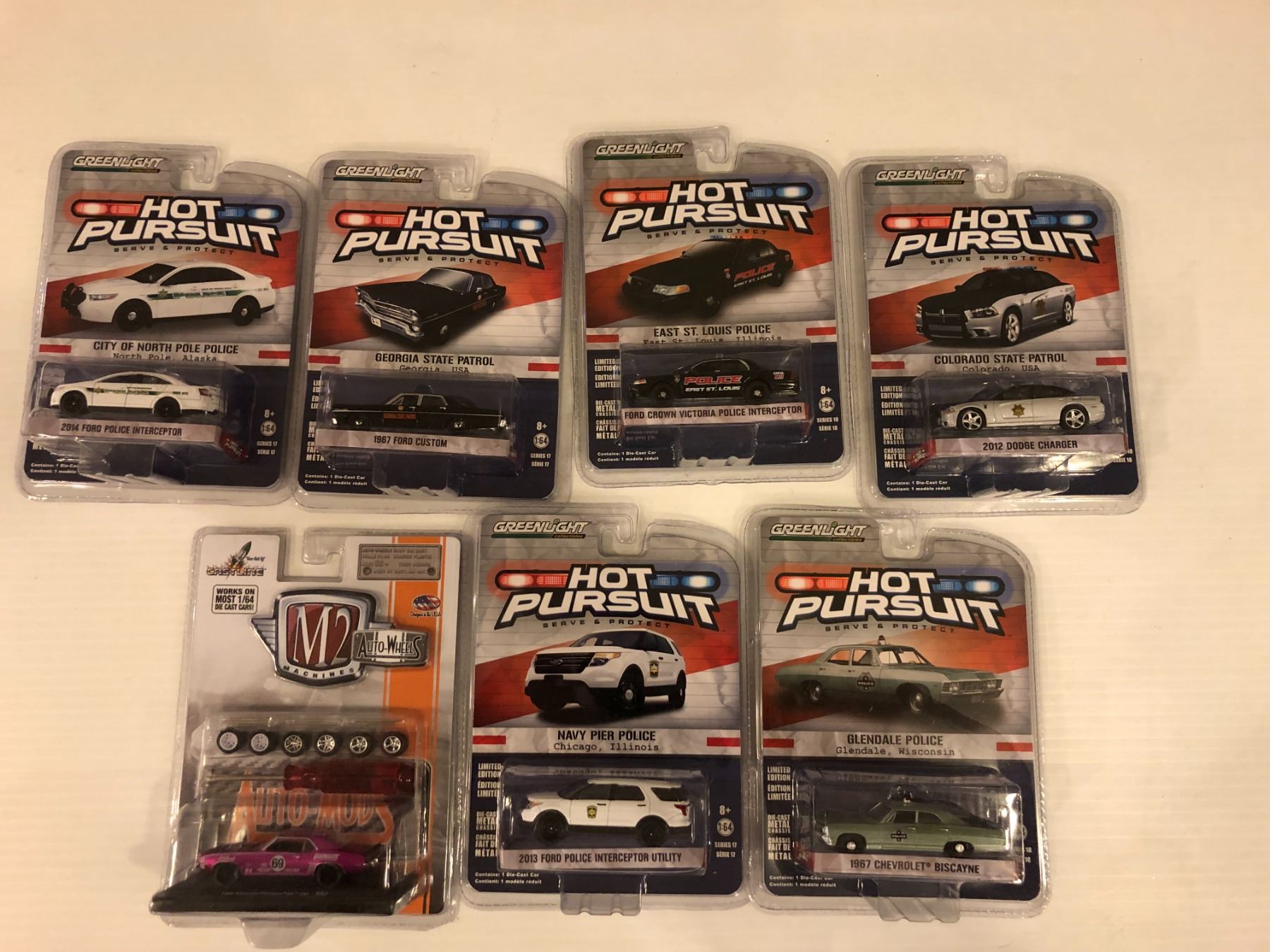 Group of 7 collectible NEW die-cast cars - 6 Greenlight Collectibles Hot Pursuit & 1 Castline M2 Machines