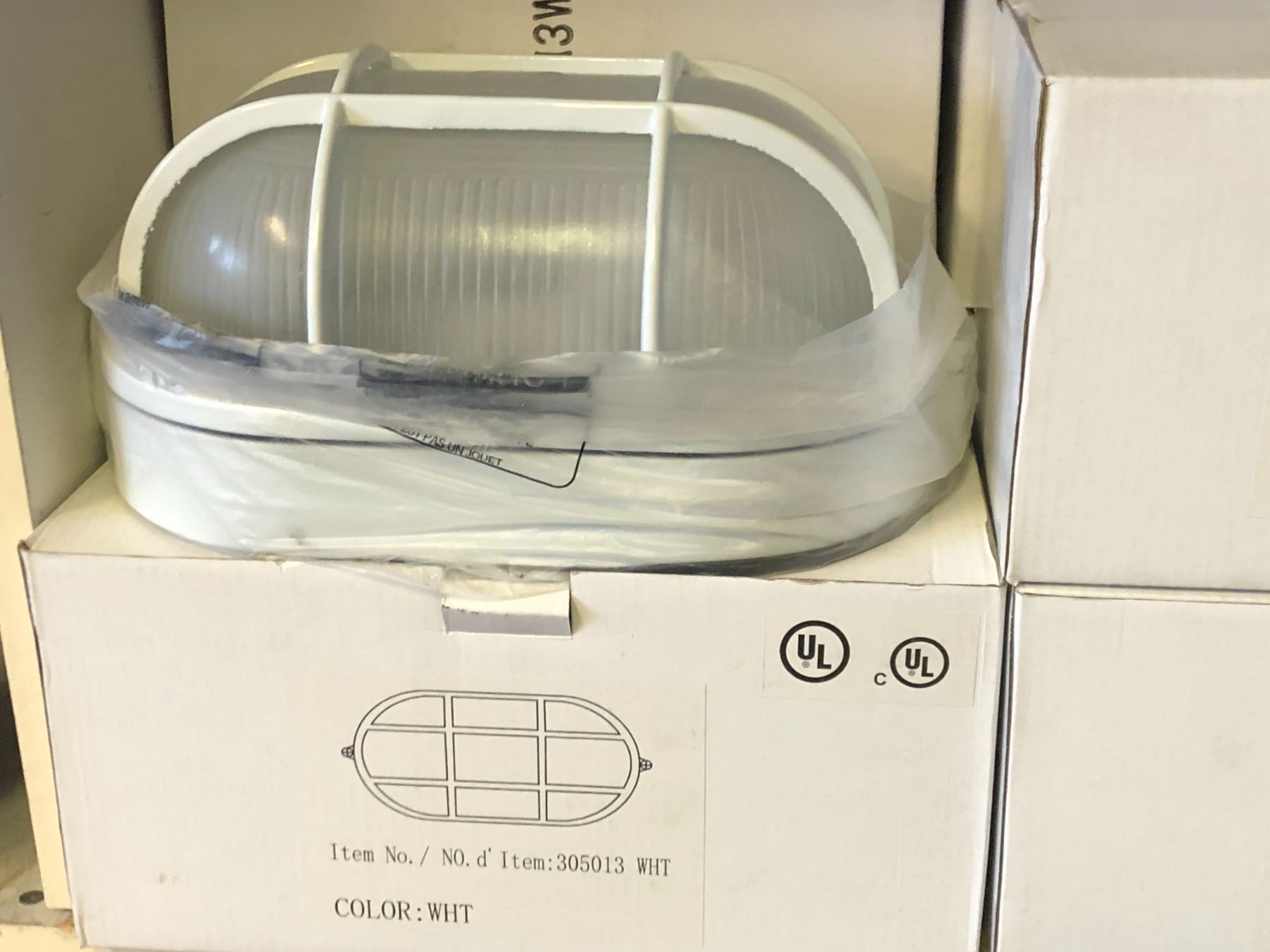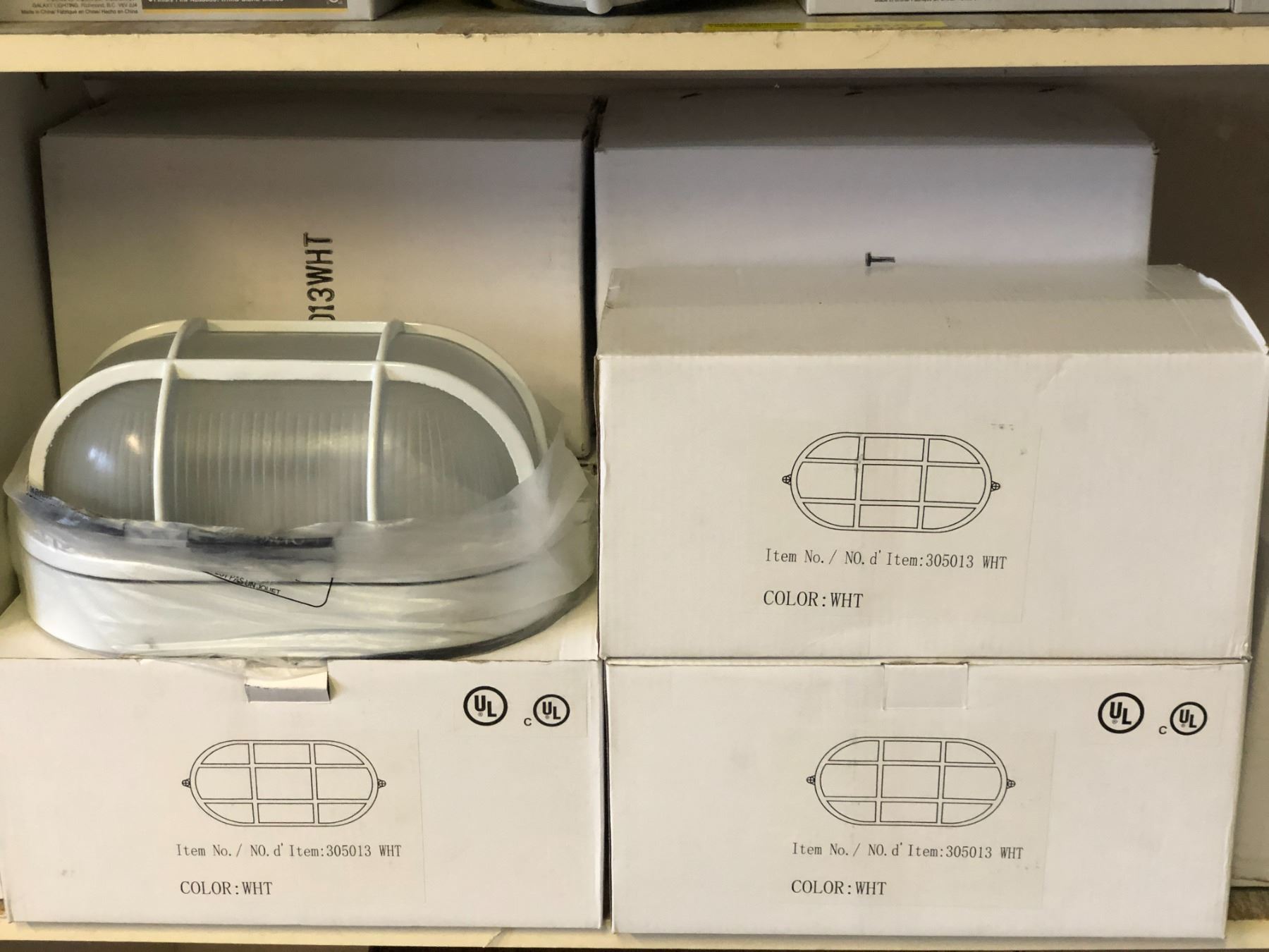 Group of 8 "New" outdoor light fixtures w/ white metal cage cover (From the superhero show)