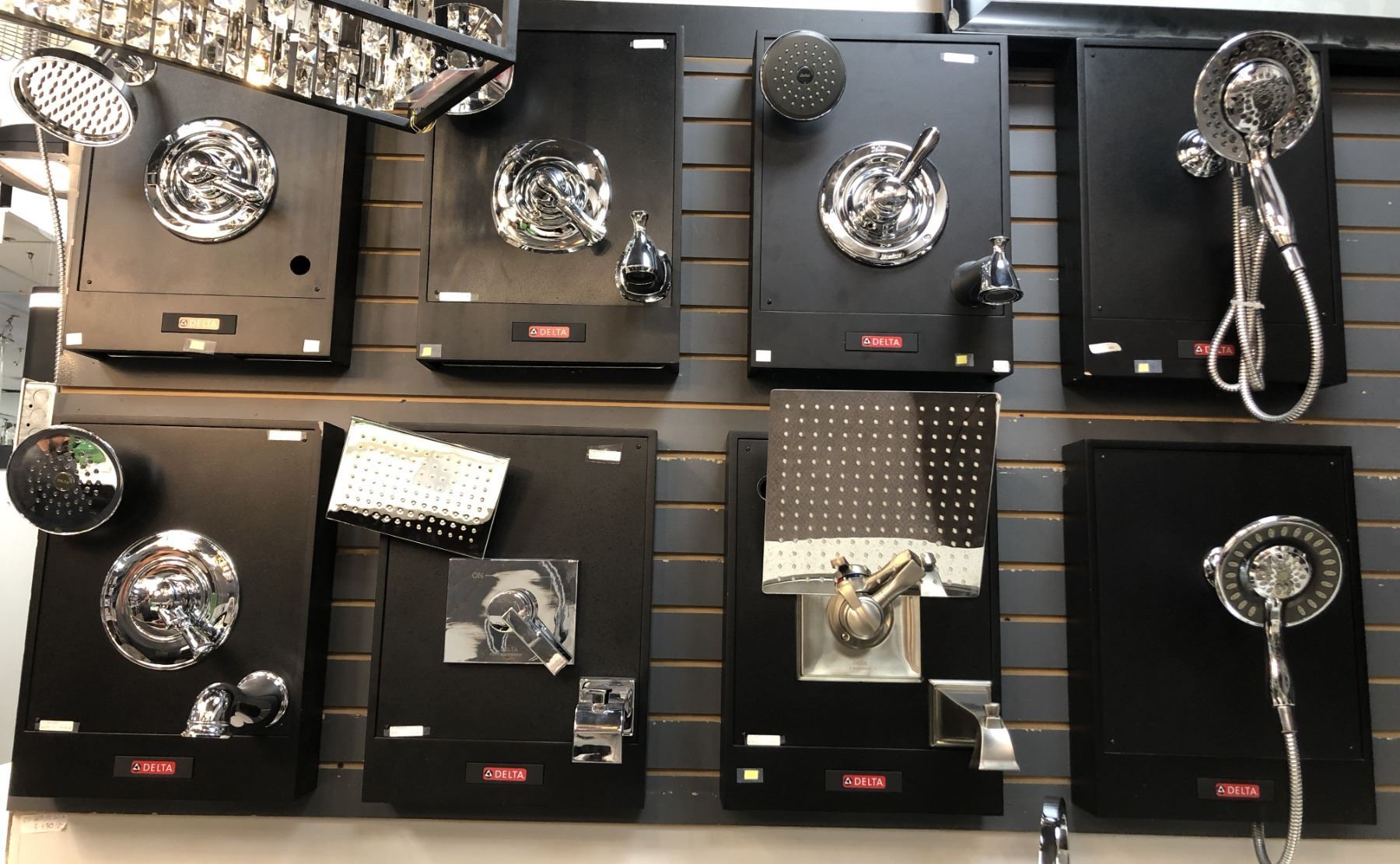 Group of 8 assorted delta shower head kits w/roughing at back - includes spouts & knobs