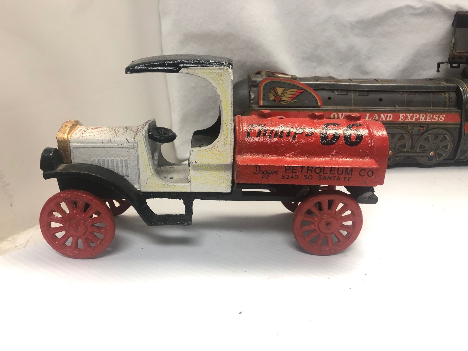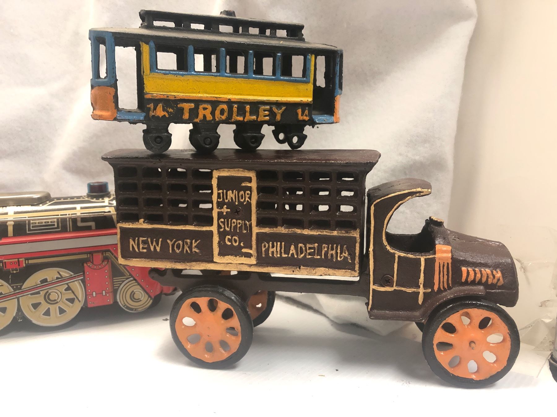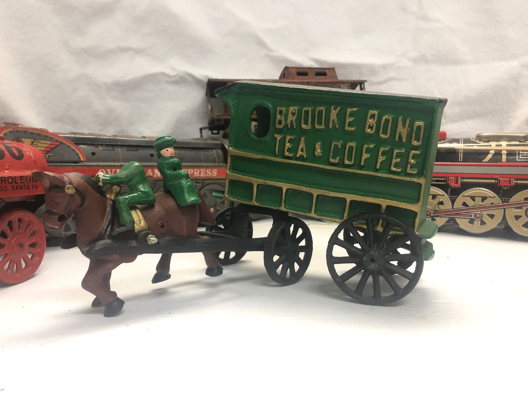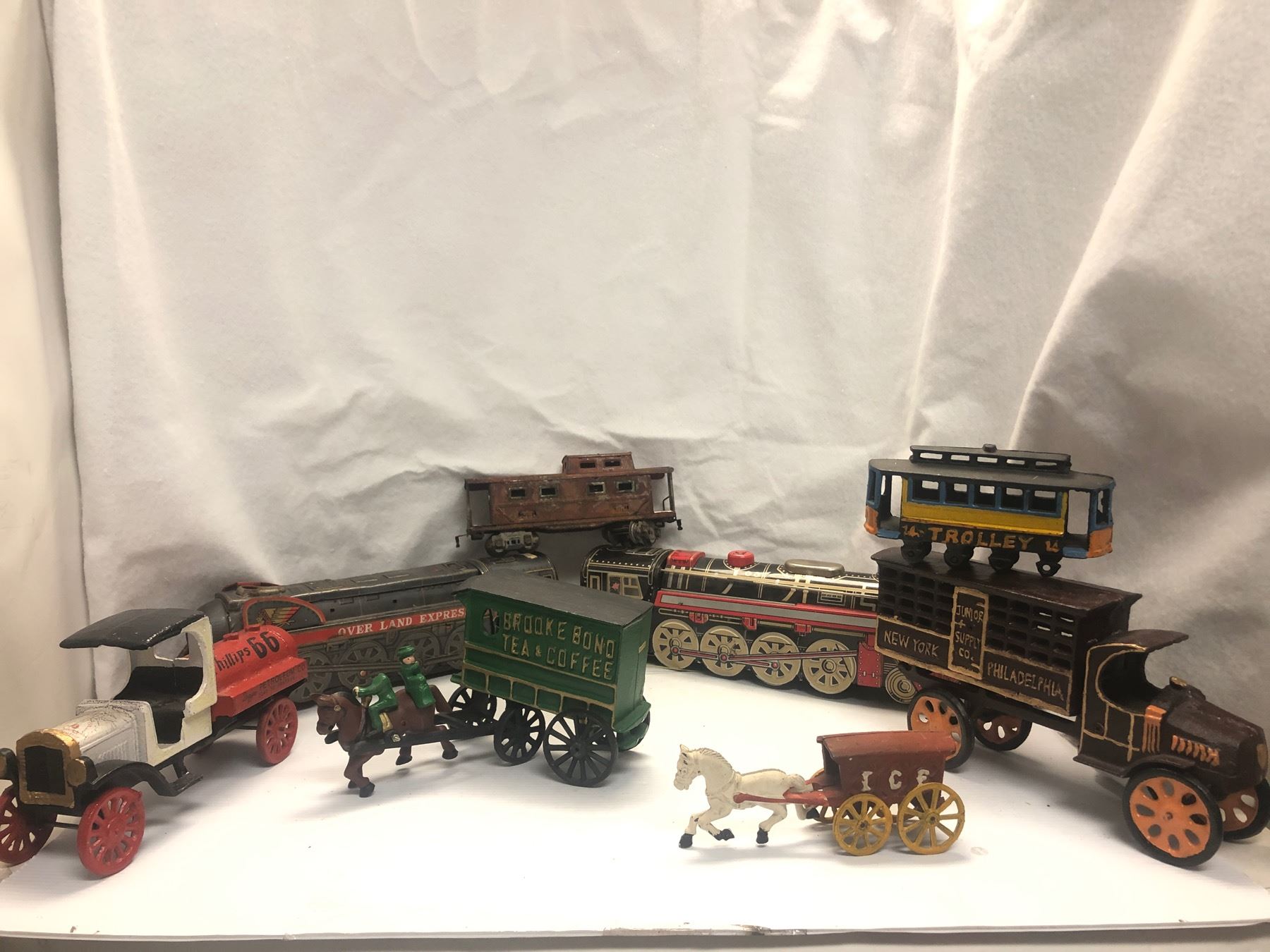 Group of 8 vintage toy train / trolley / cast iron ice wagon bugey w/ horse etc
