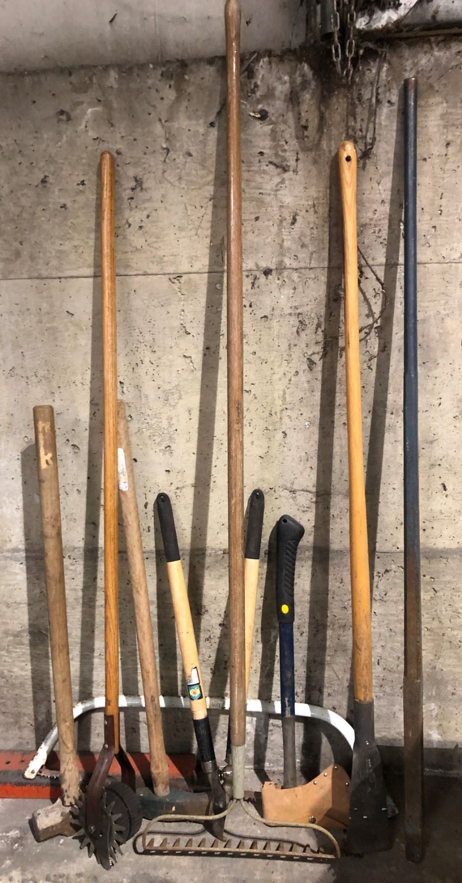Group of 9 assorted yard tools - axe/ sledge hammer/ rake/ pruners etc.