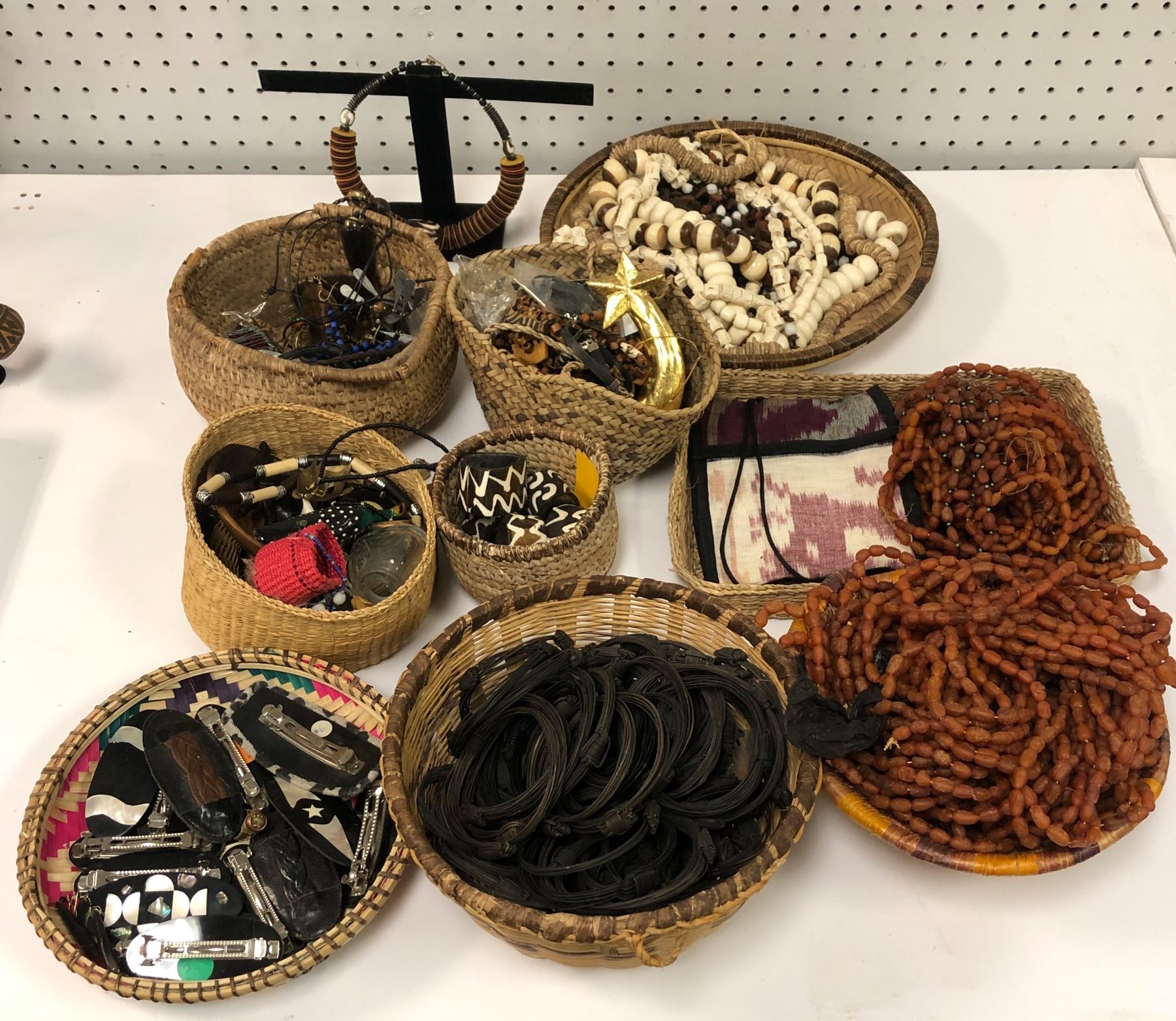 Group of African assorted jewelry - includes necklaces / bracelets / bone beaded necklaces / hair clips / crossbody bag etc (black jewelry stands not included with lot)