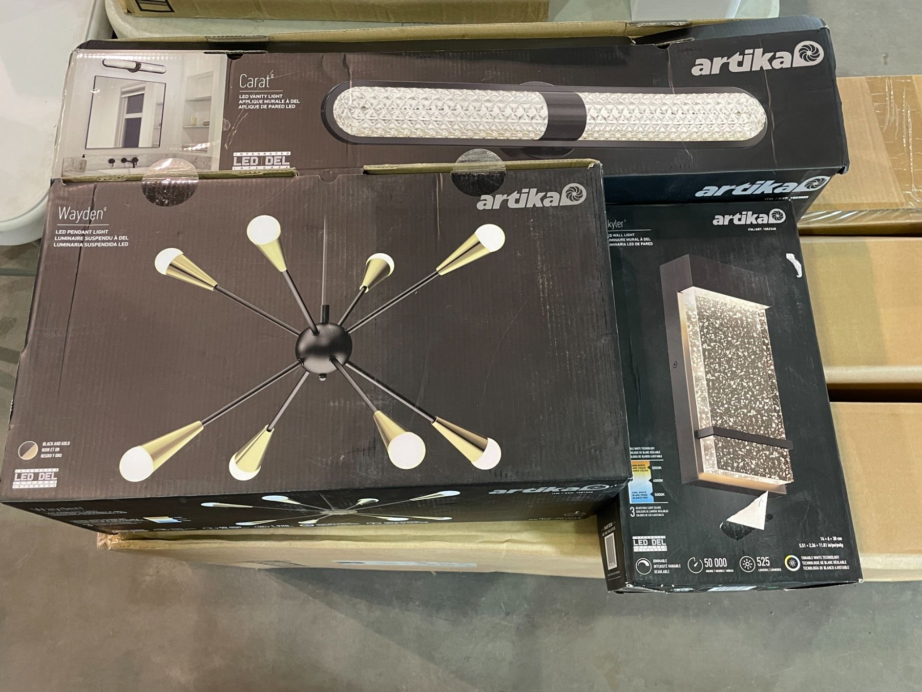 Group of Artika Skyler LED wall light, Carat LED vanity light, Wayden LED pendant light (store return(s))