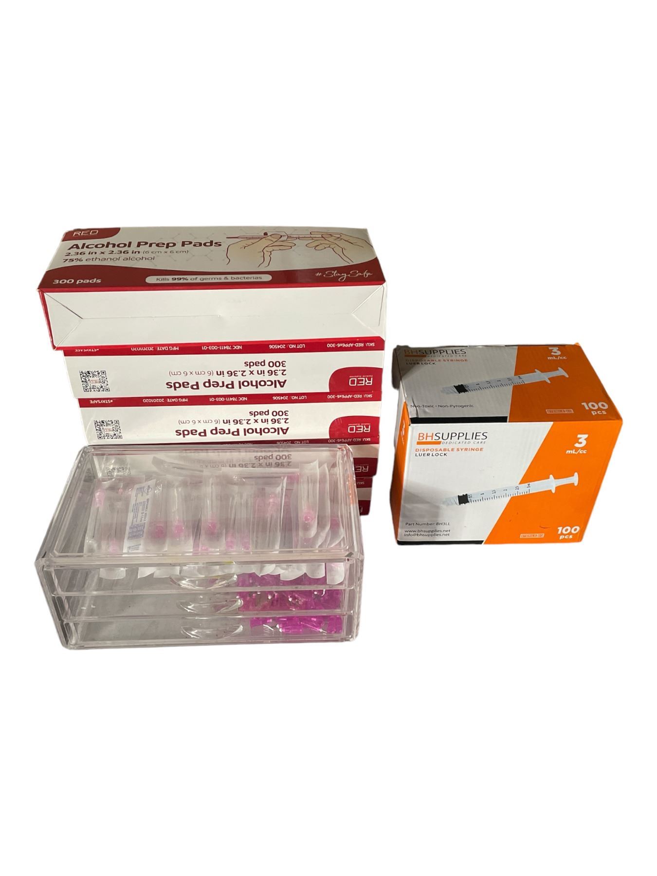 Group of Beauty Products Including - Disposable Syringes, Alcohol Prep Pads, & Needle Heads
