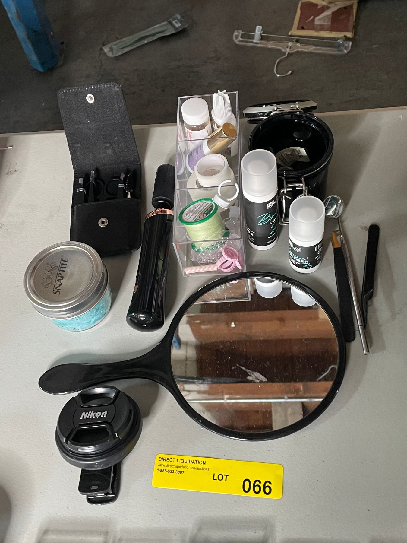 Group of Beauty Products Including - Mirror, Pluckers, Nail Polish Shaker, Nikon Lens, Brow Fixing,