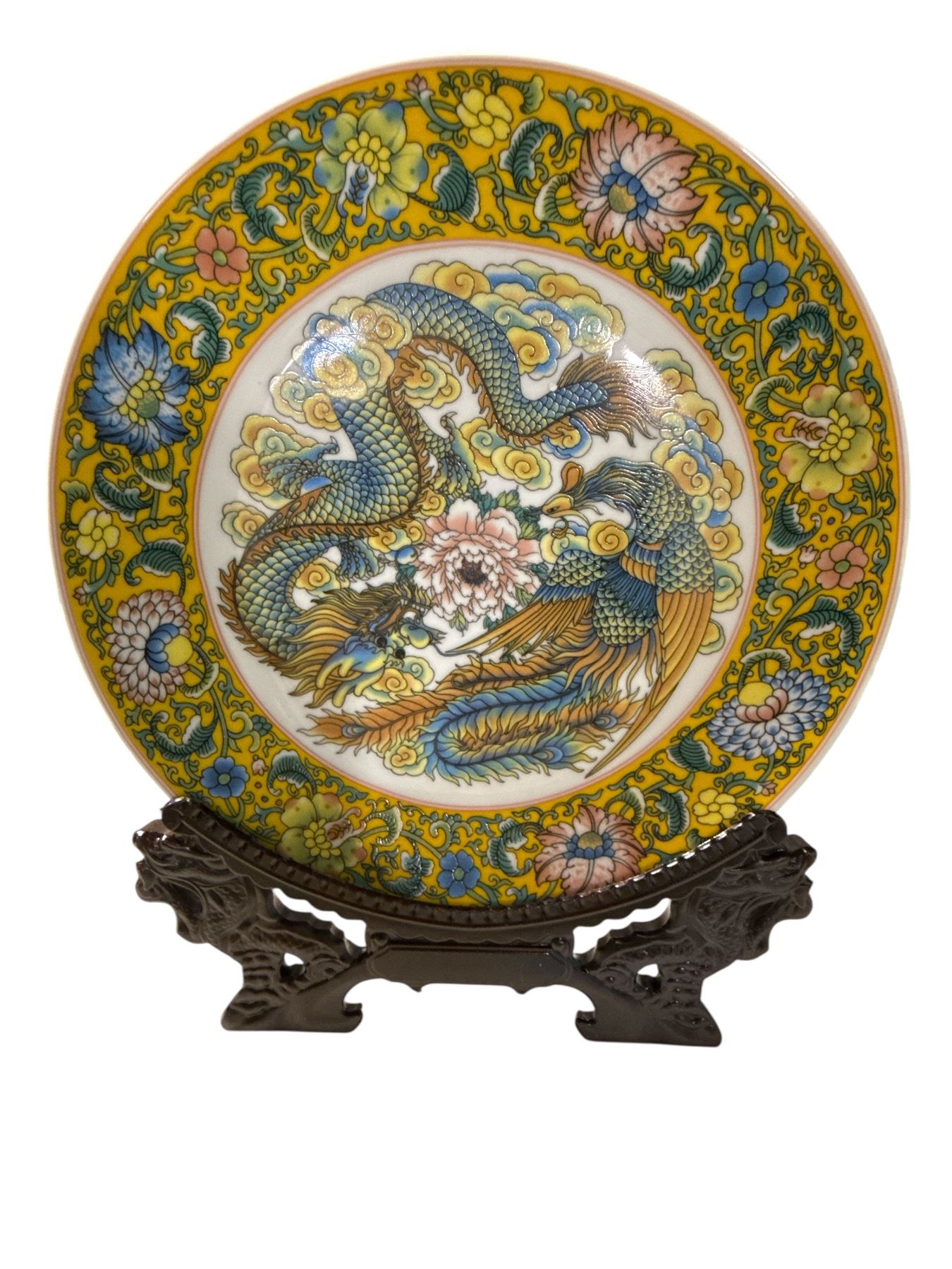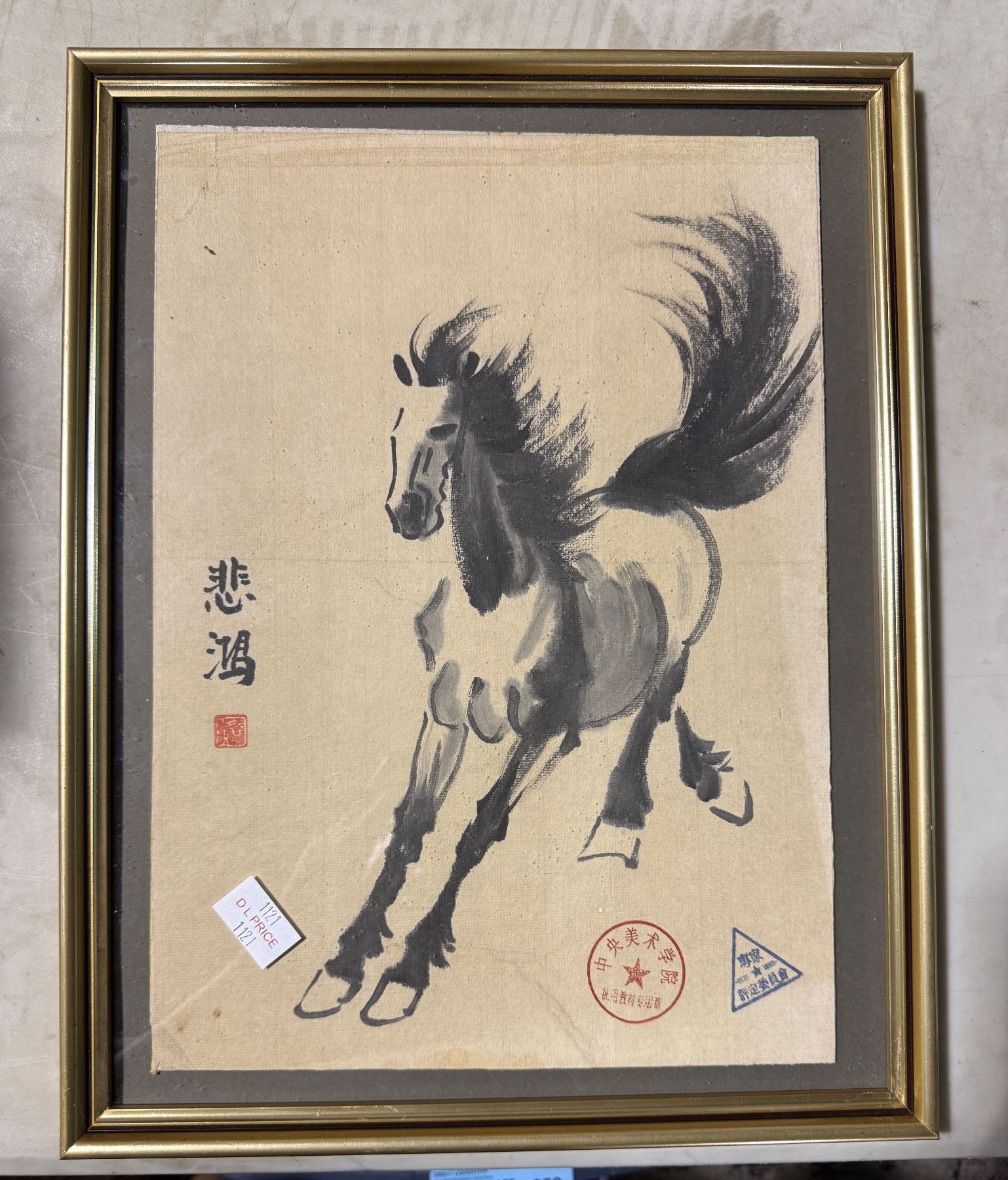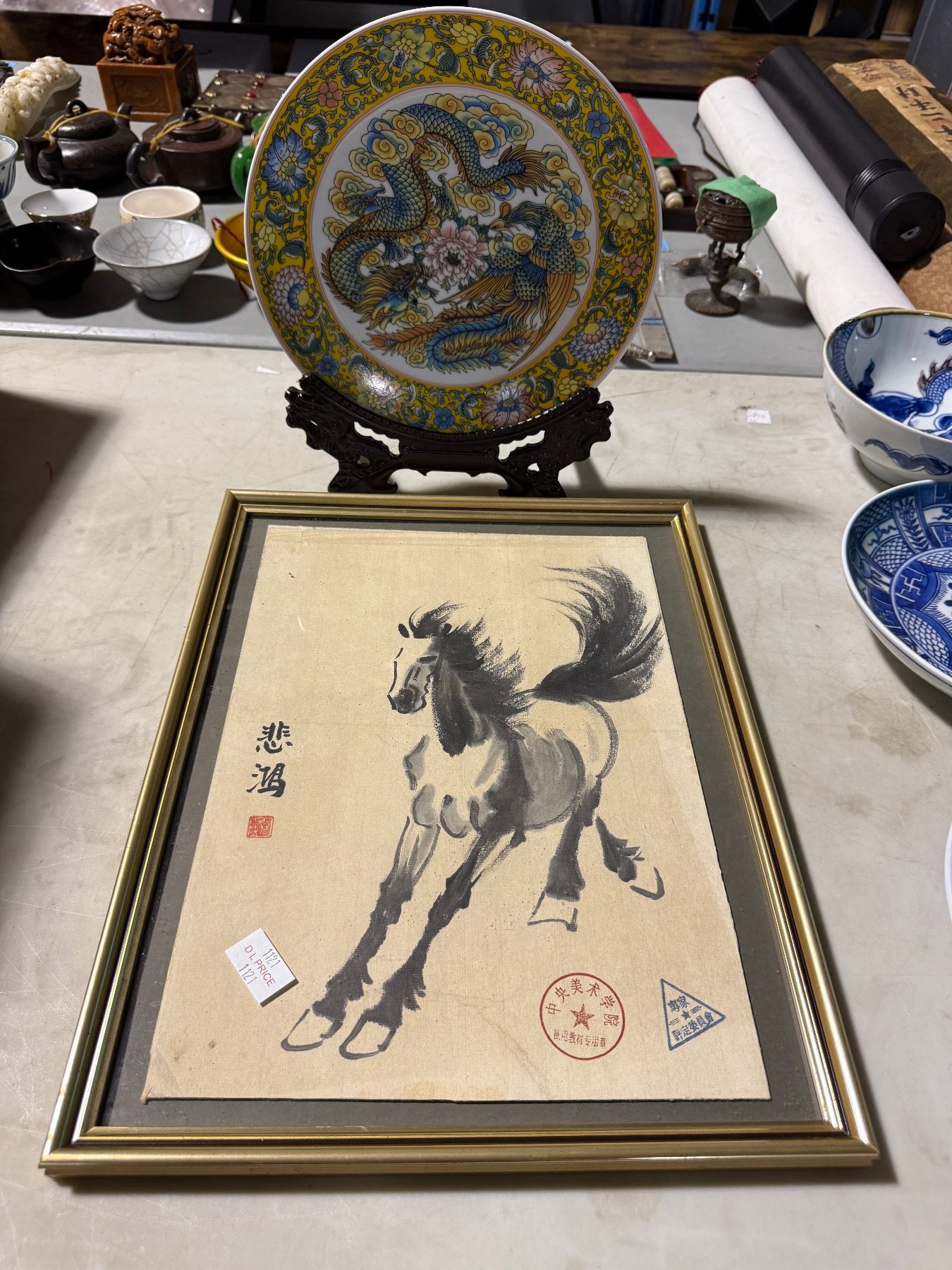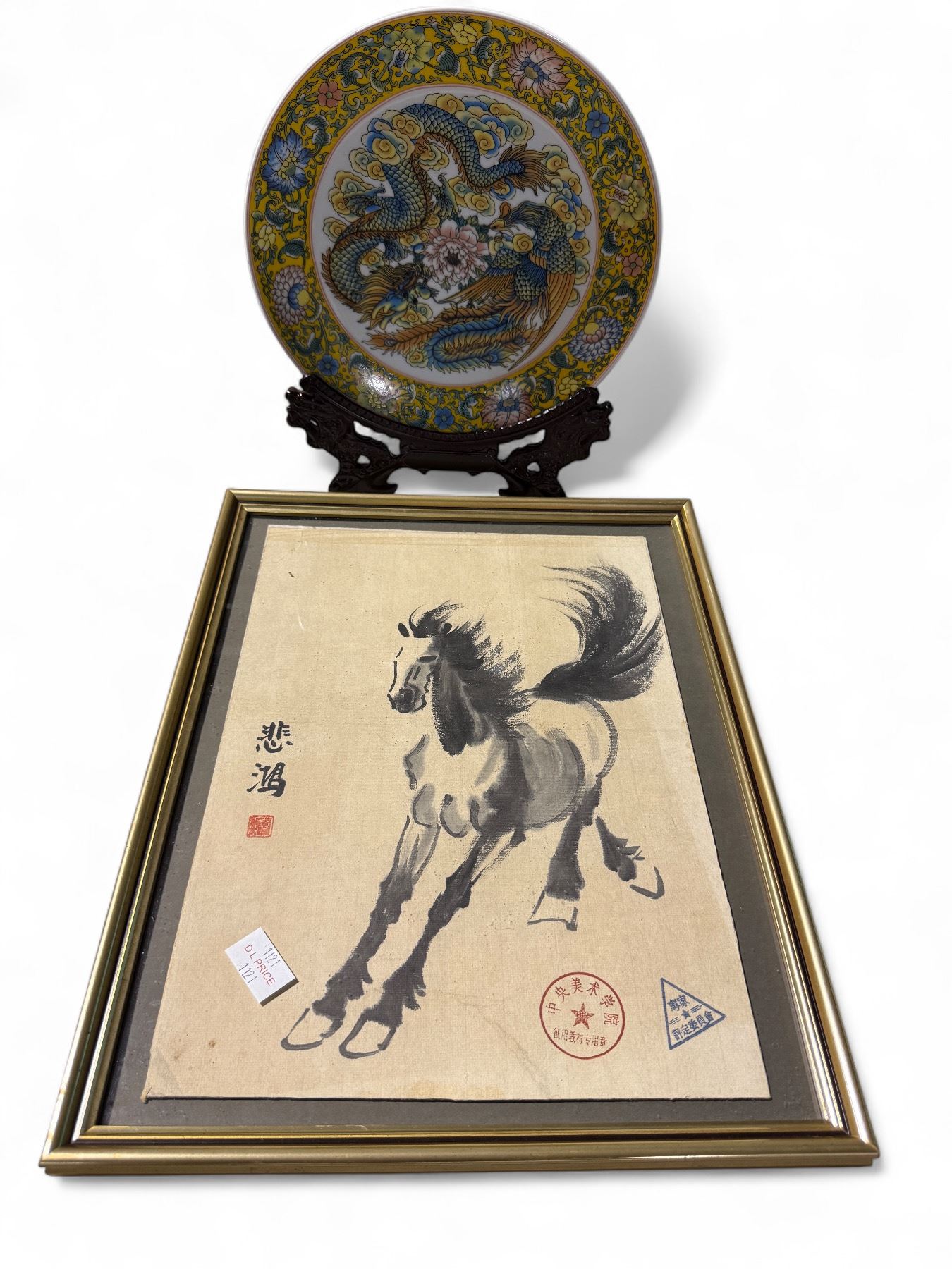 Group of Ink on Paper Framed Horse Painting & Famille Rose Dragon Plate