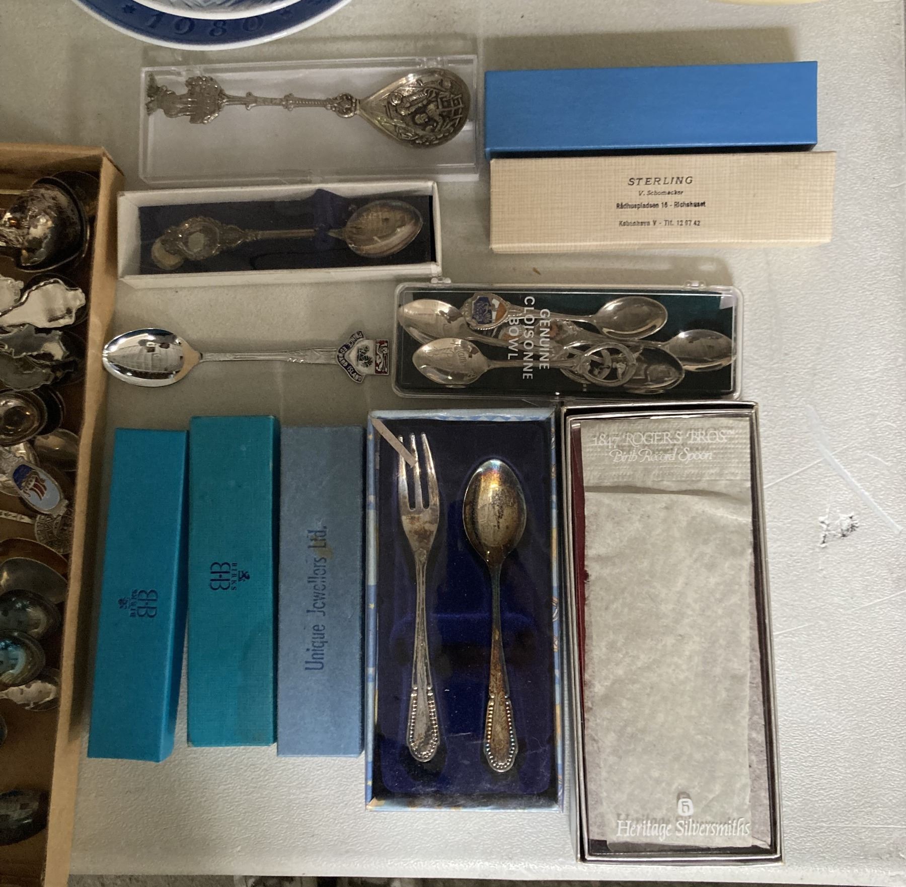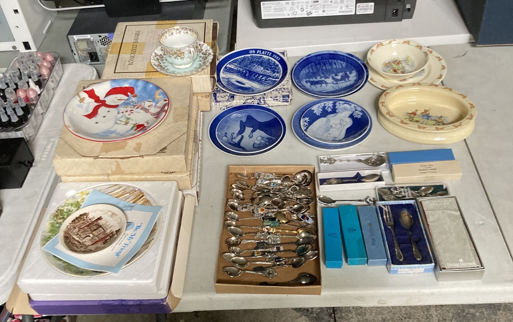 Group of Misc Including - 3 Bunnykins Royal Doulton, Collectable Teaspoons (Possible Silver), 3 Royal Copenhagen Plates, & Misc China
