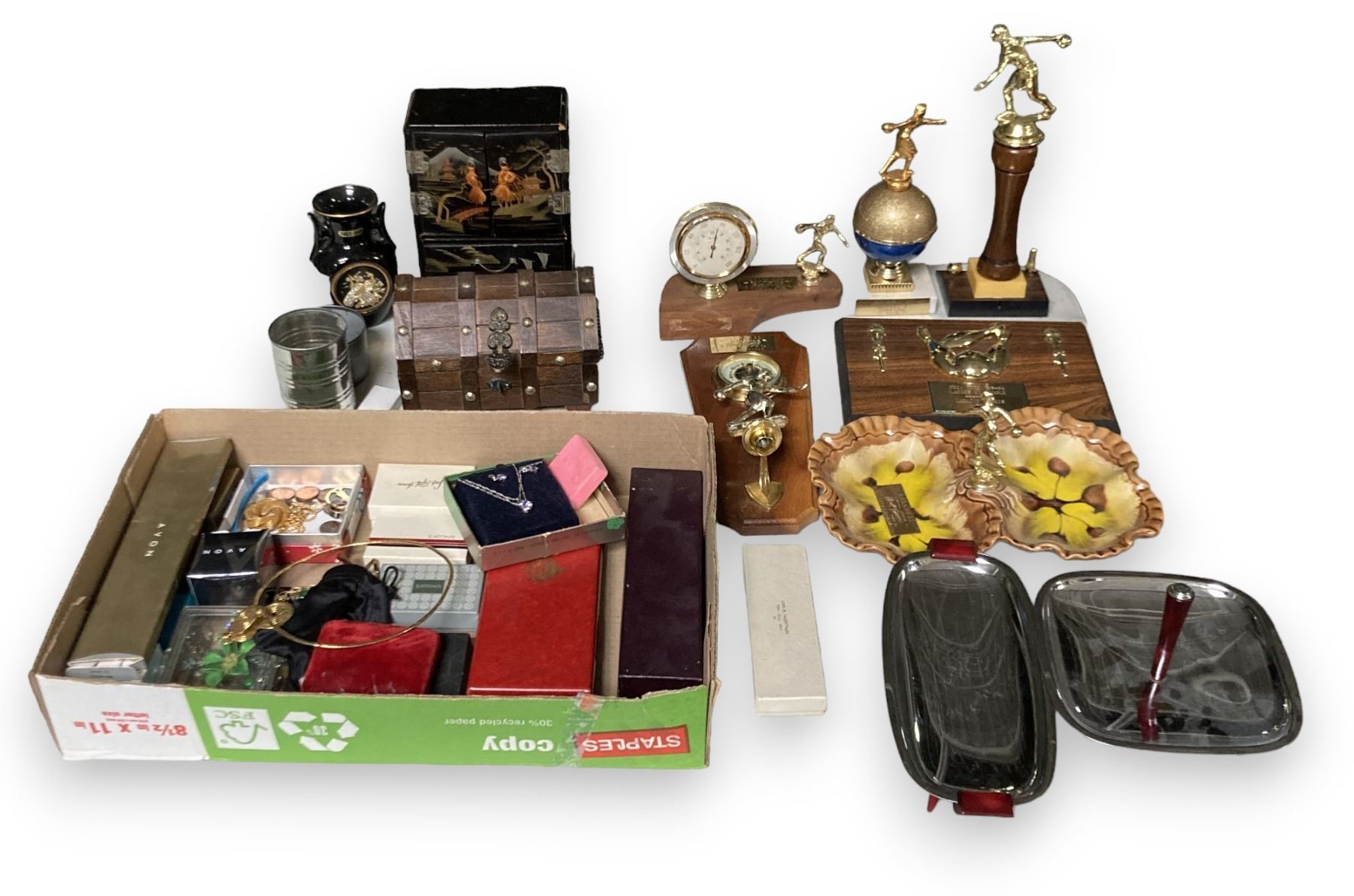 Group of Misc Including - Vintage Crosser Coffee Maker, Jewelry, Black Forest Christmas Clock Hand Painted, Trophies, Vintage Mini Tansu Boxes, Boxes of Glassware, Etc.