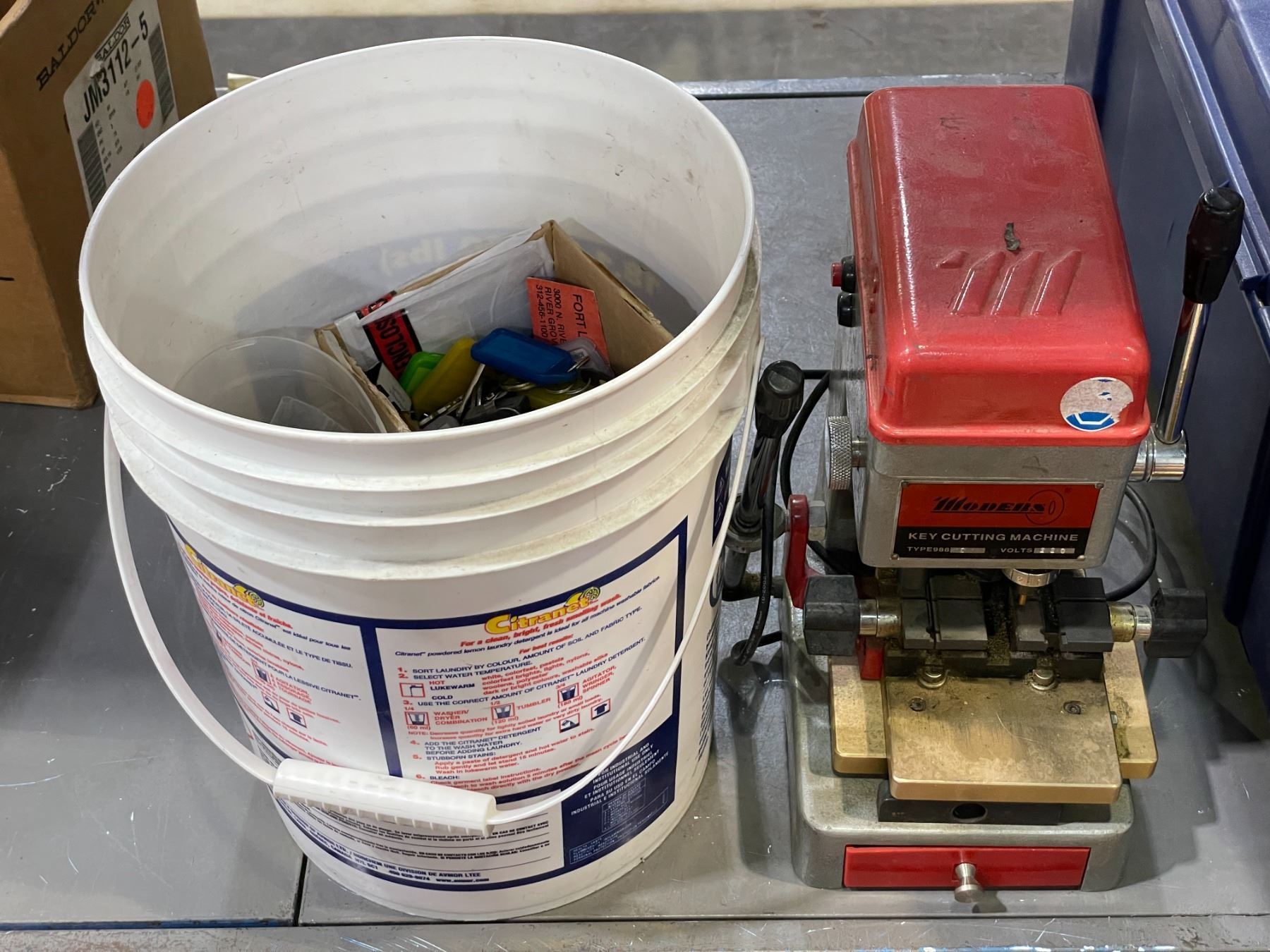 Group of Modern key cutting machine, a bucket of keys & key accessories