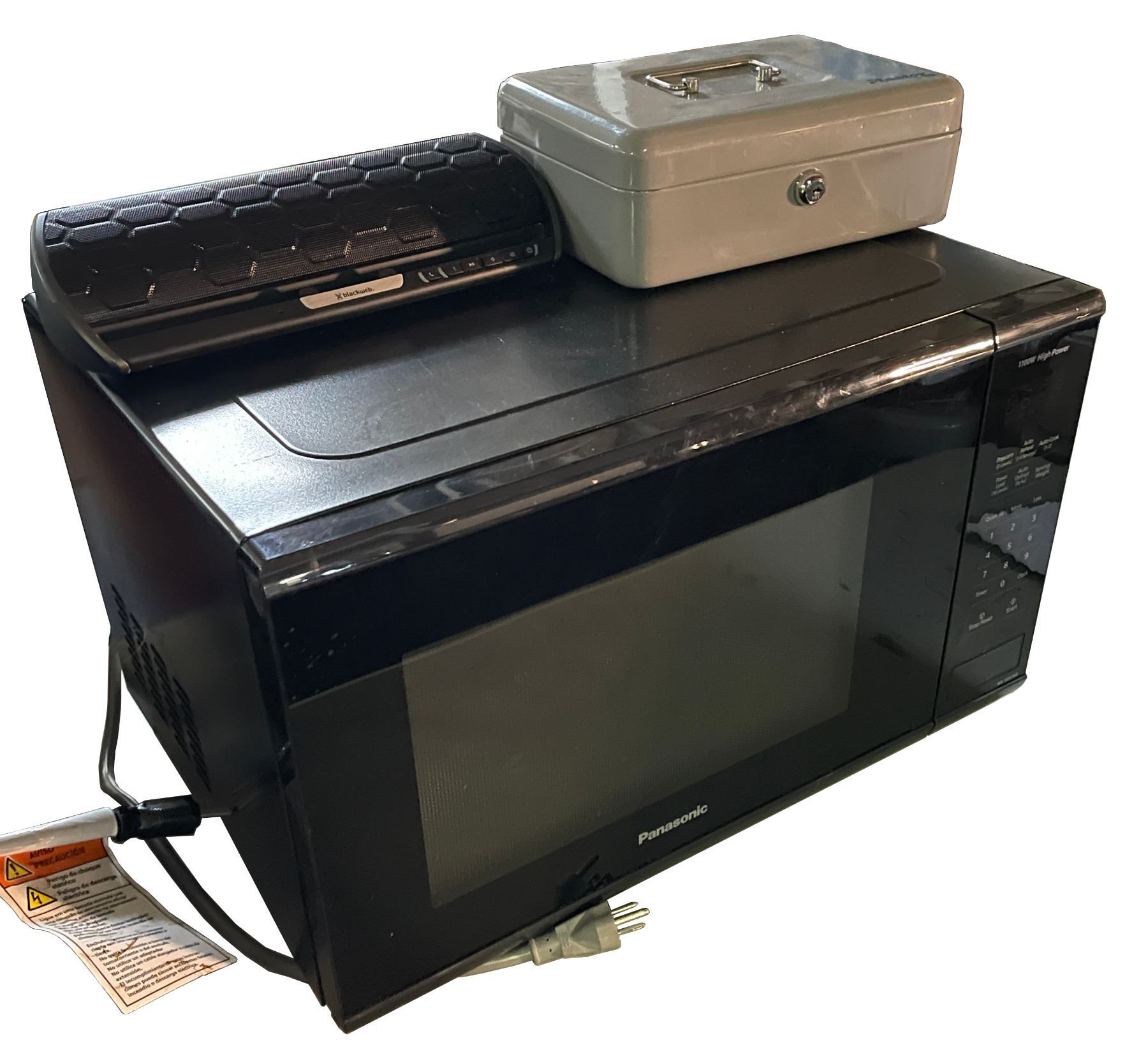 Group of Panasonic Microwave, Blackweb Speaker & Master Lock Money Tray Box