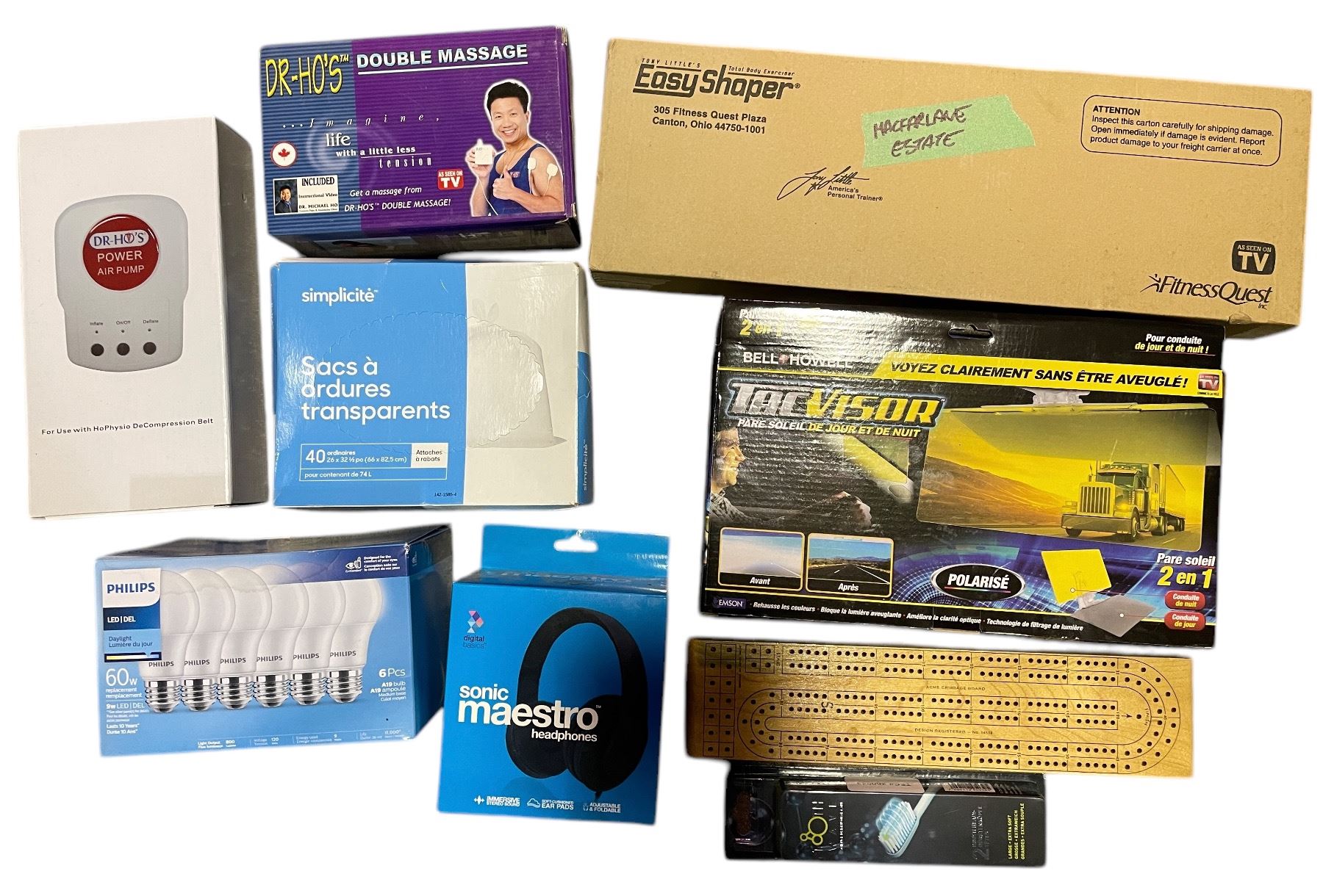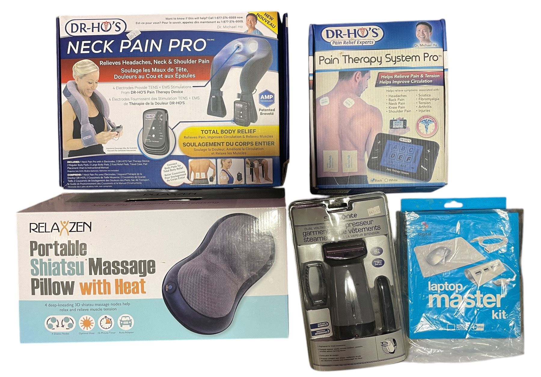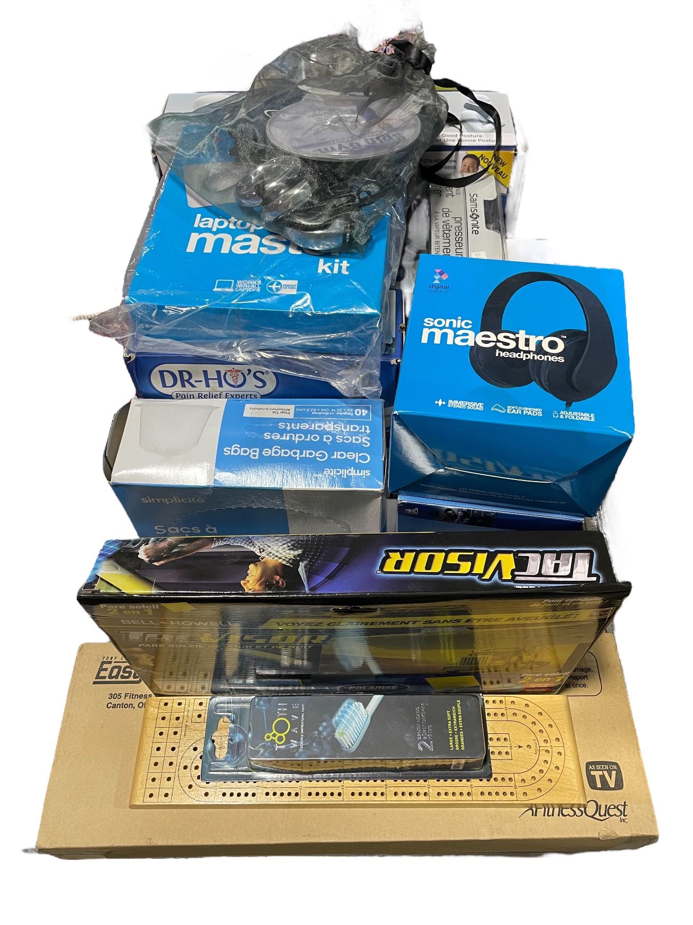 Group of Tac Car Visor, Sonic Maestro Headphones, Portable Shiatsu Massager, Laptop Kit, Etc.