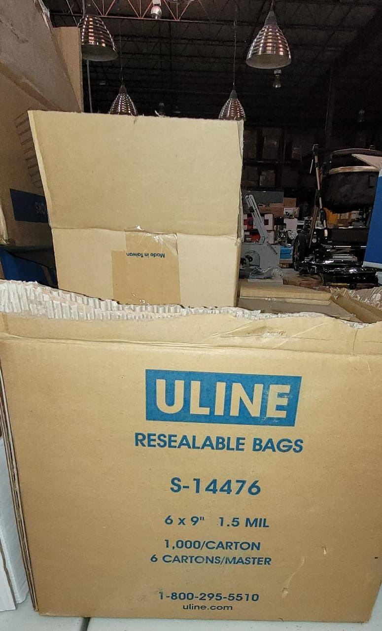 Group of Uline items - Resealable bags (S-14476) / wheel chocks / 15' chain for wheel chocks (H-546) etc