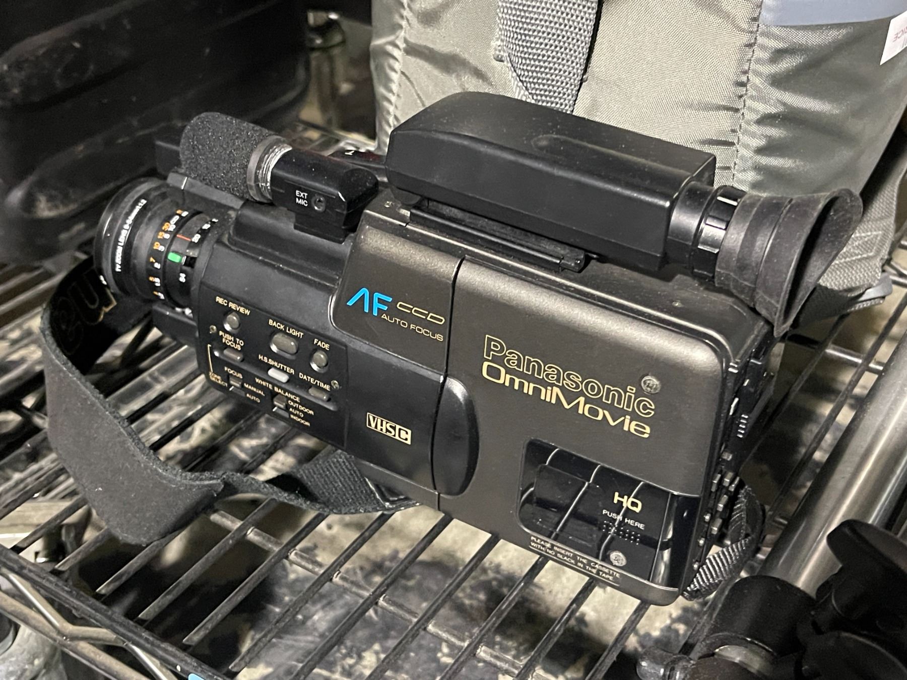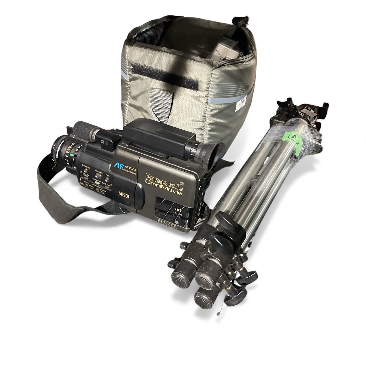 Group of Vintage Photography and Video Equipment Includes Panasonic VHSC Camcorder, Polaroid Camera, and Tripod