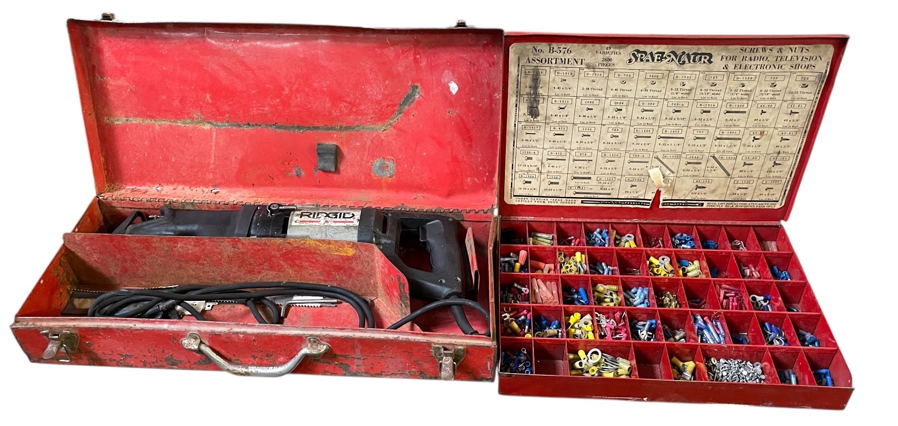 Group of Vintage Red Metal Toolboxes - Assorted Styles and Sizes, Includes “Screw Nuts” Tin w/Contents