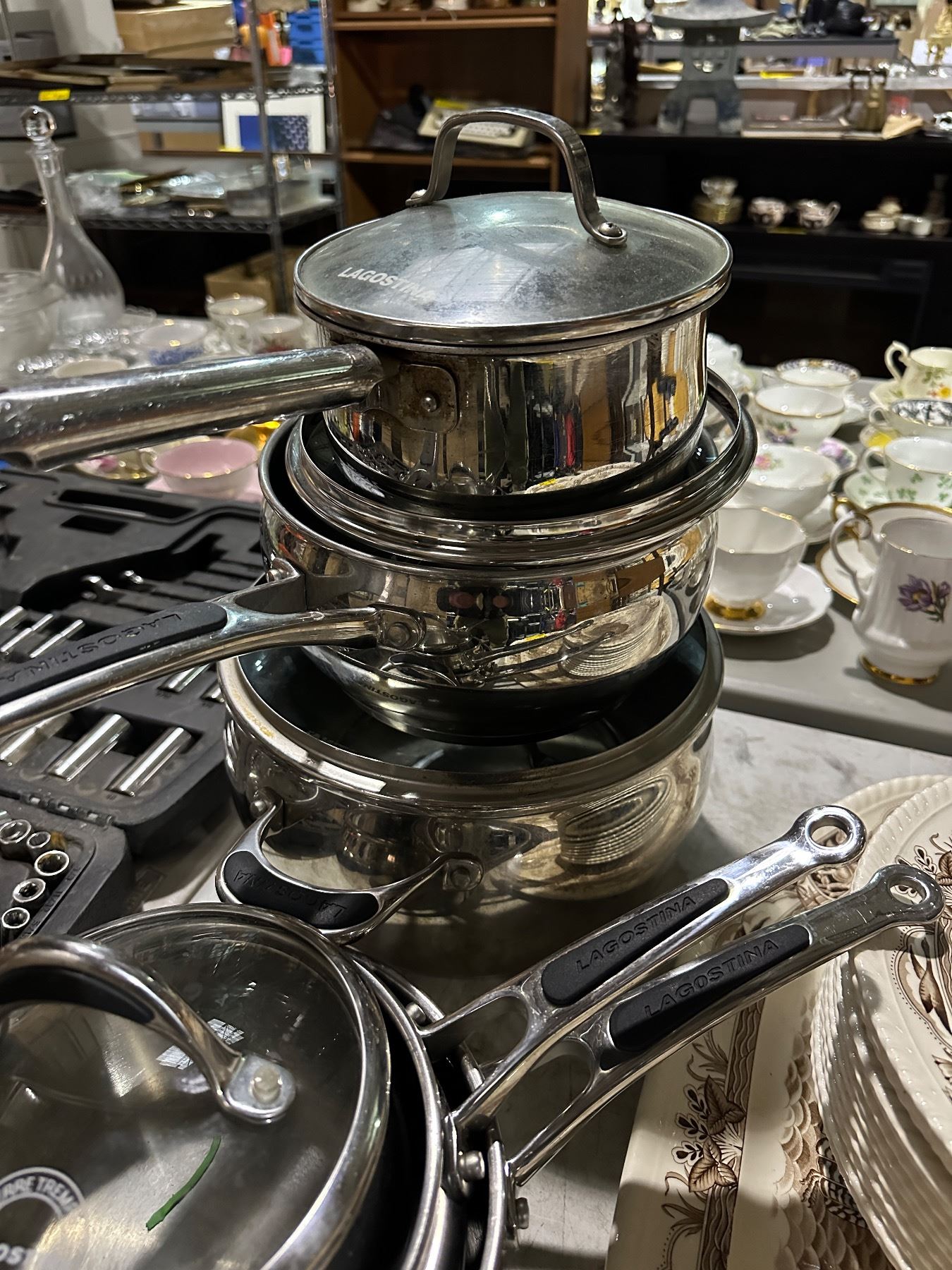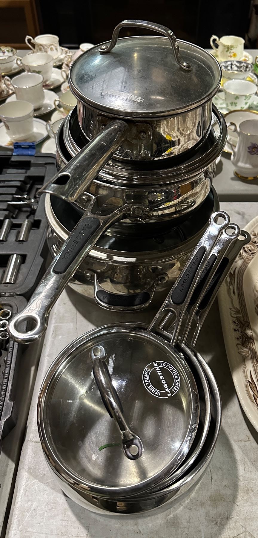 Group of approx. 3 stainless steel pot & 3 Lagostina pots