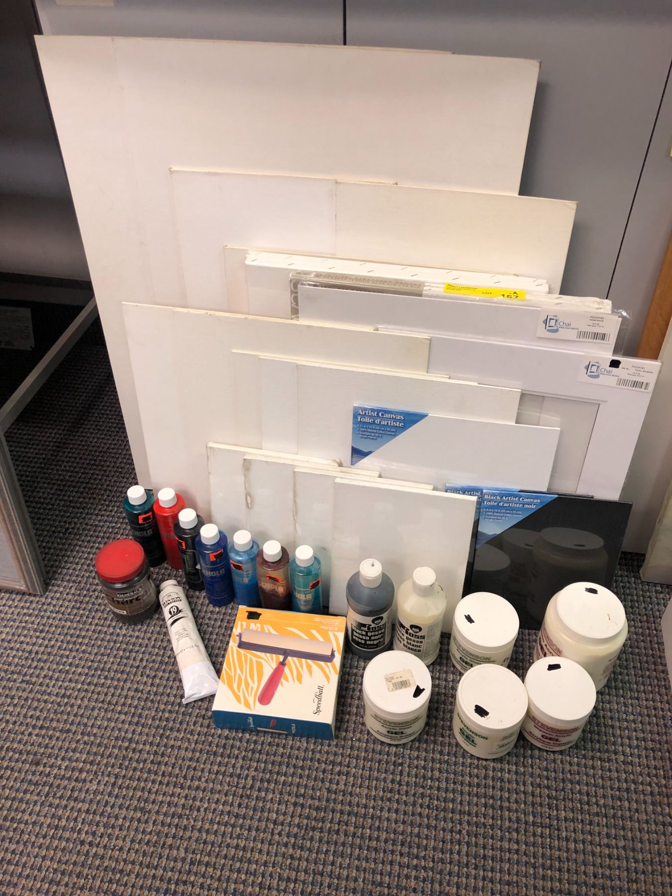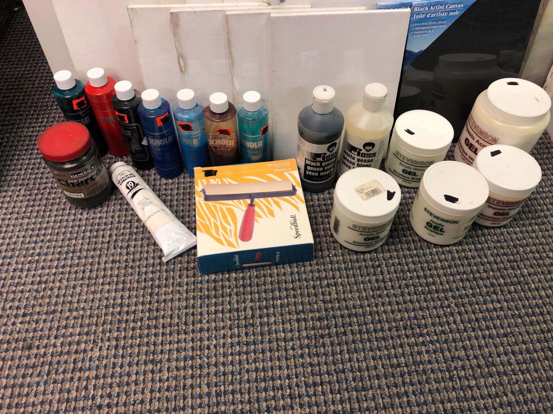 Group of artist's supplies - blank canvases/ assorted color paints/ acrylic gloss gel bottles etc.