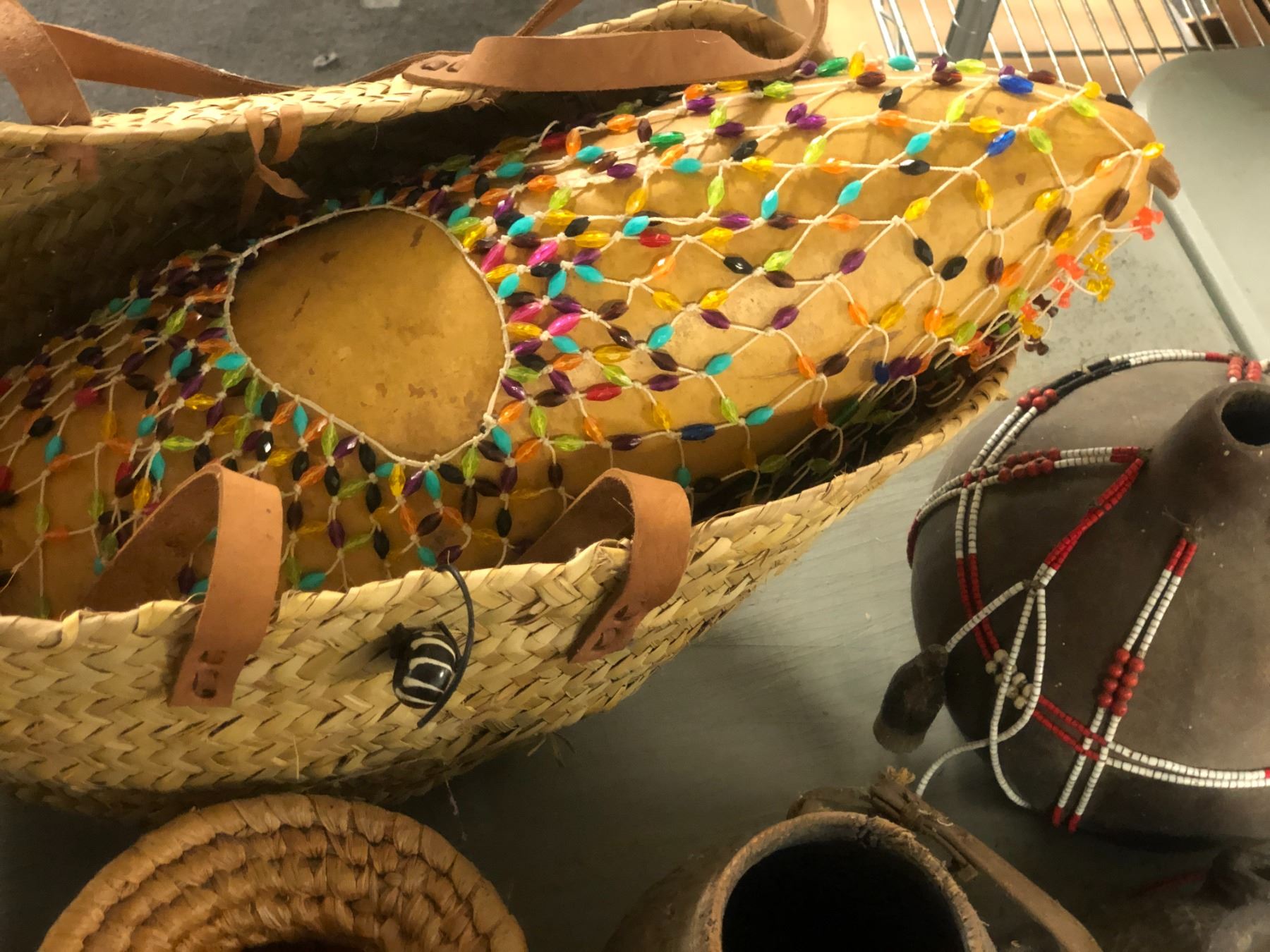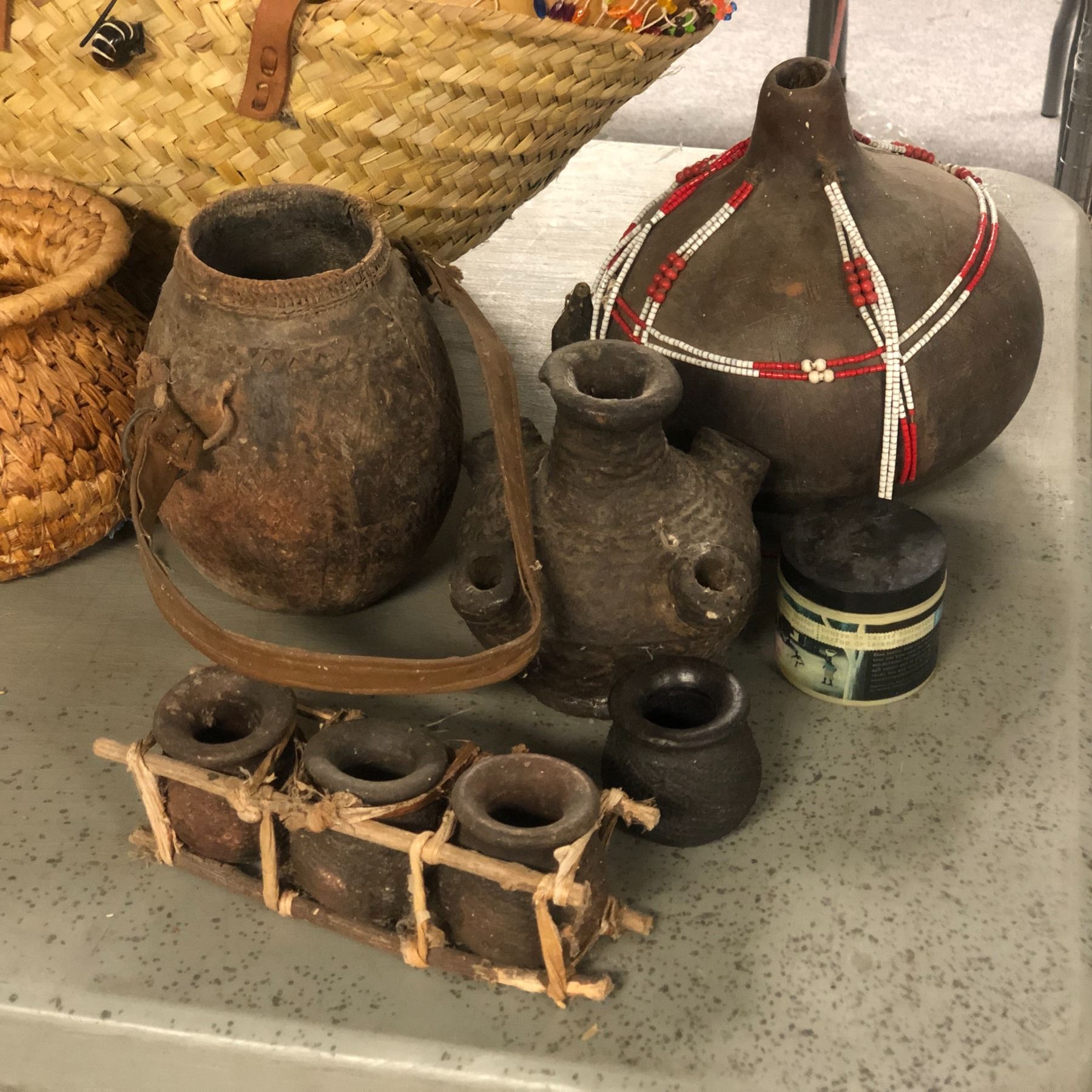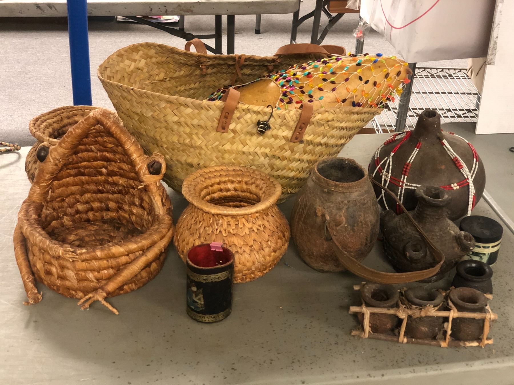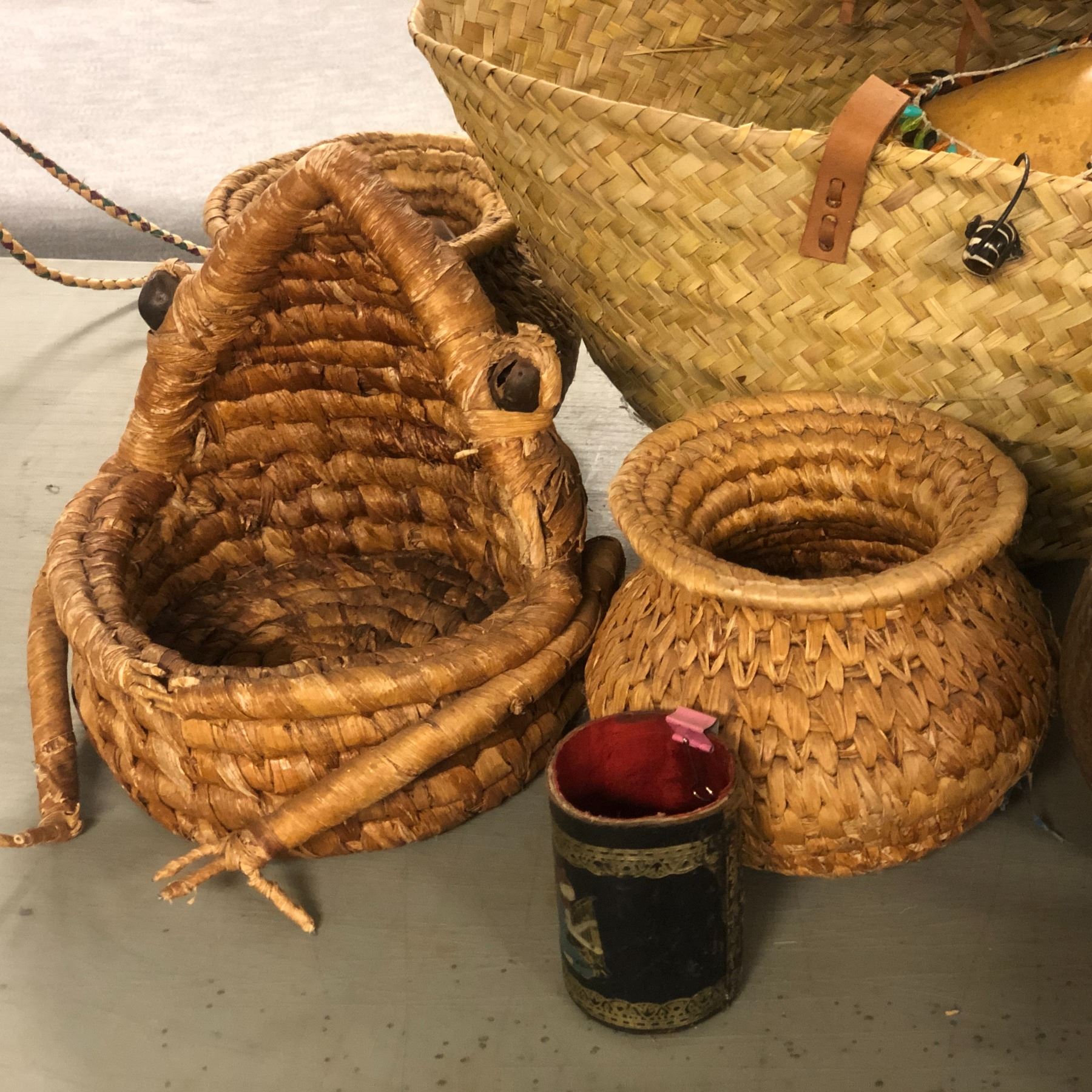 Group of assorted African items - includes frog basket / woven wicker baskets / African gourd etc