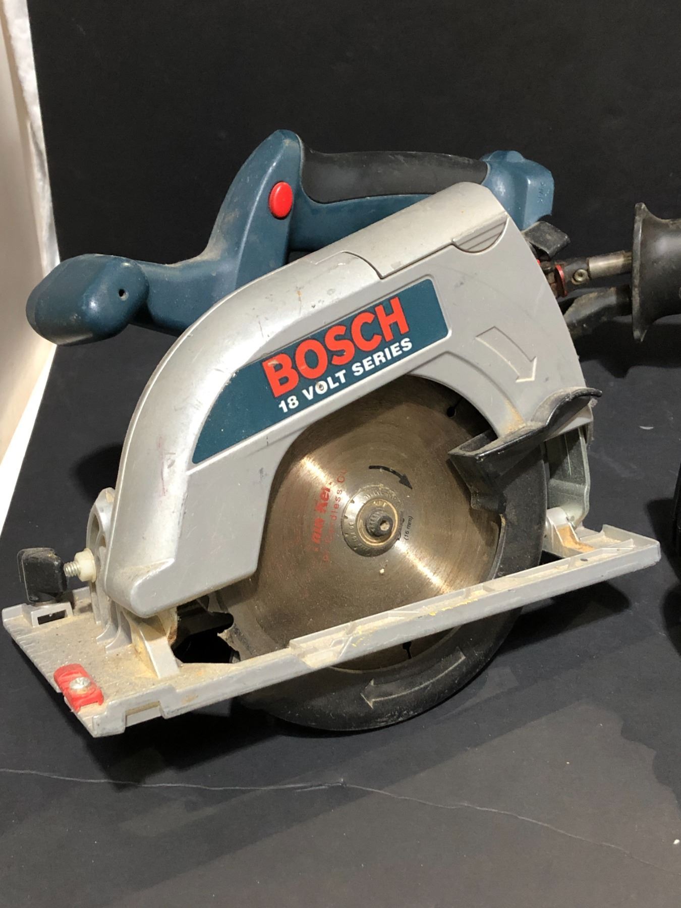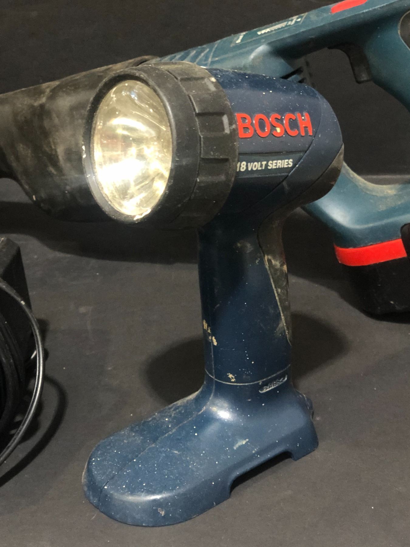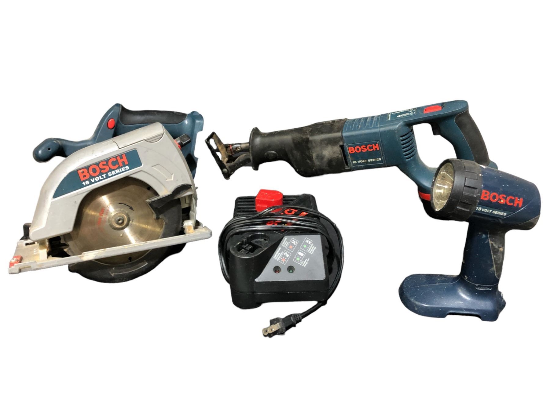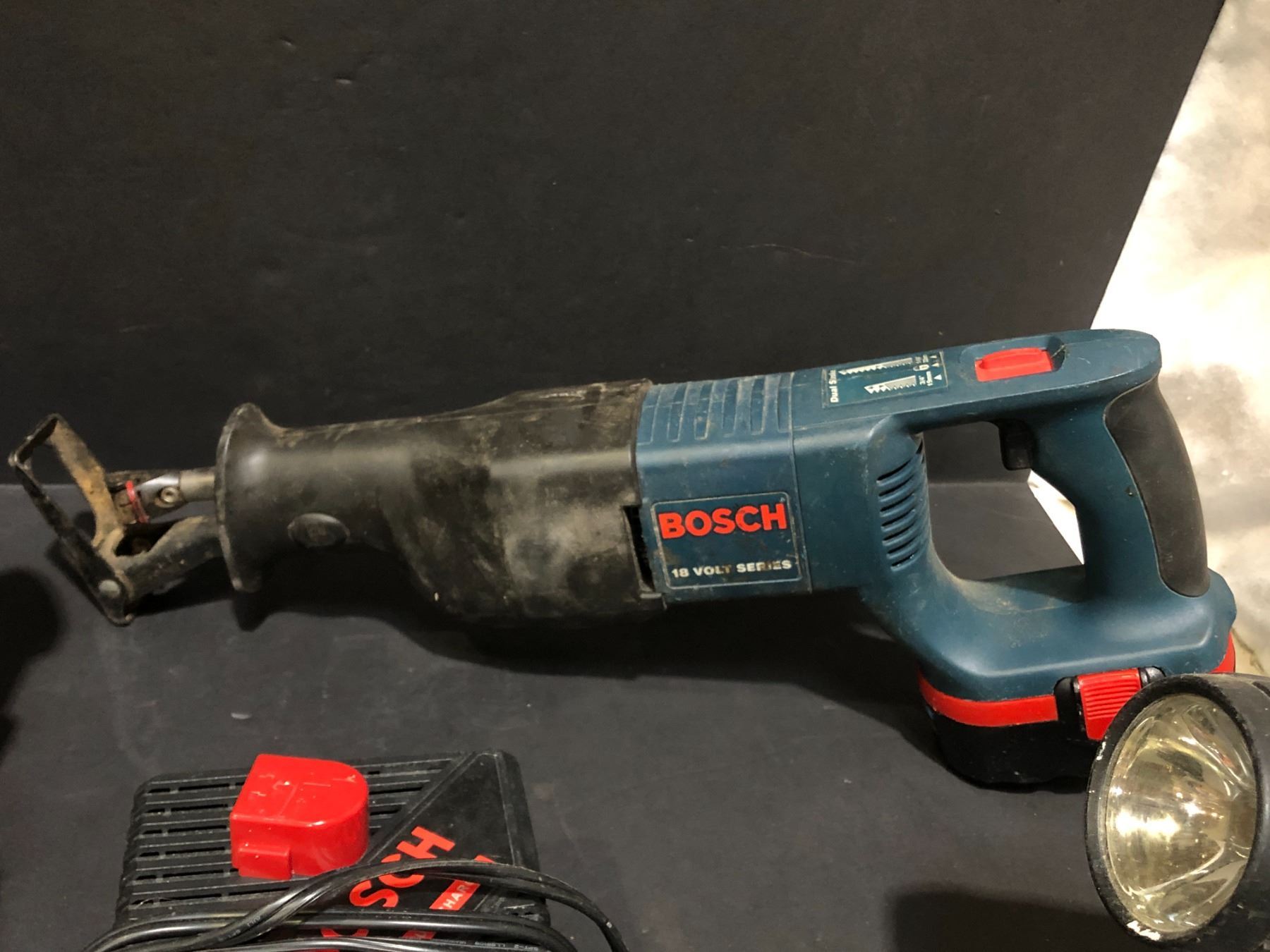 Group of assorted Bosch cordless tools includes - saws, flashlight, battery charger, etc...