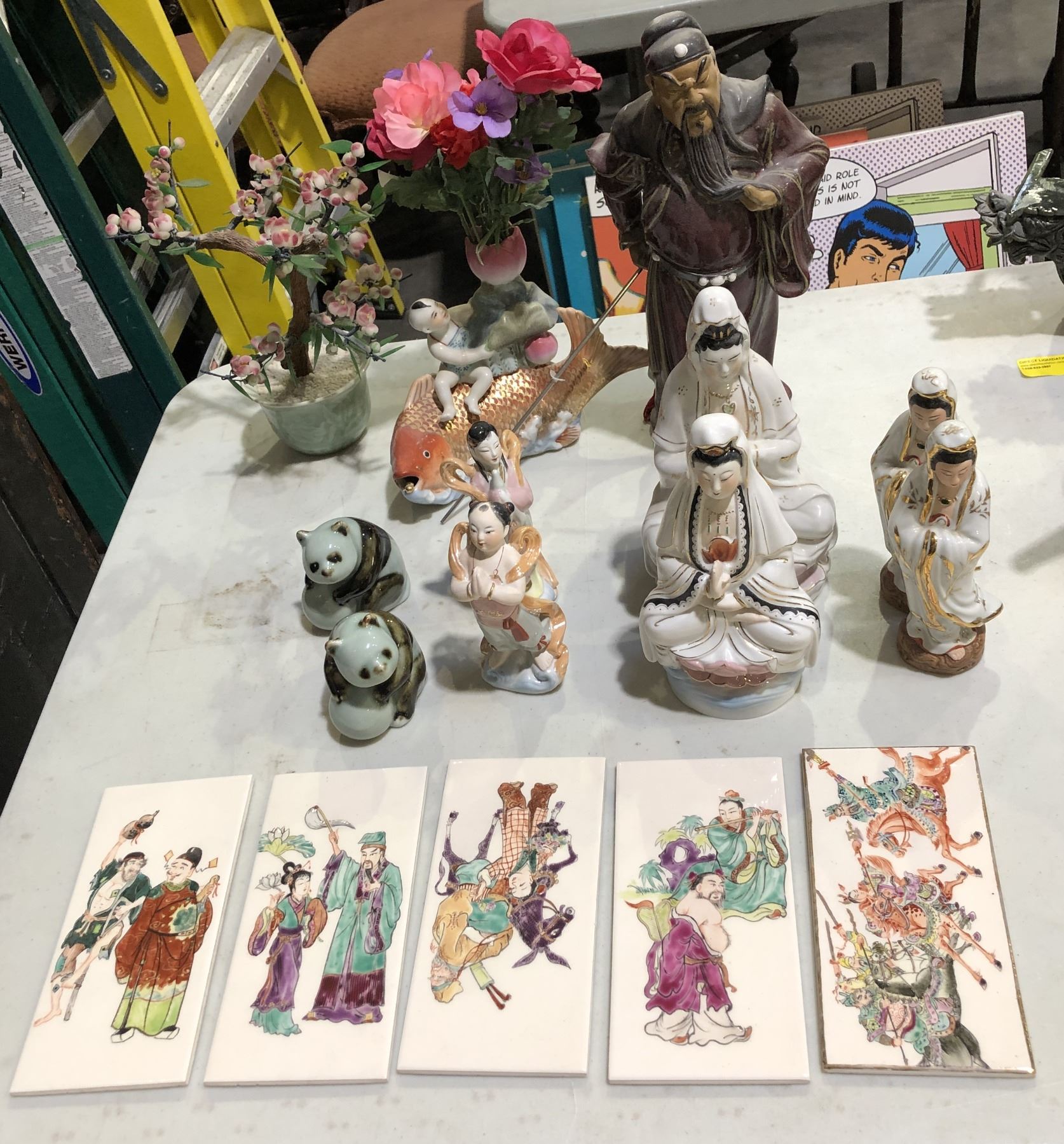 Group of assorted Chinese decor - includes Kwan Kubfg warrior porcelain statue / wooden tile painting etc