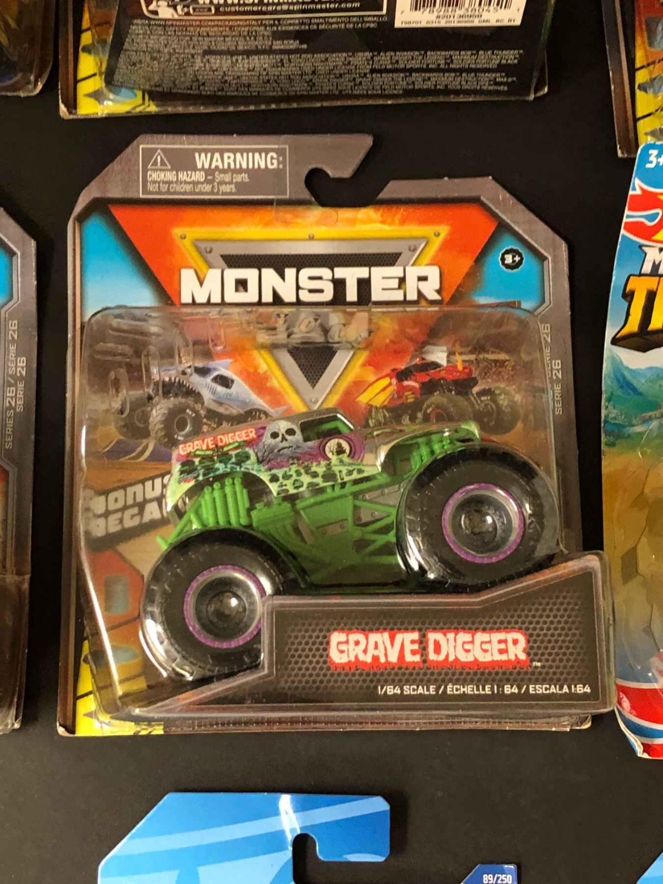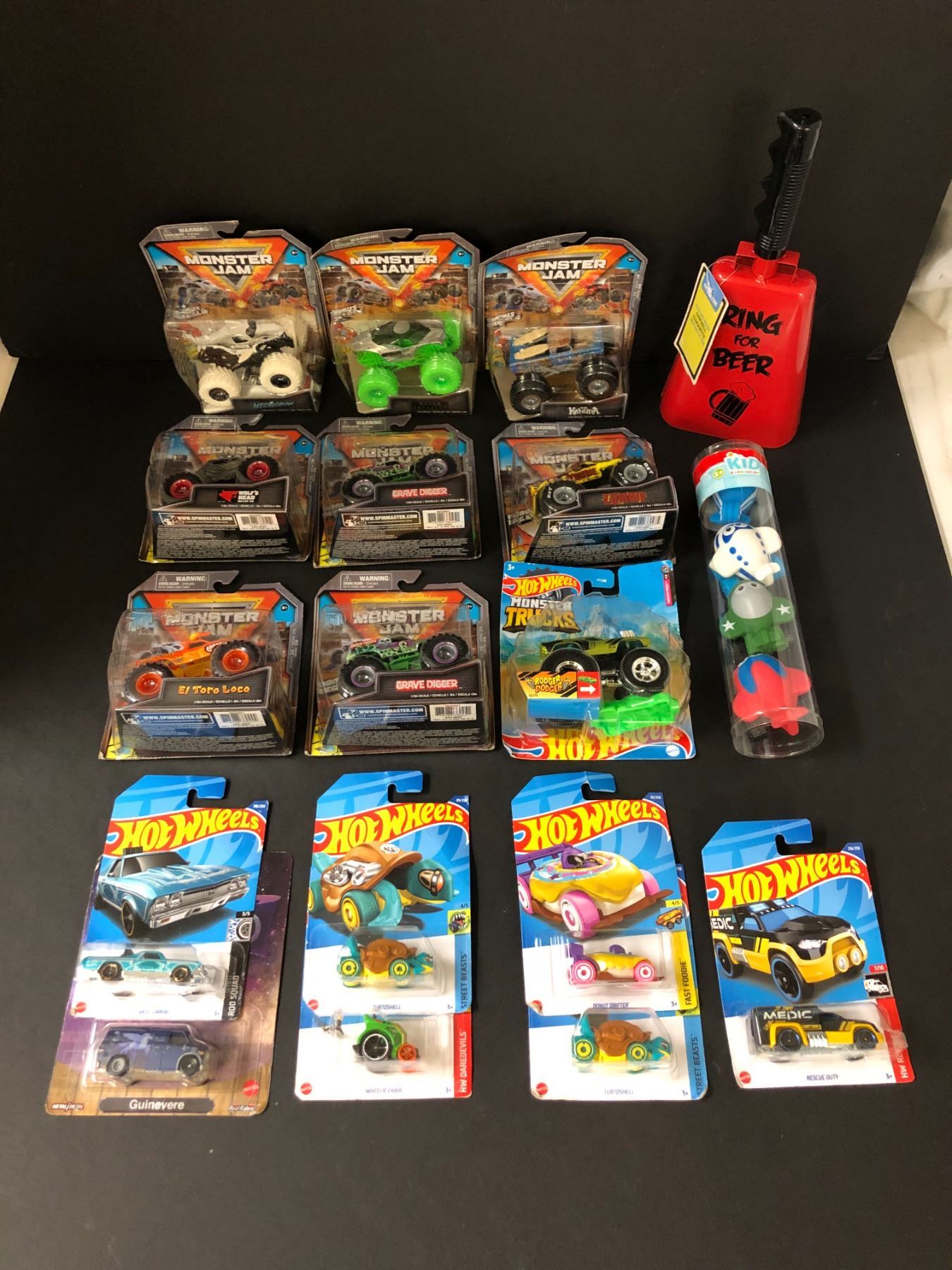 Group of assorted NEW Monster Jams & Hot Wheels cars - approx 16 & a (Ring For Beer) cowbell