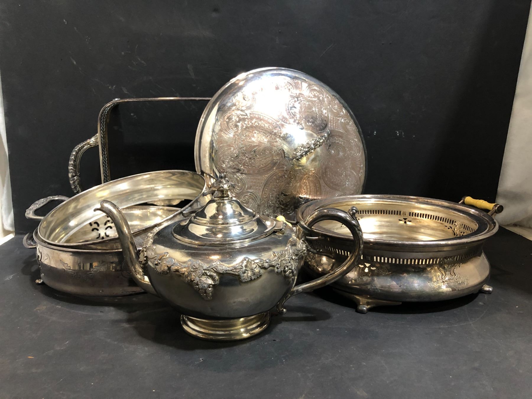 Group of assorted (Silver / Plated) serving dishes - includes Birks sterling plate / Meridens Co Hamilton Canada 094 silver buffet server warmer / Victorian Plate silver teapot / silverware SP 670 etc