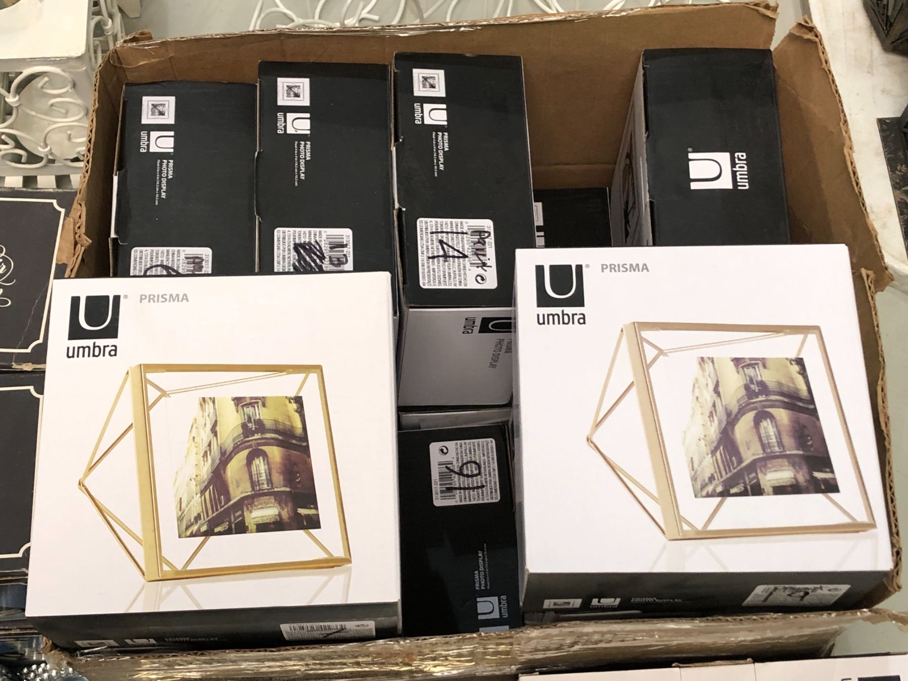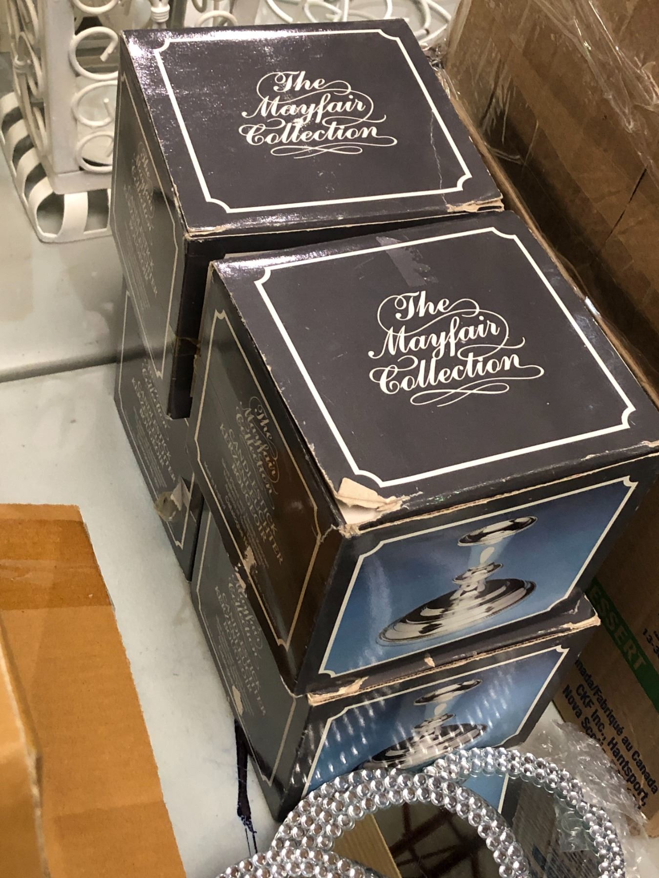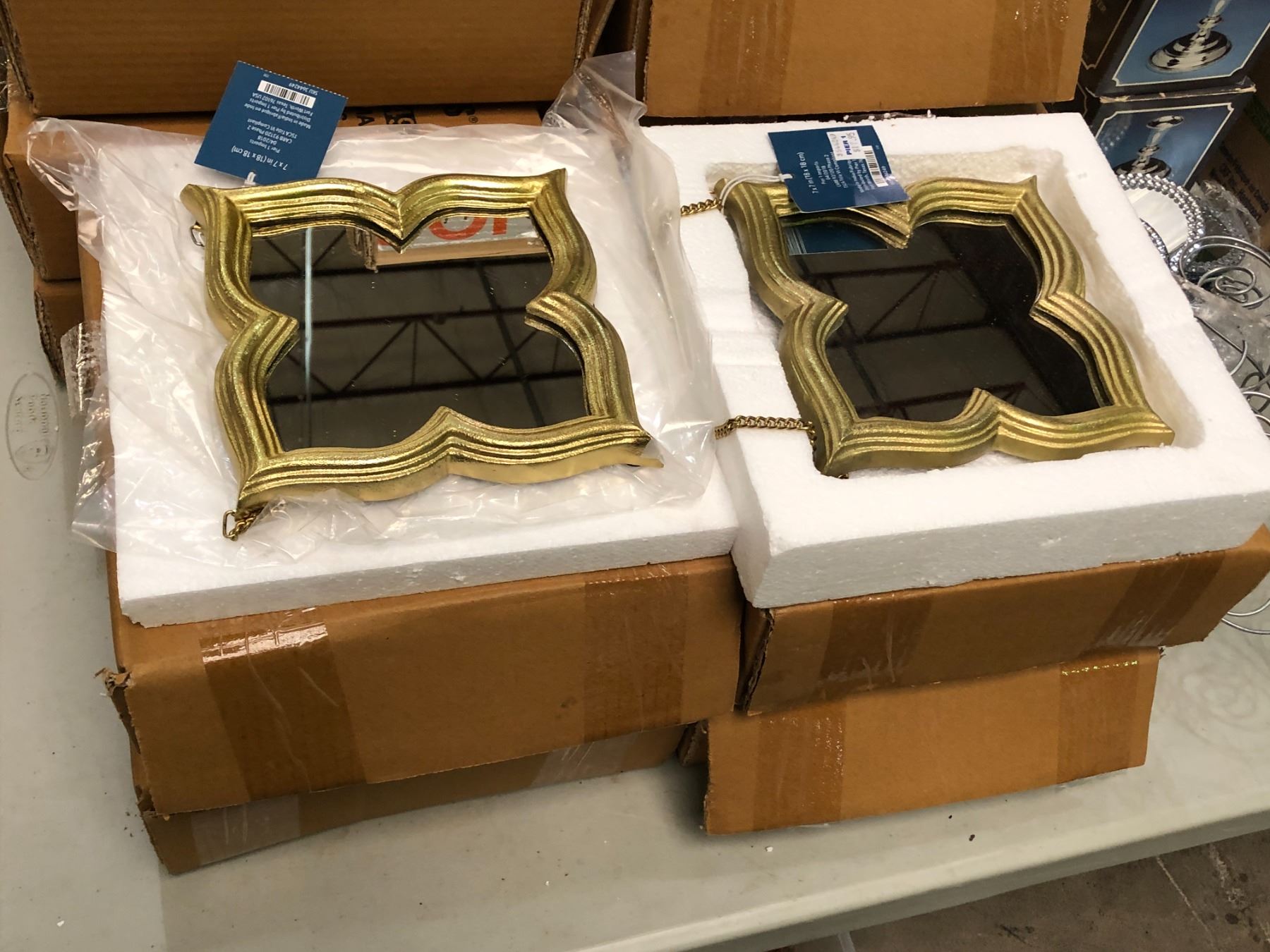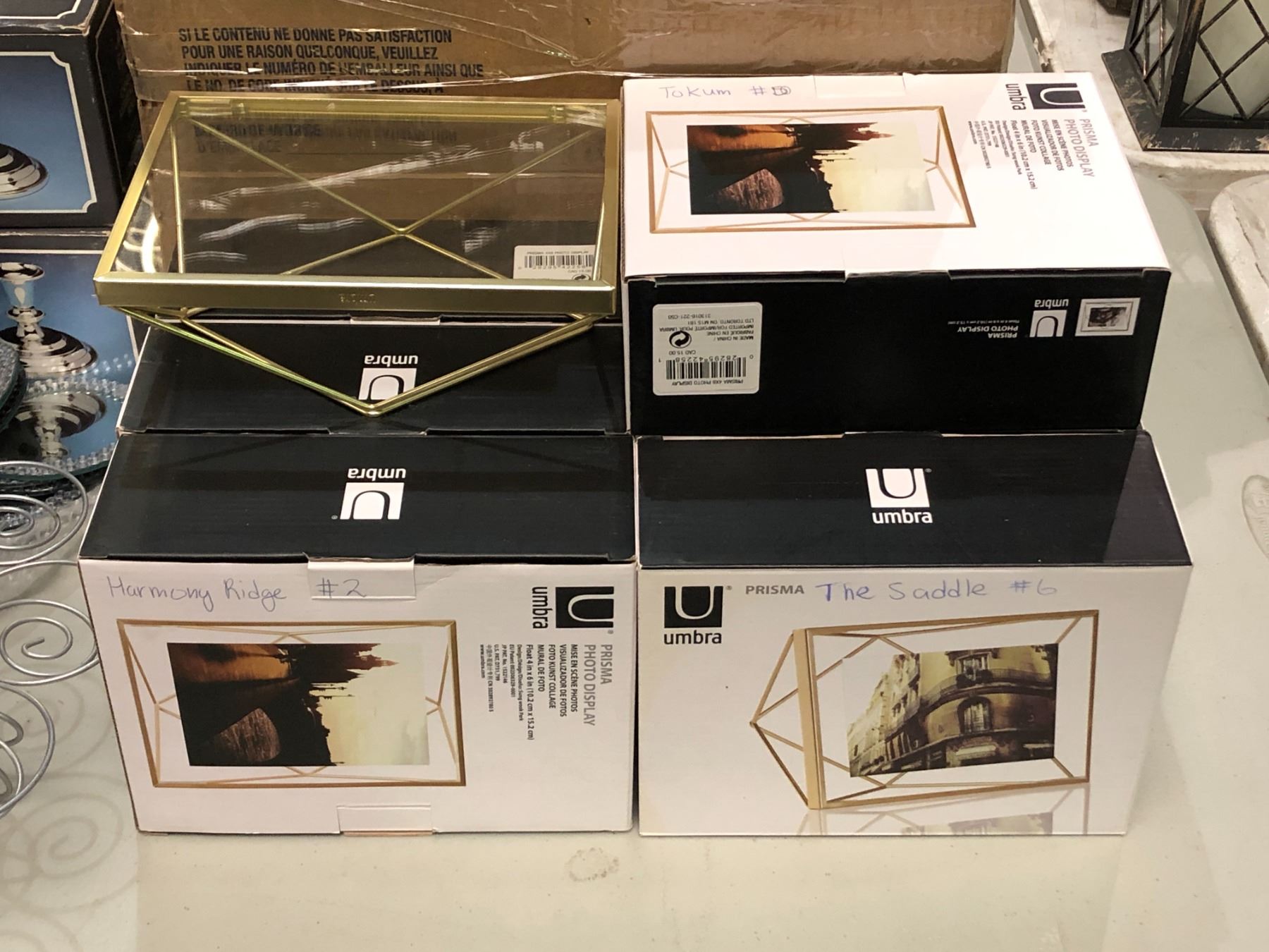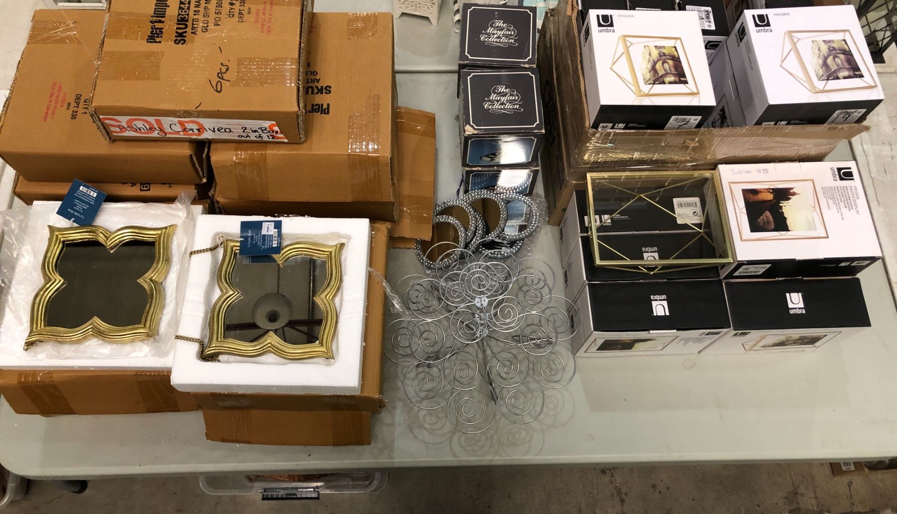 Group of assorted decor items including - Umbra Prisma glass photo display, 7x7in Gold mirrors, Silver candlestick holders, etc...