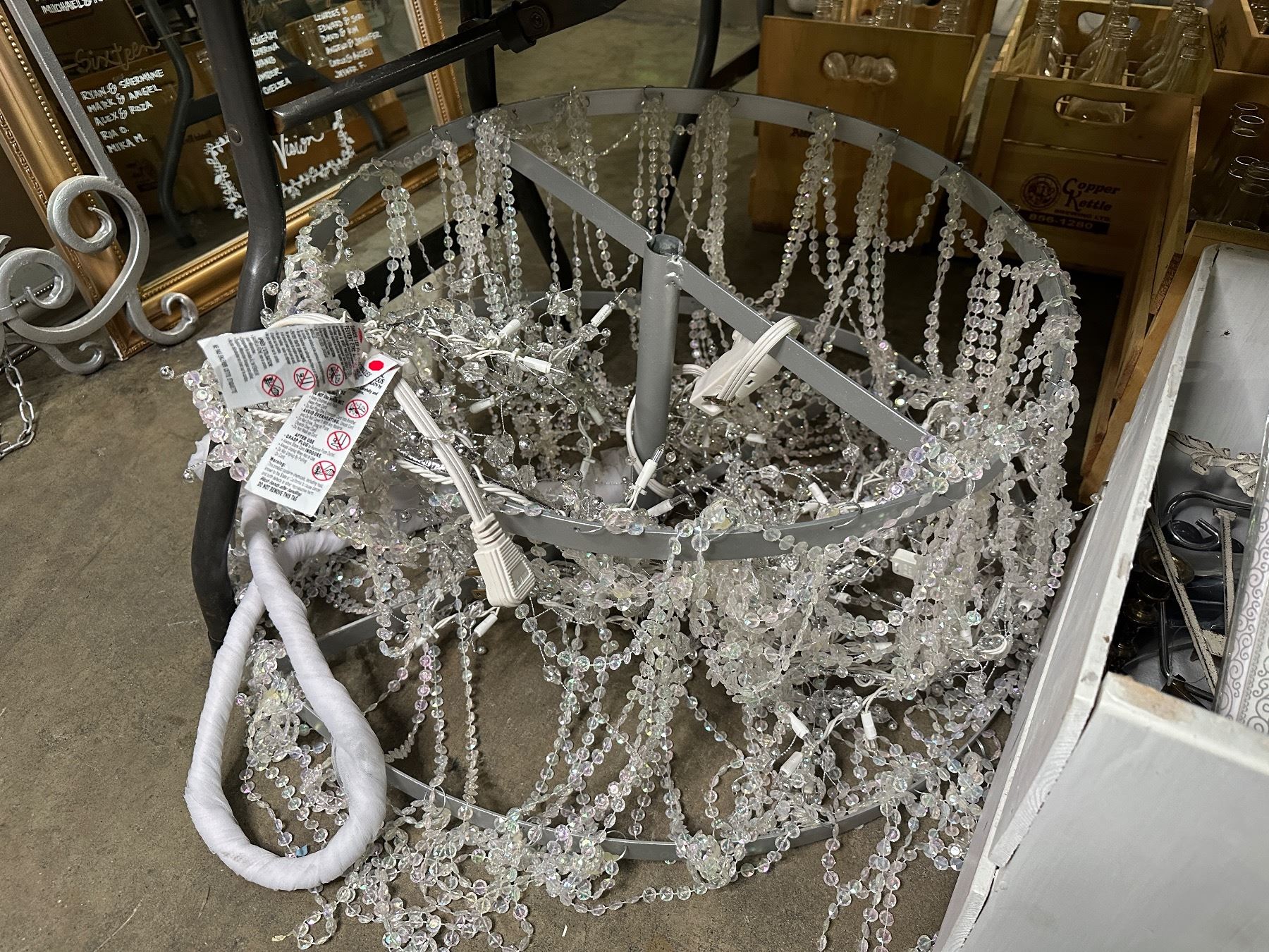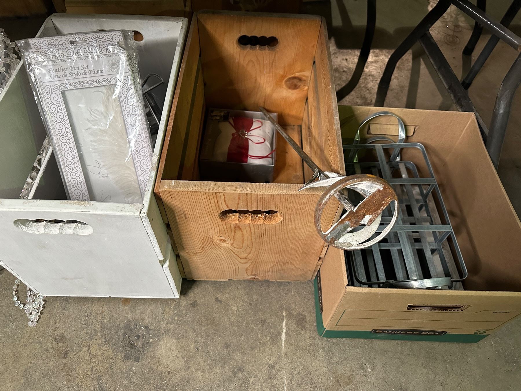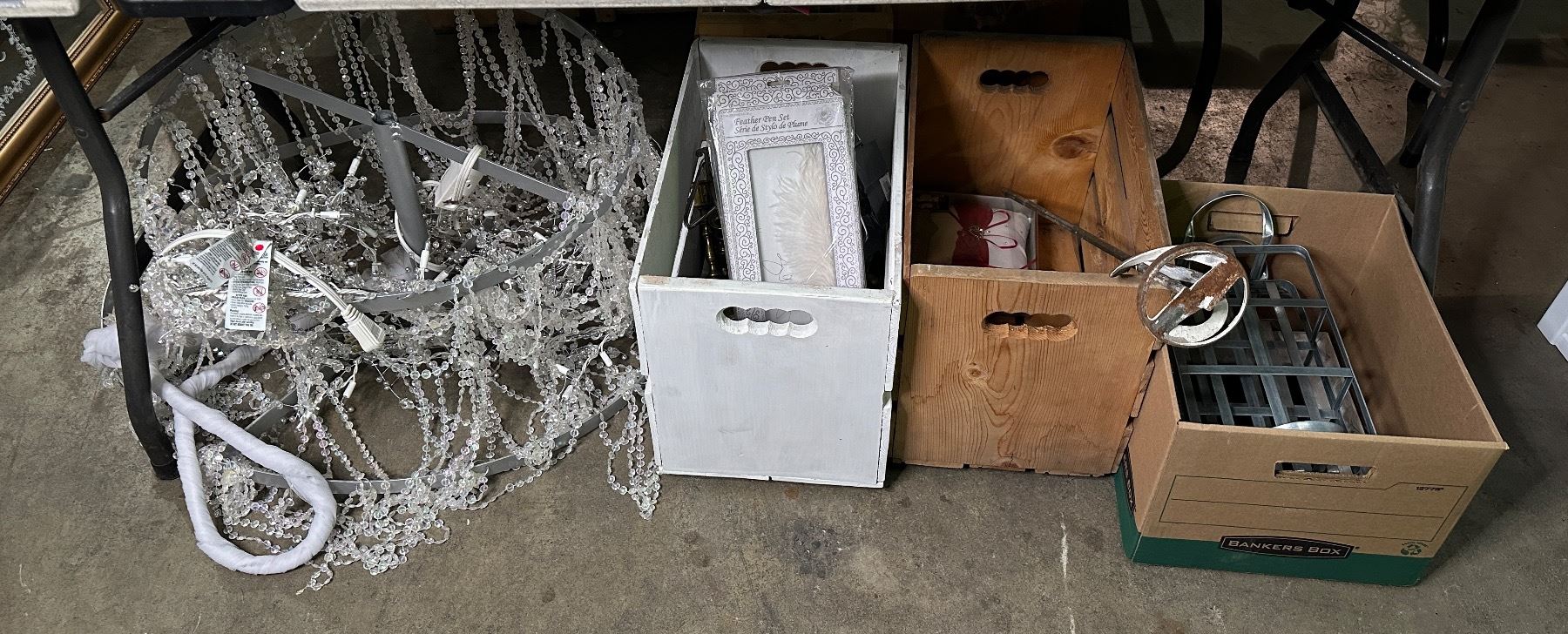 Group of assorted decor items including - chandeliers, candle stick holders, wood crates, etc...