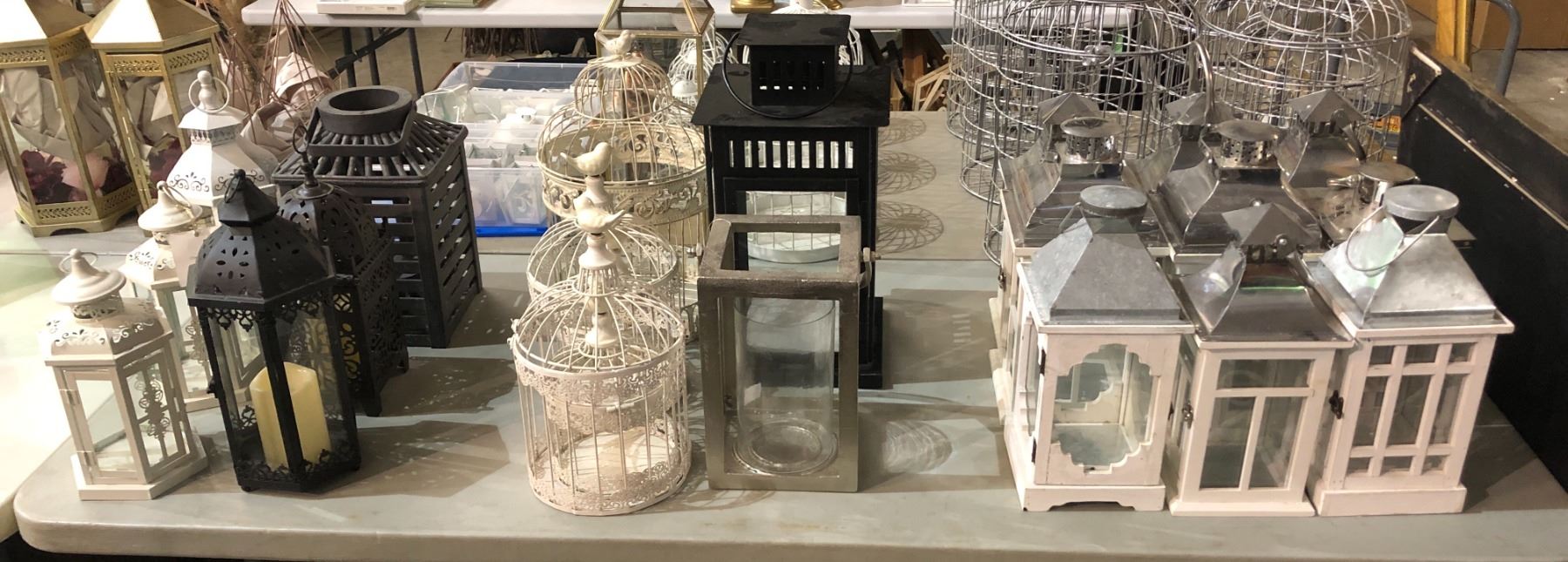 Group of assorted decor items including - various candle holders, lanterns, bird cage decor, etc...