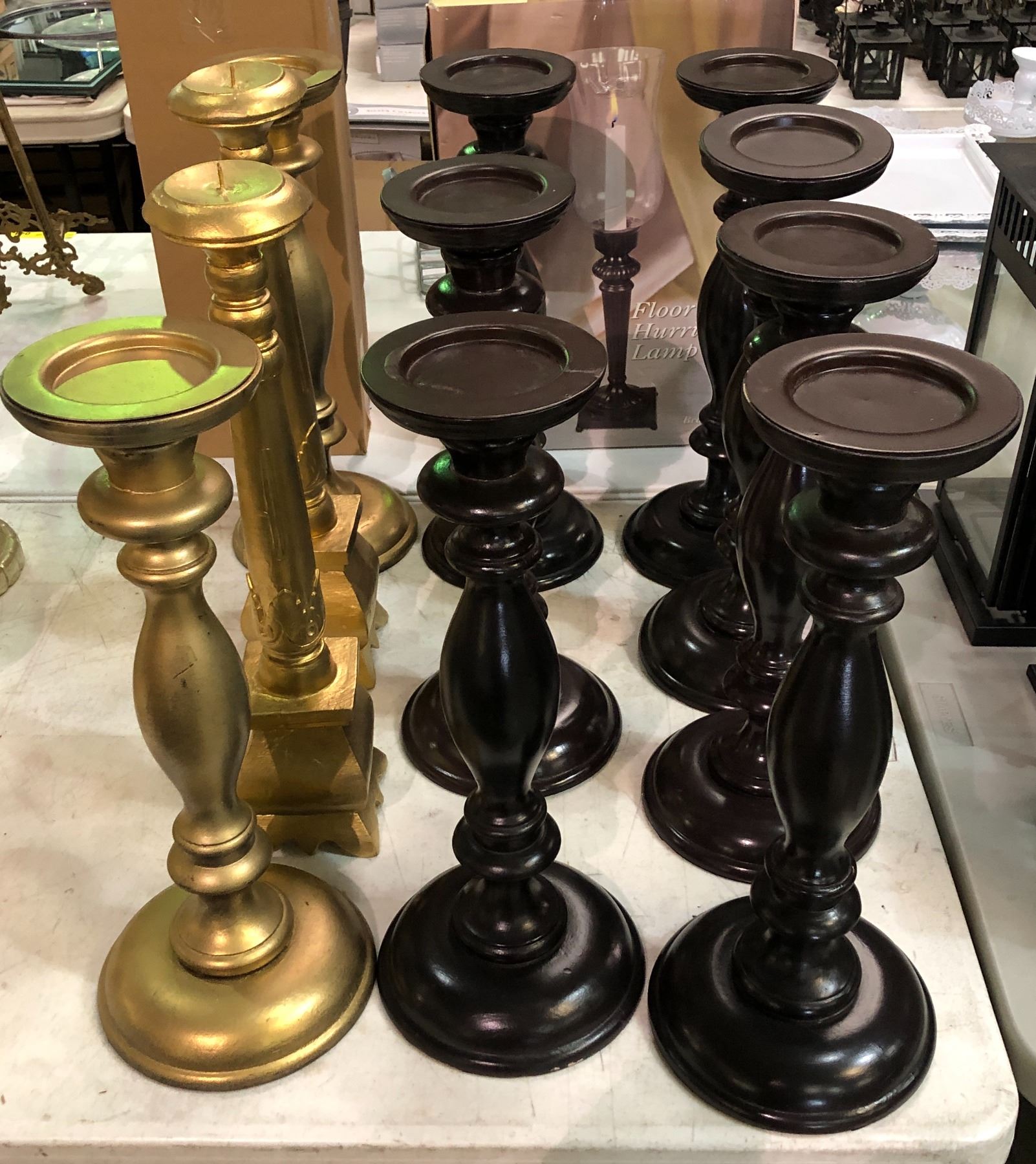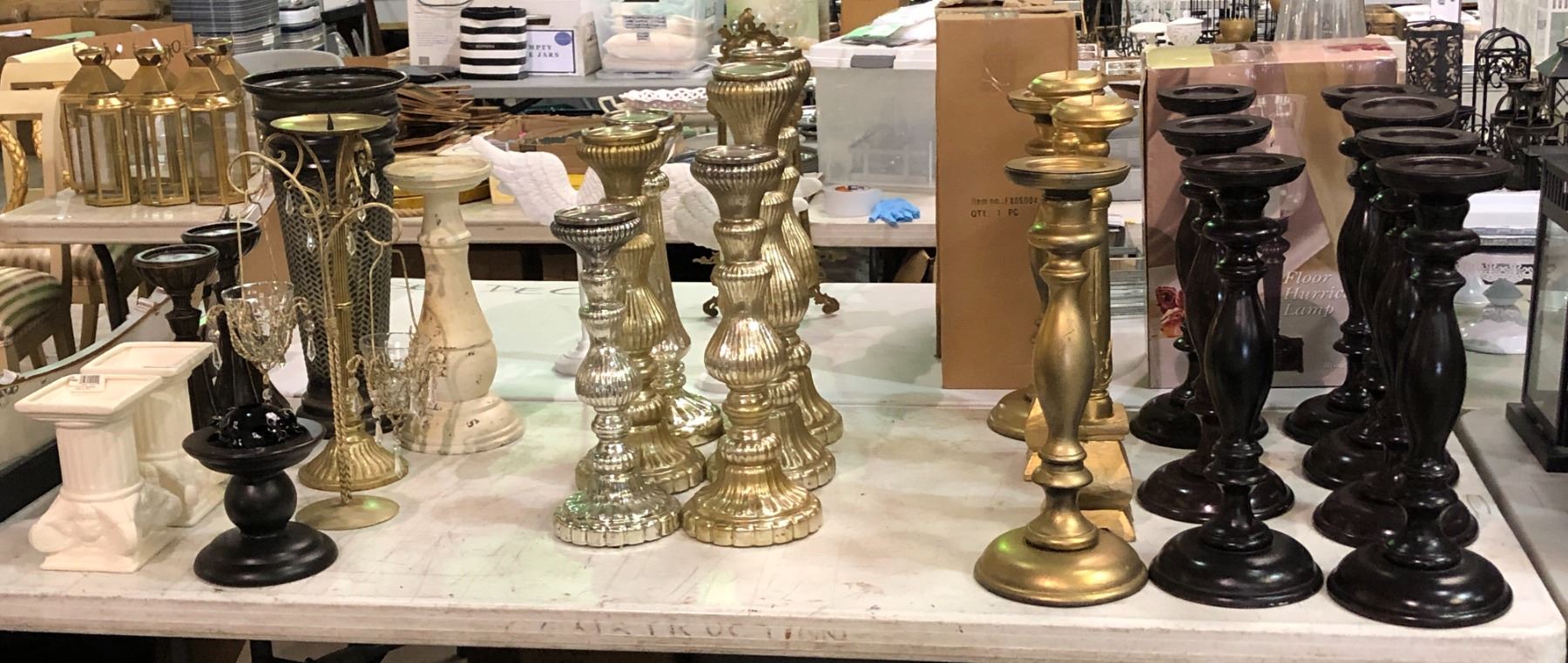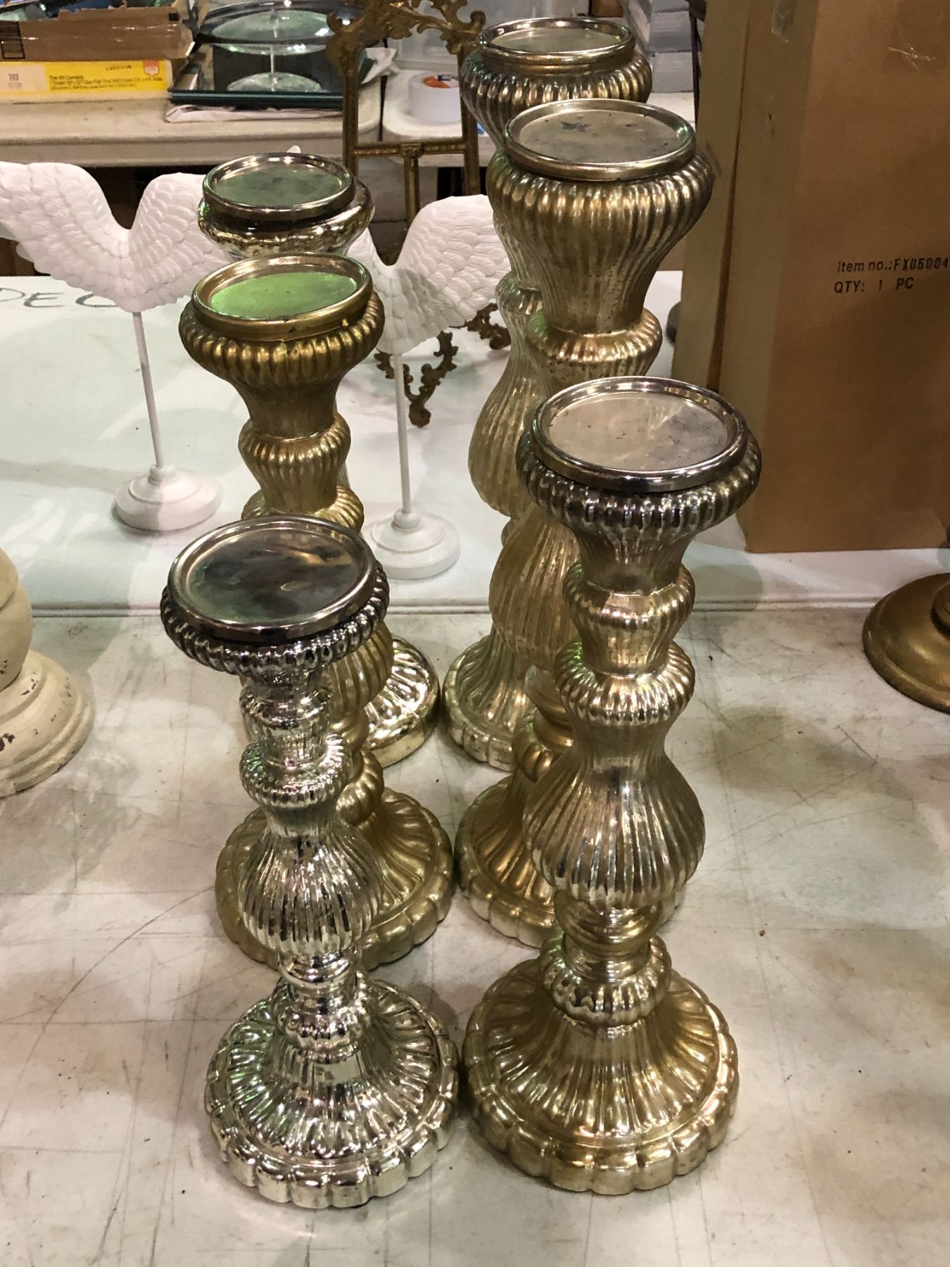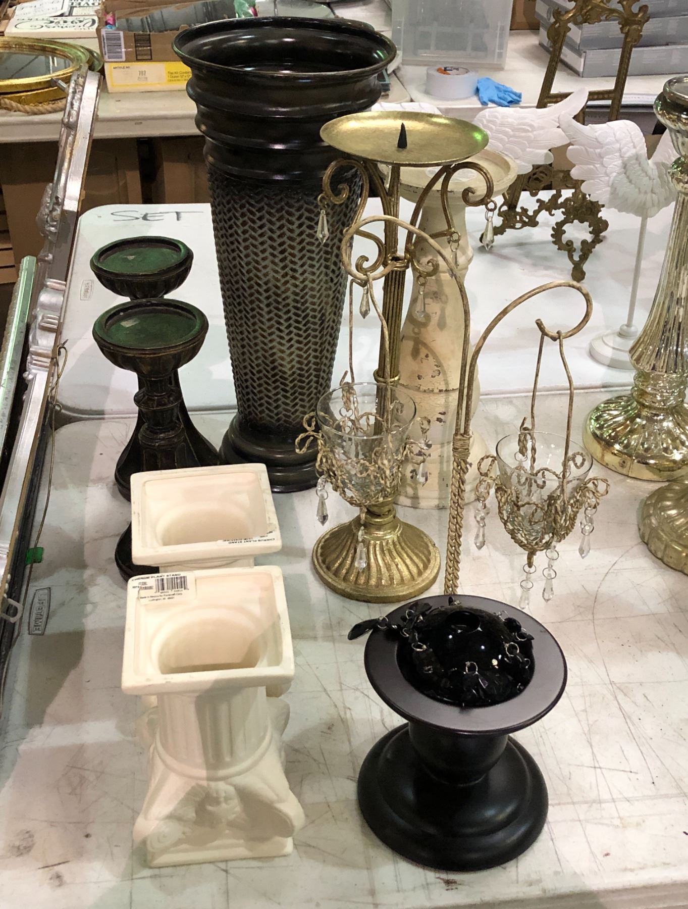 Group of assorted decor items including - various candle stick holders, flower pot, etc...