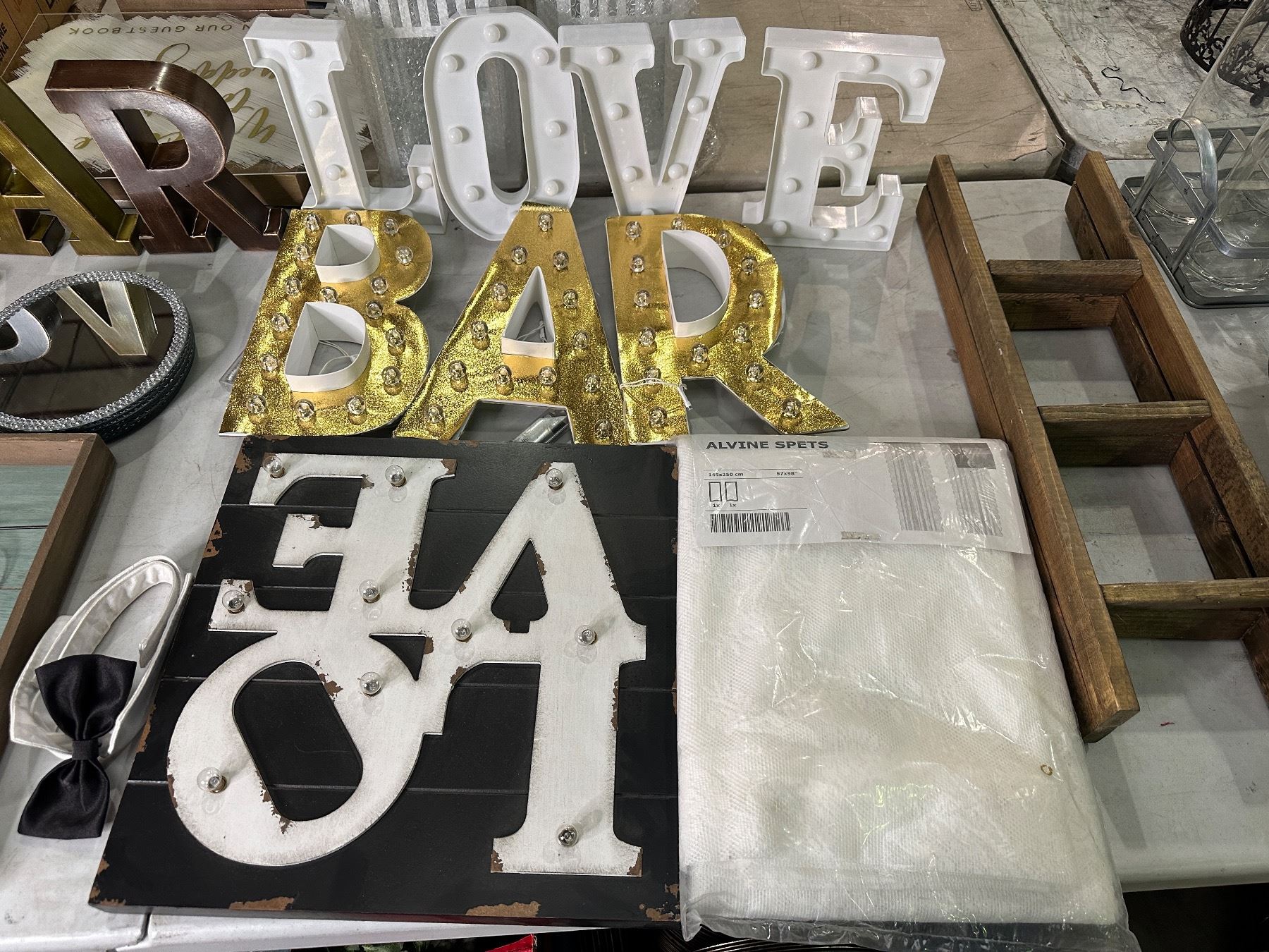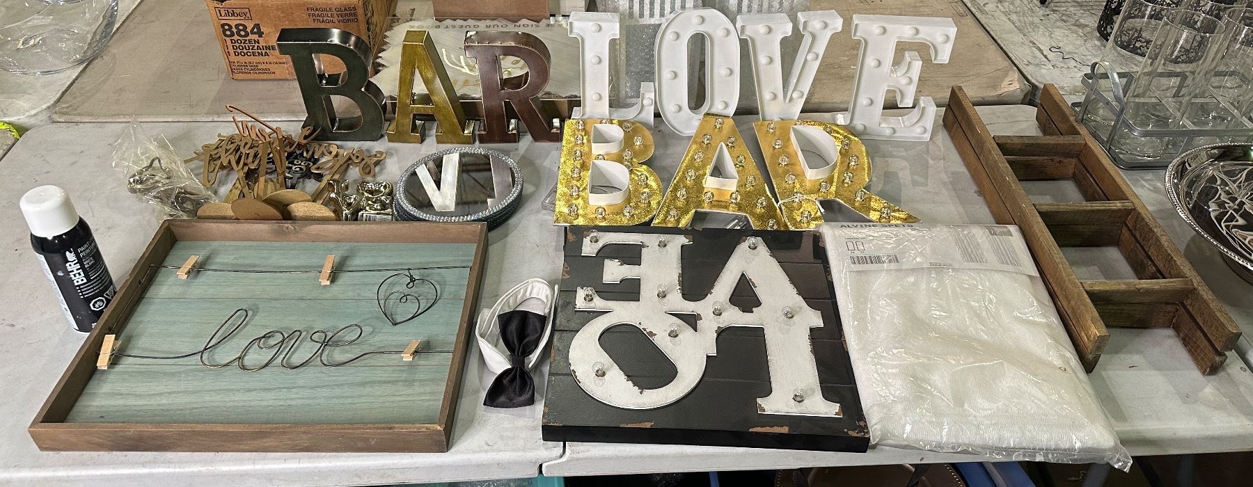 Group of assorted decor items including - various wedding signs; Bar, love, etc...