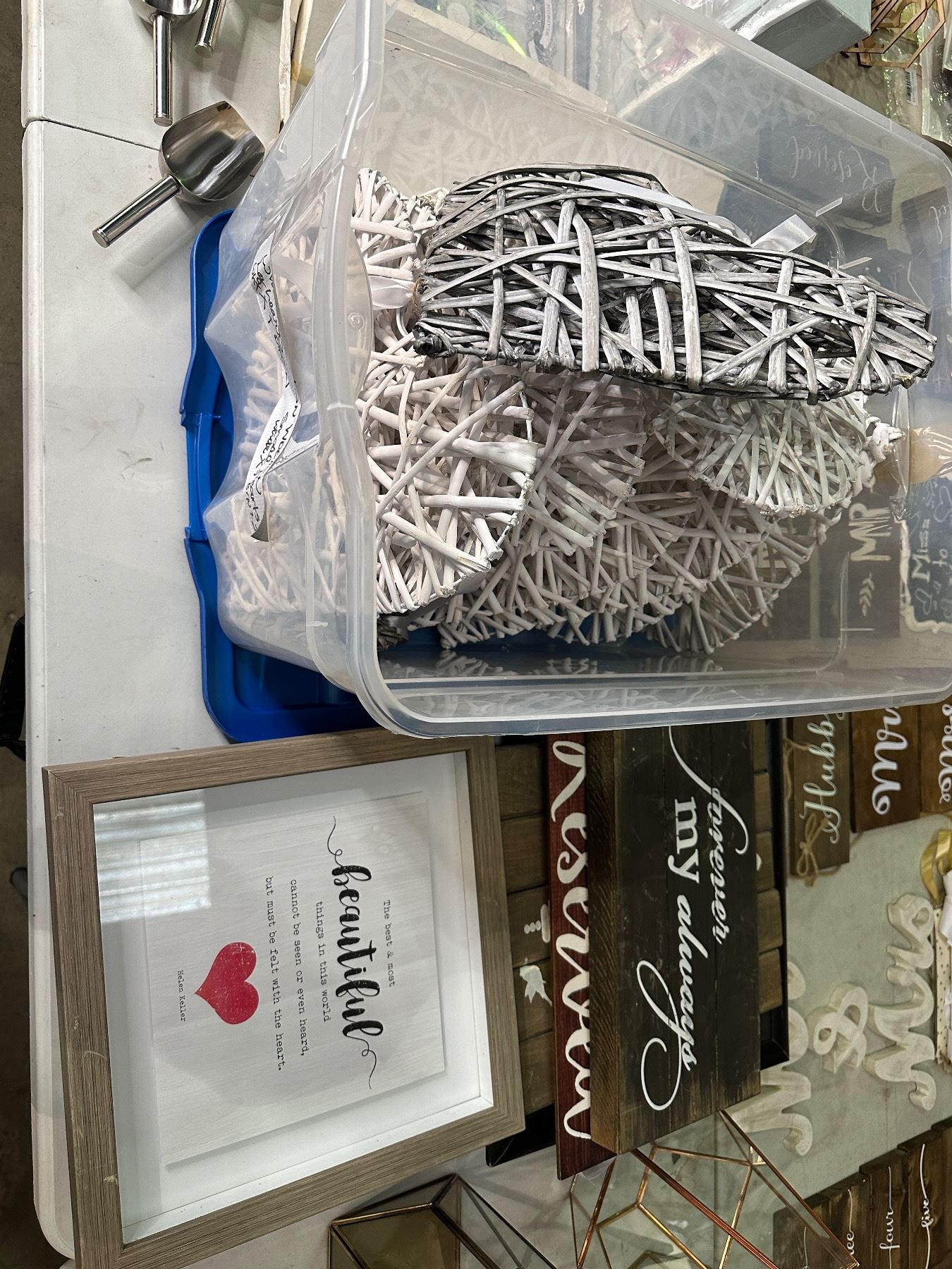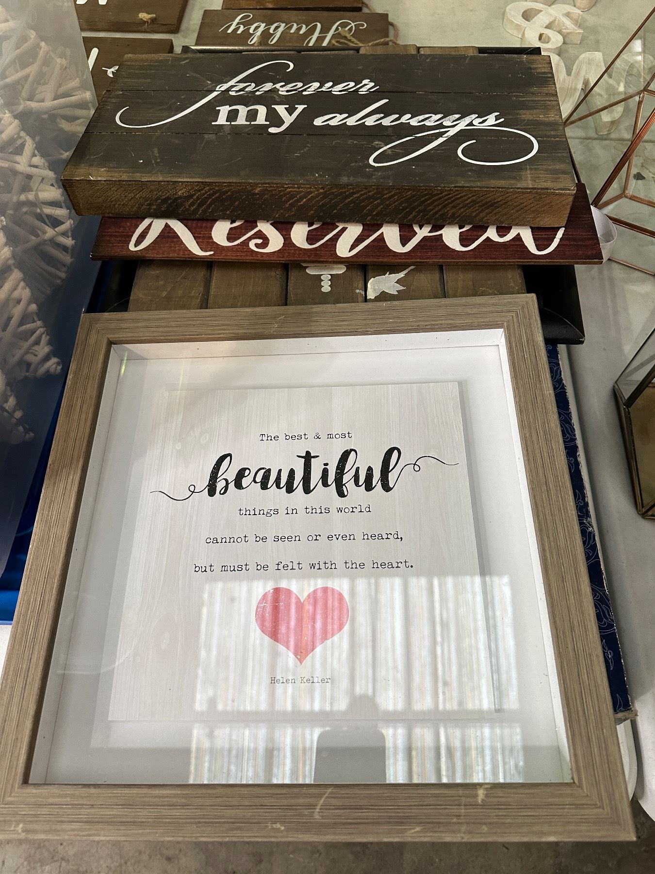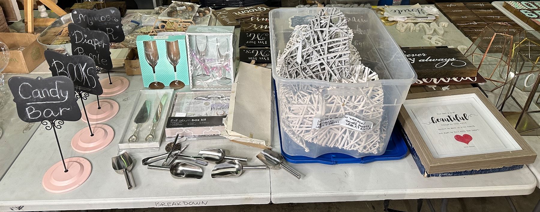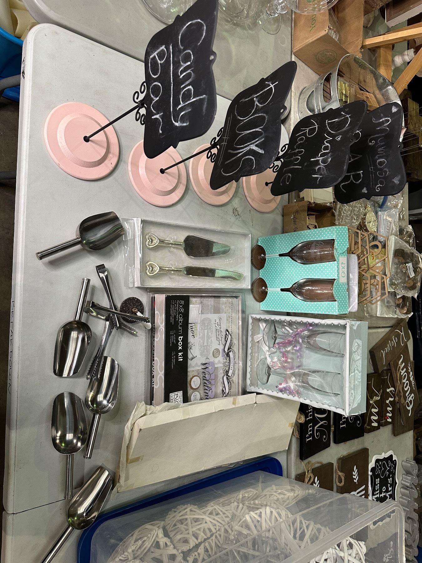 Group of assorted decor items including - wooden hearts, wedding decor signs, champagne glasses, signs, frames, etc...