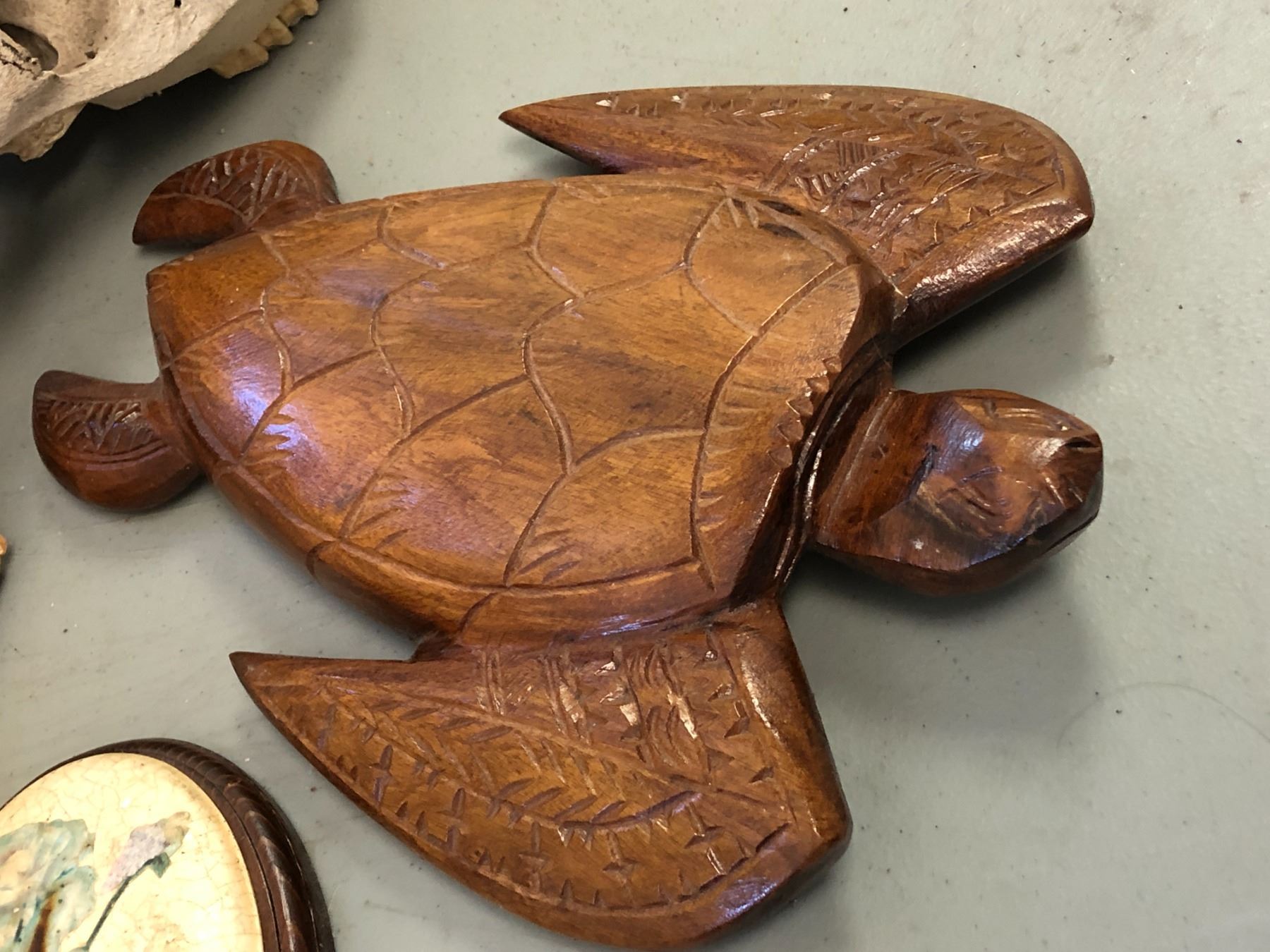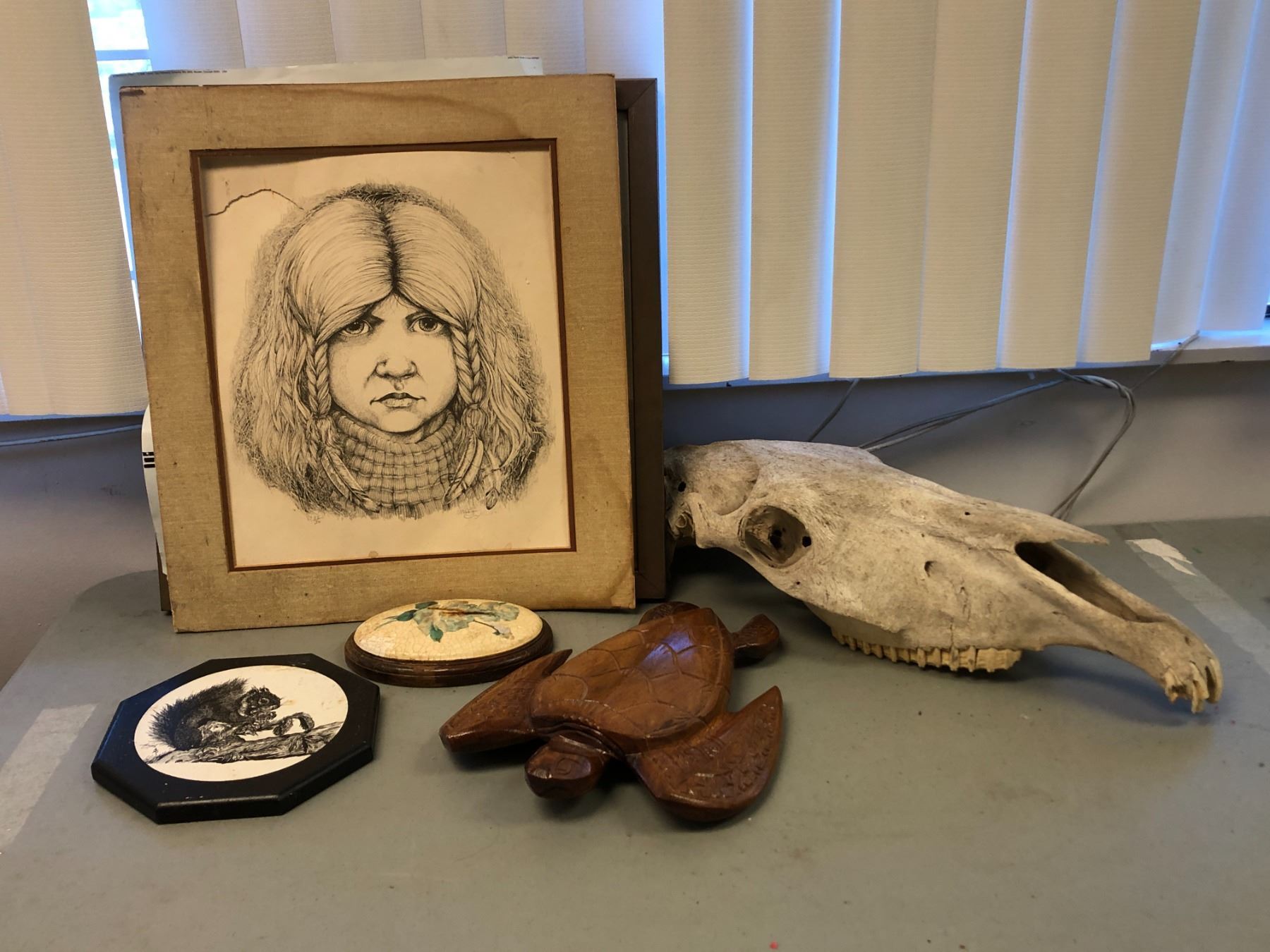 Group of assorted decorative items - includes Rarotonga 2005 wooden sculpture / animal head skull / portraits etc